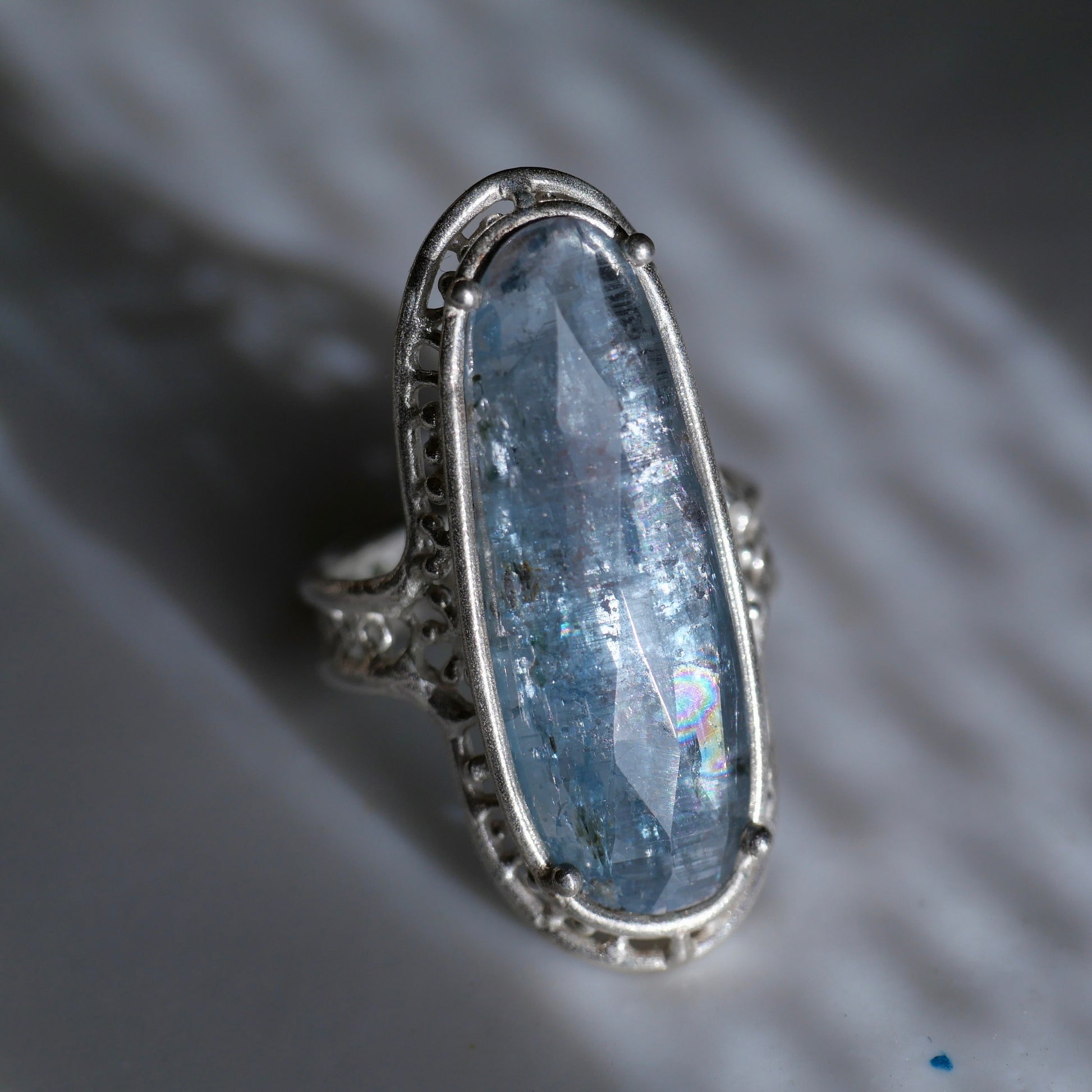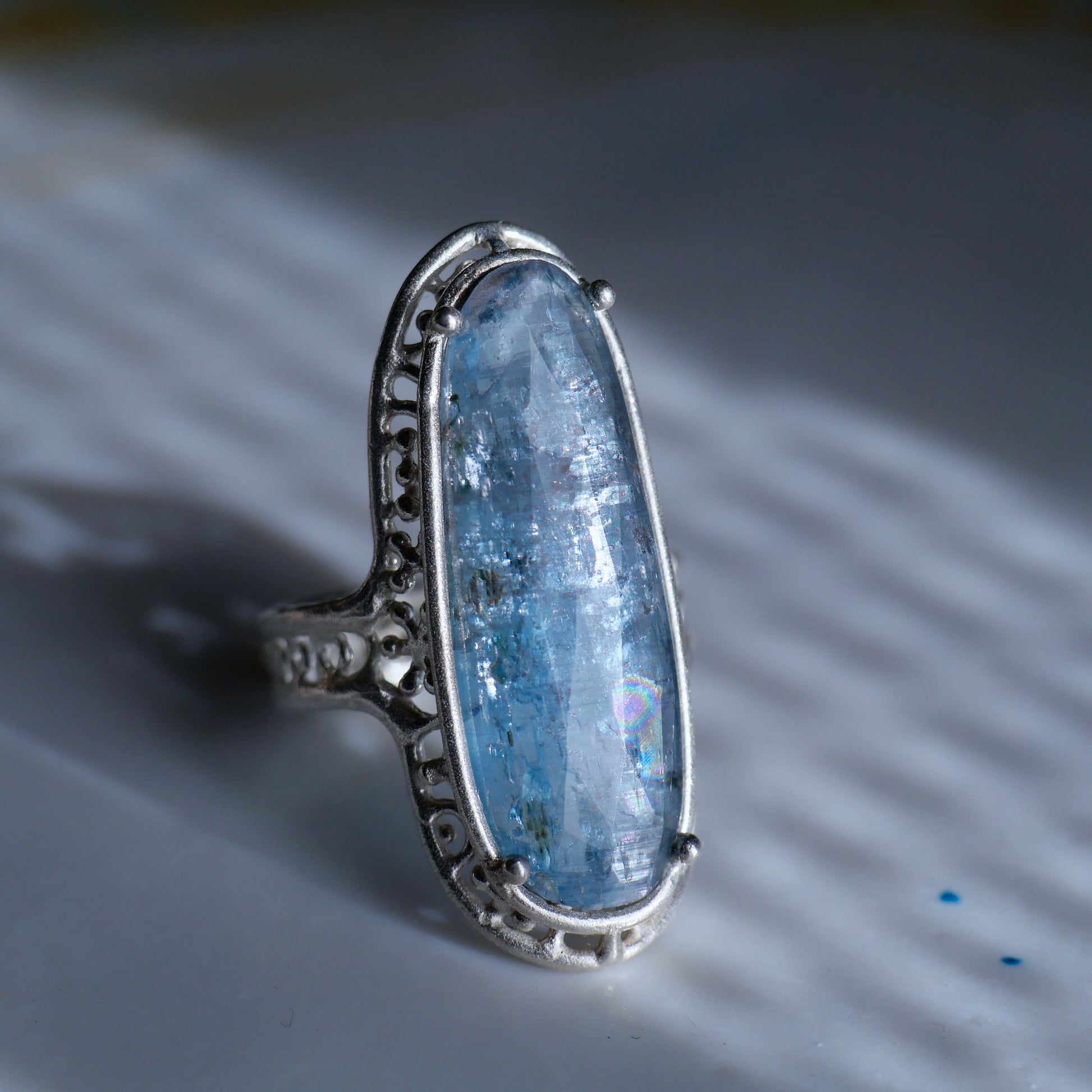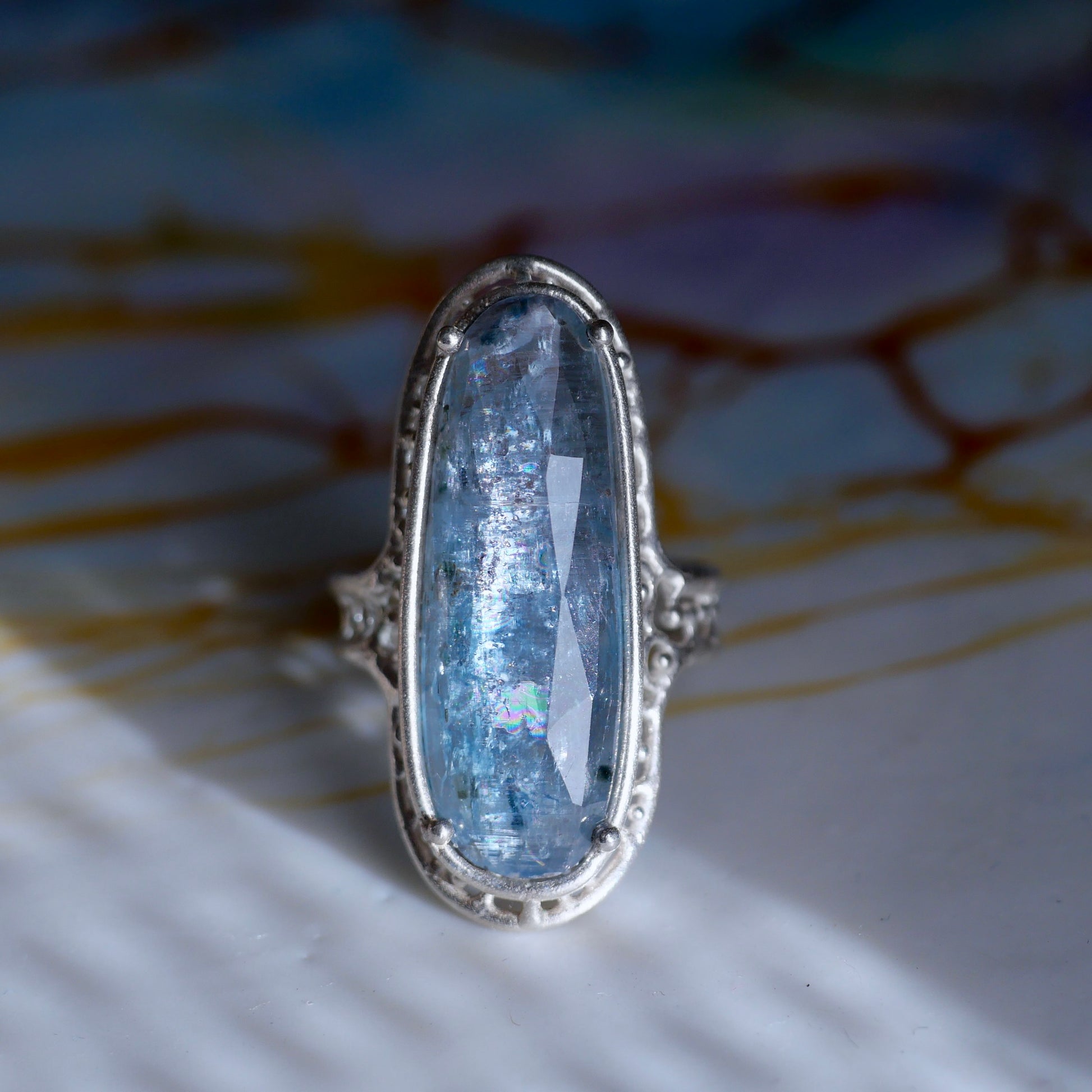 Blueish green kyanite, rainbow glows in the light. Appears green or blue depending on the color of the light. It's very transparent.