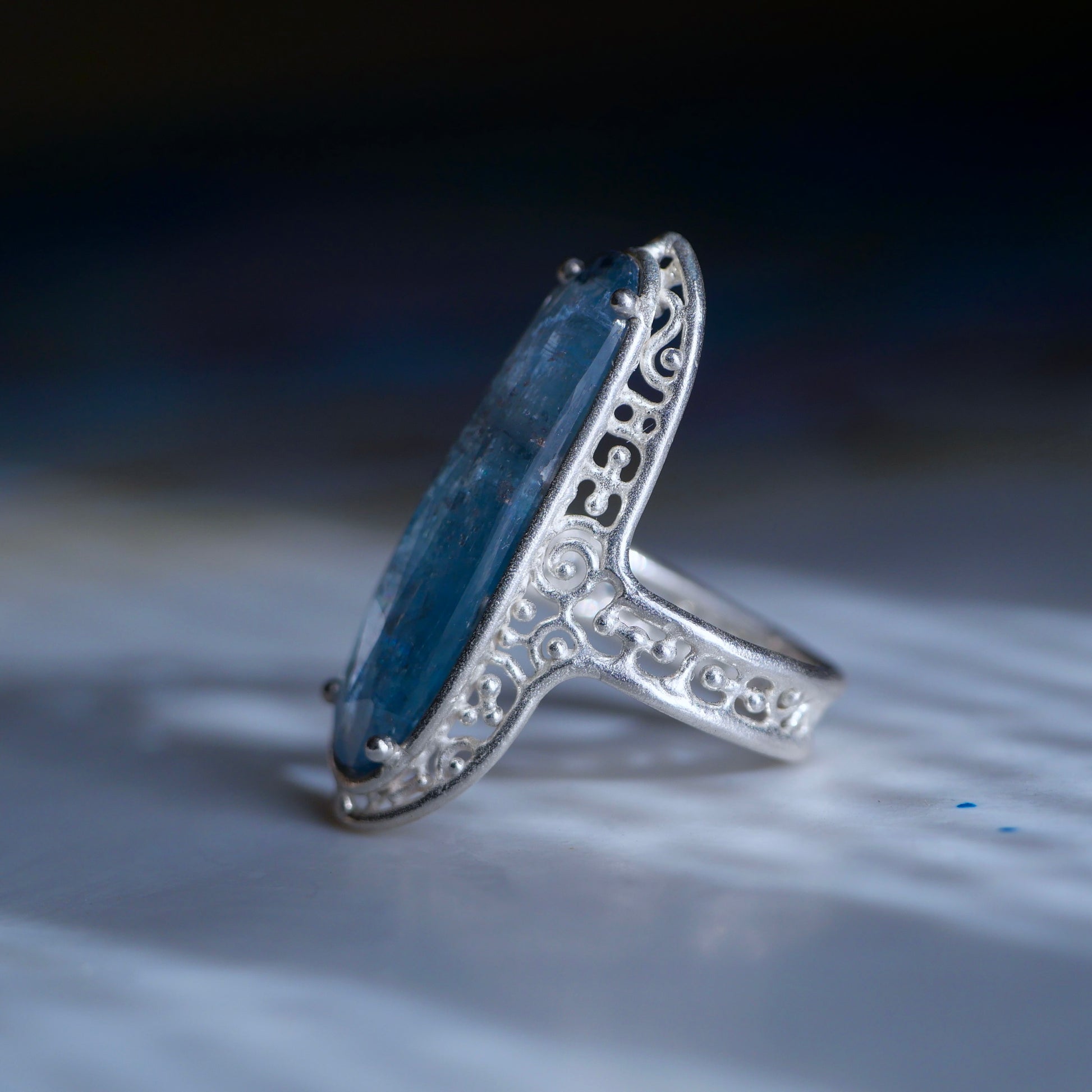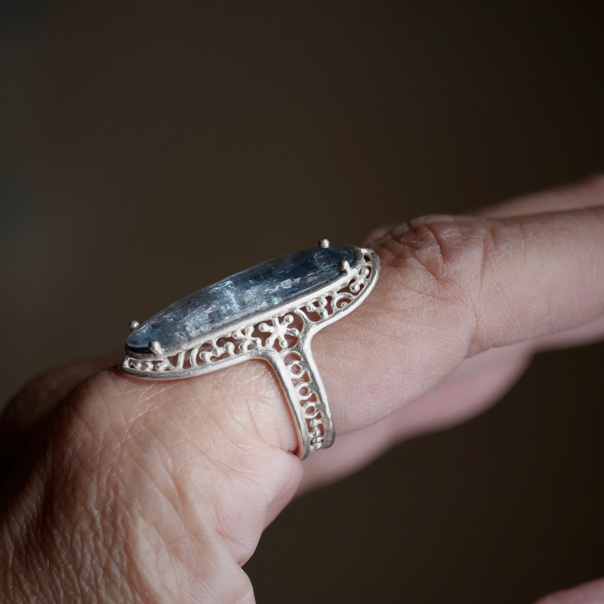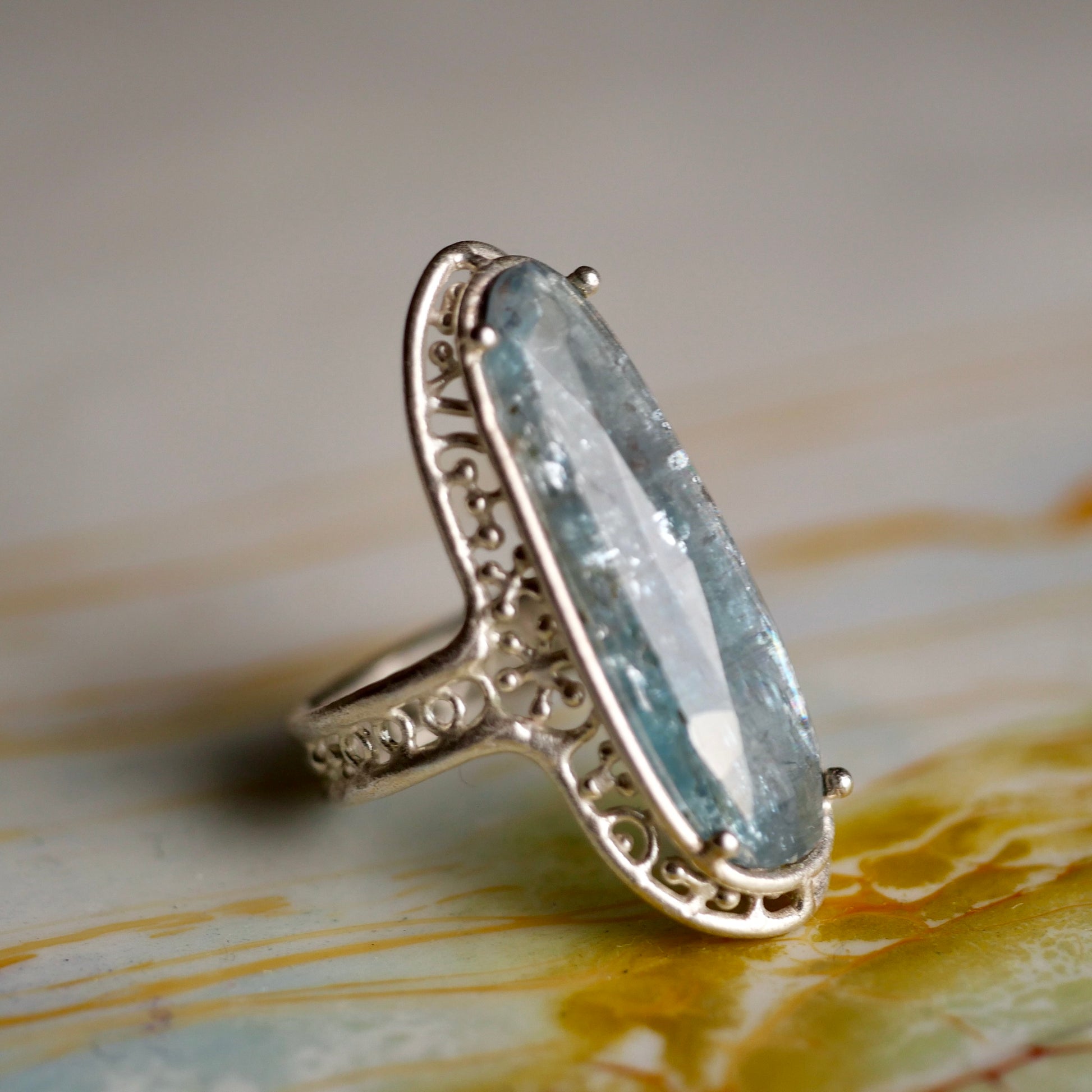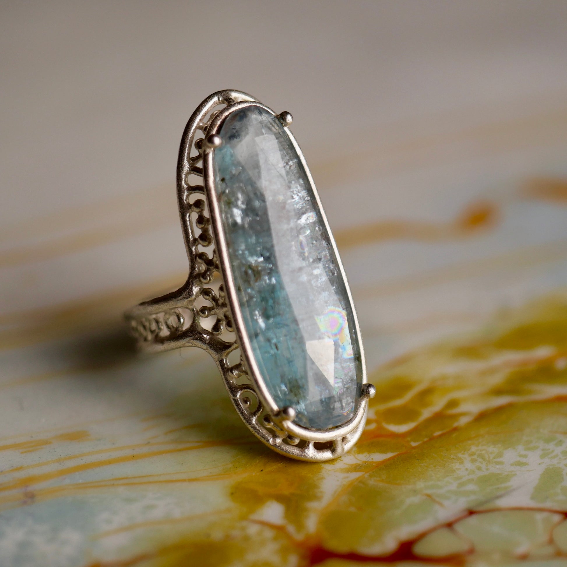 Blueish green kyanite, rainbow glows in the light. Appears green or blue depending on the color of the light. It's very transparent.