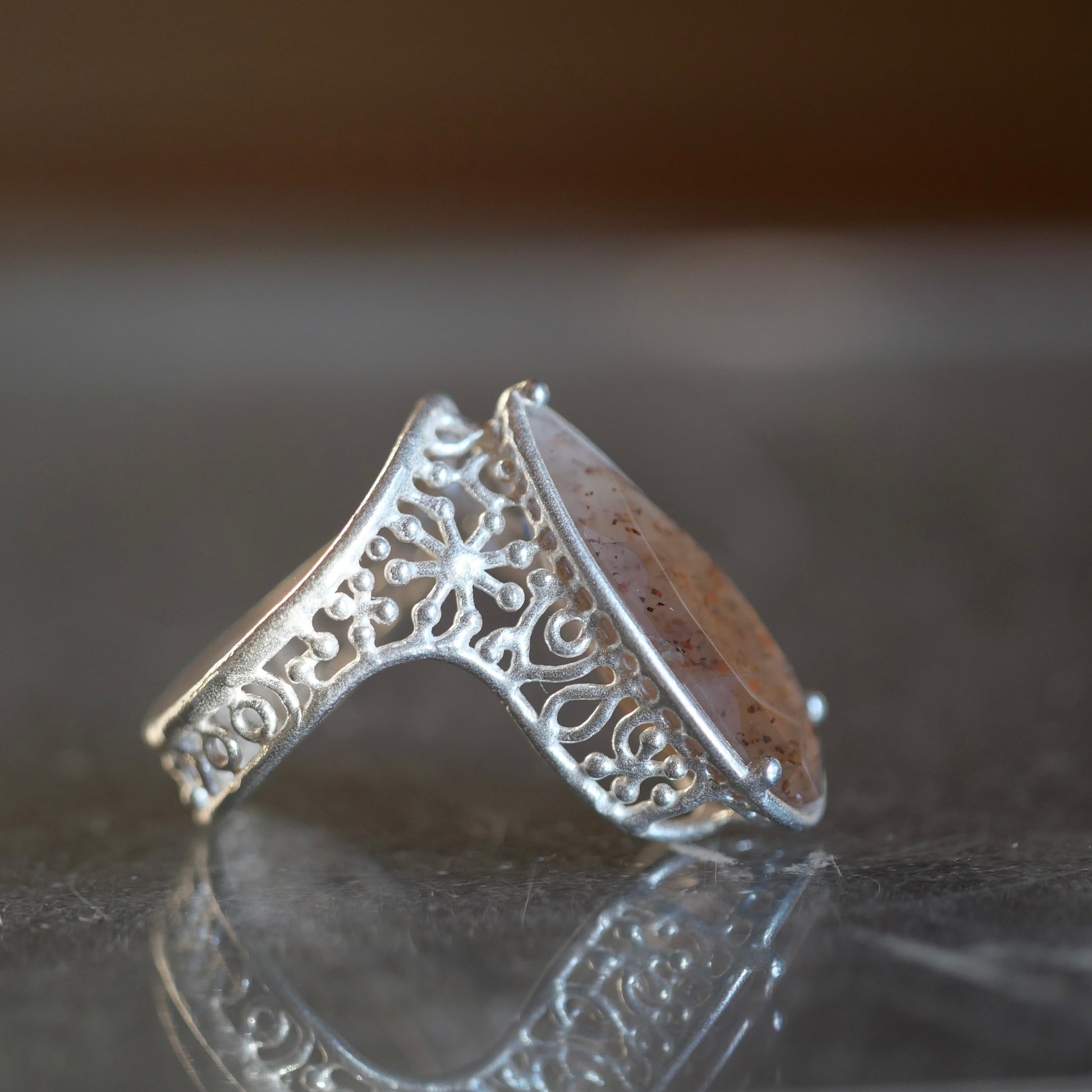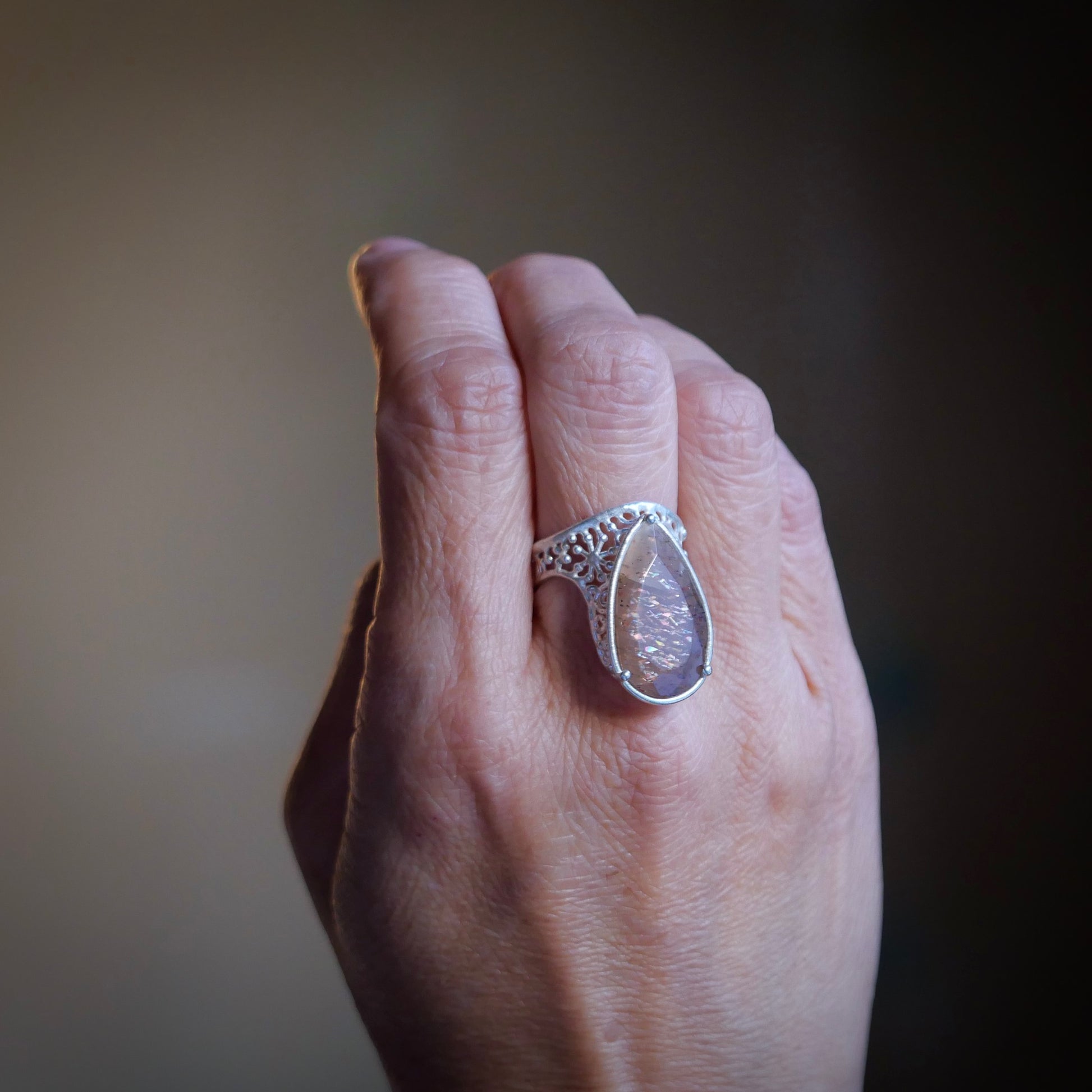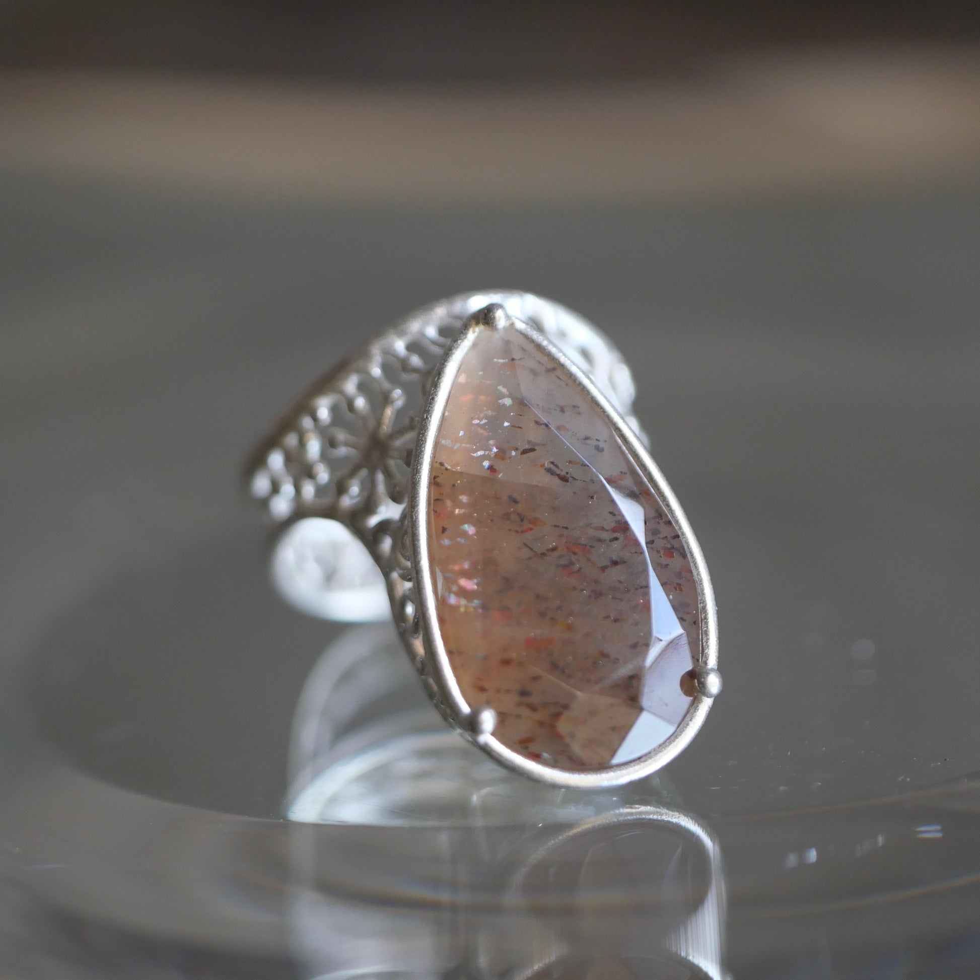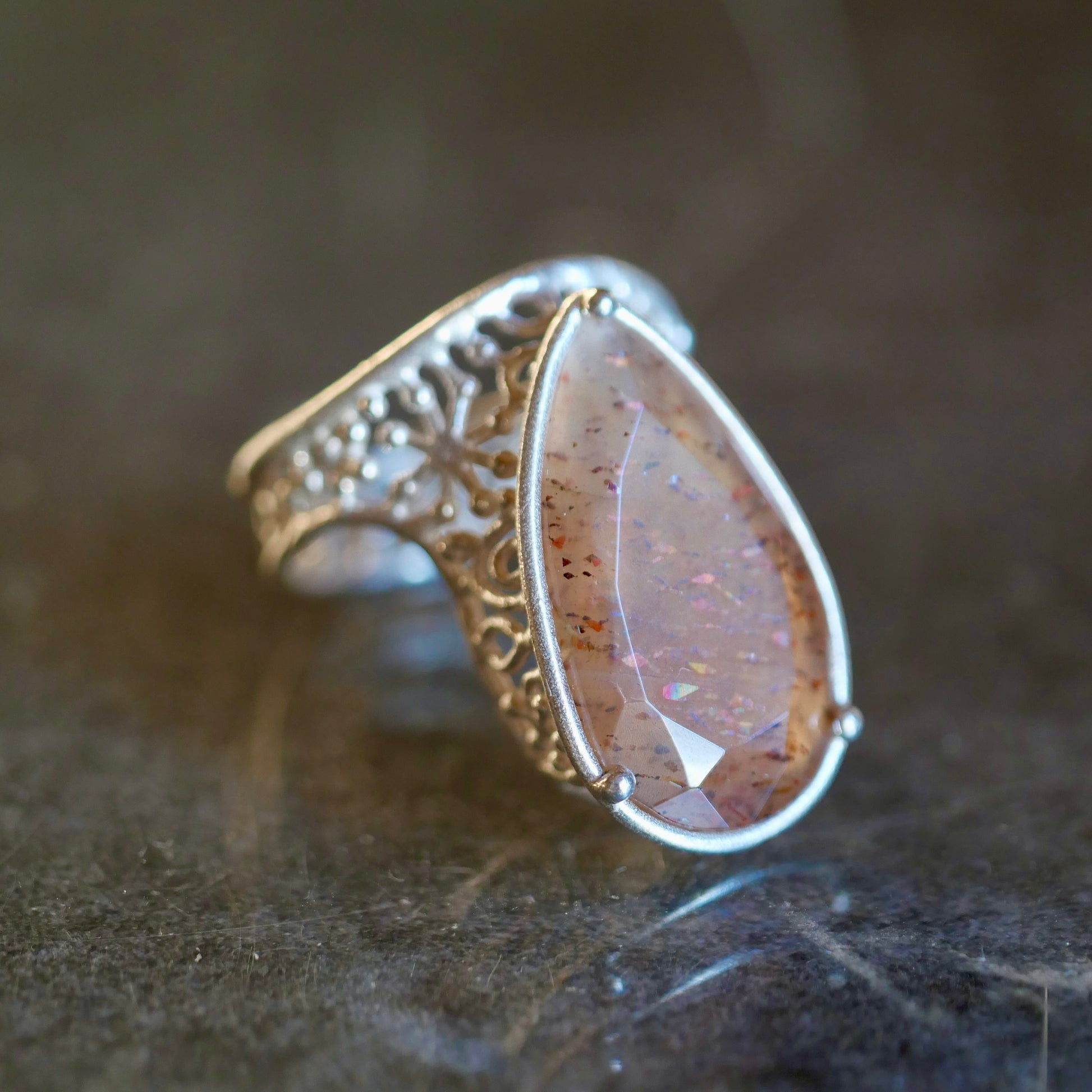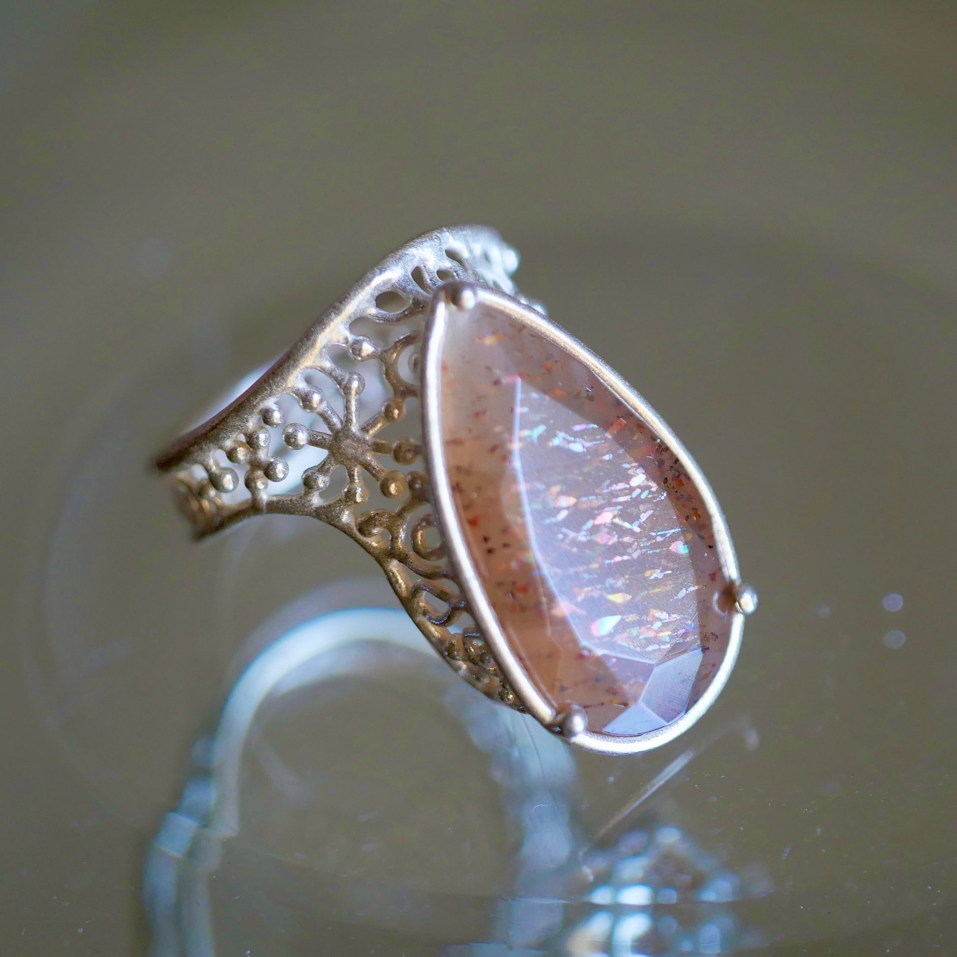 紙吹雪のようなインクルージョンが虹色に光ることからConfetti (紙吹雪)Sunstoneと呼ばれています。光があたるたびに光が走るようにきらめきしています。