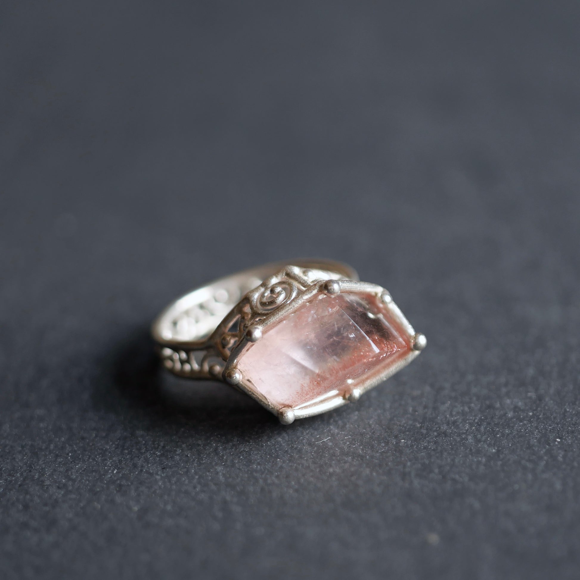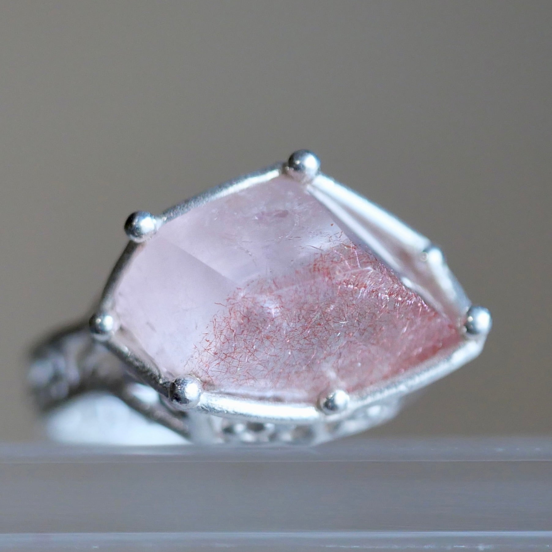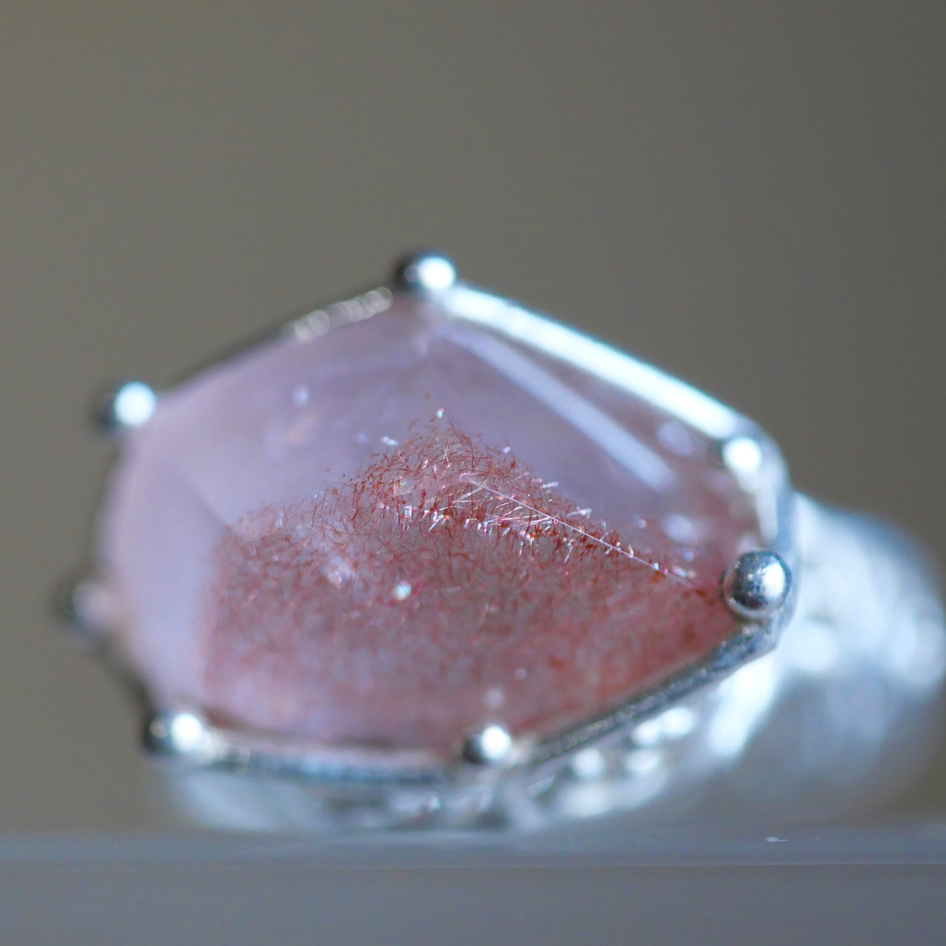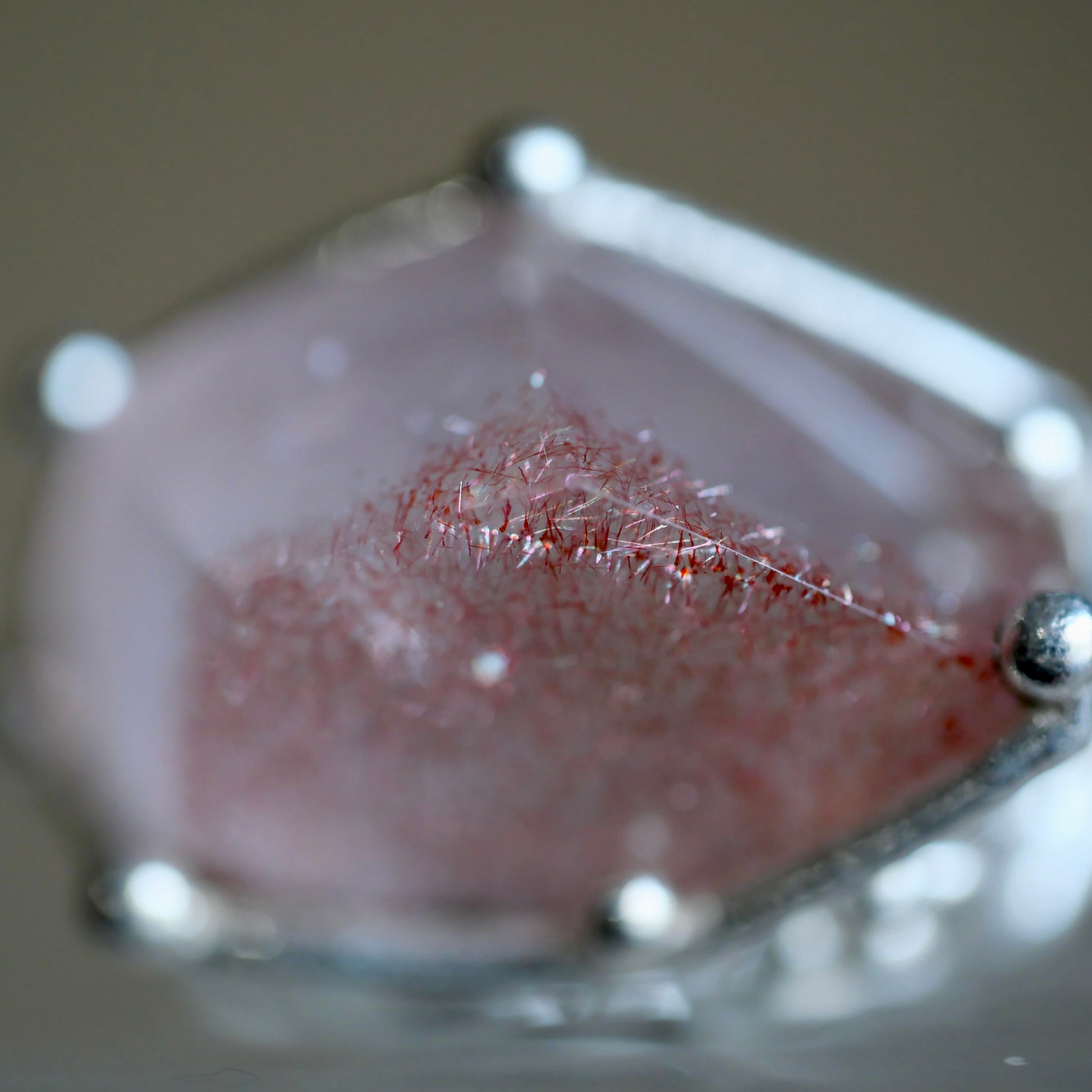 ユニークなカットのストロベリークォーツ。赤い針状のレピドクロサイトが水晶の中に結晶し、全体的にサーモンピンクに見える石。インクルージョンが虹色に光るのがレア。