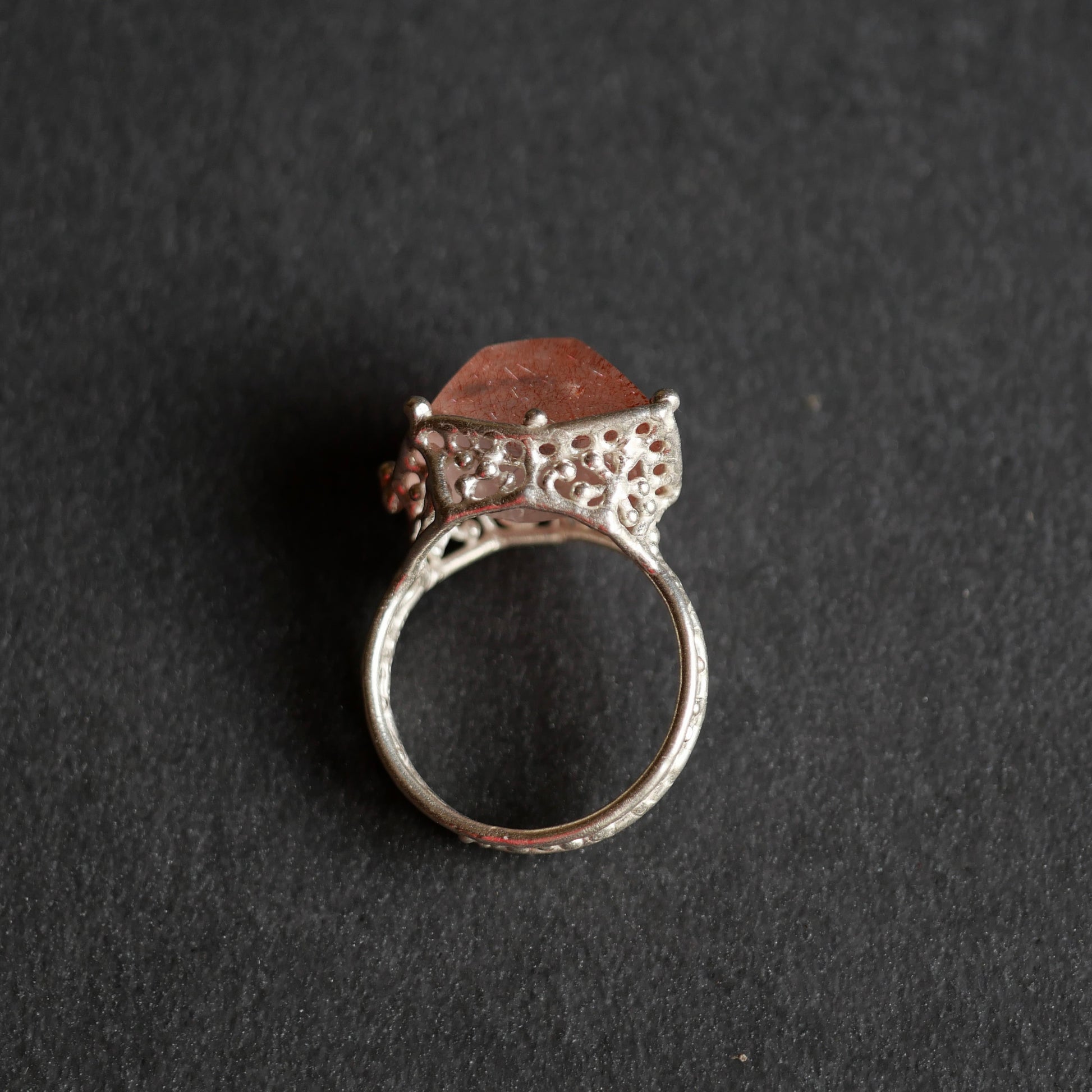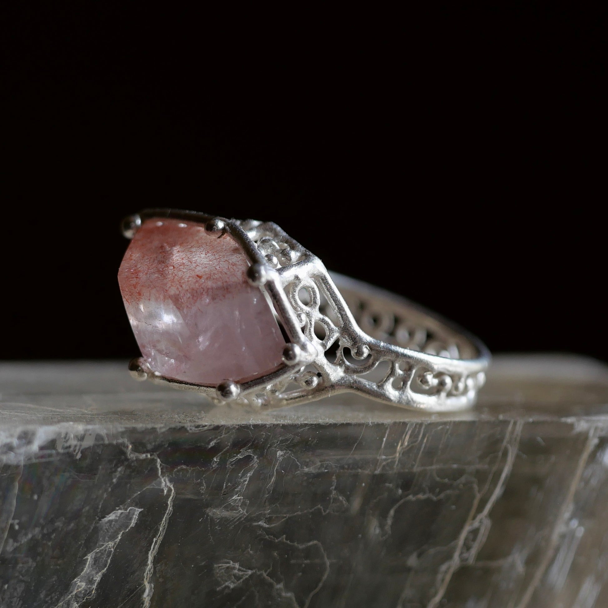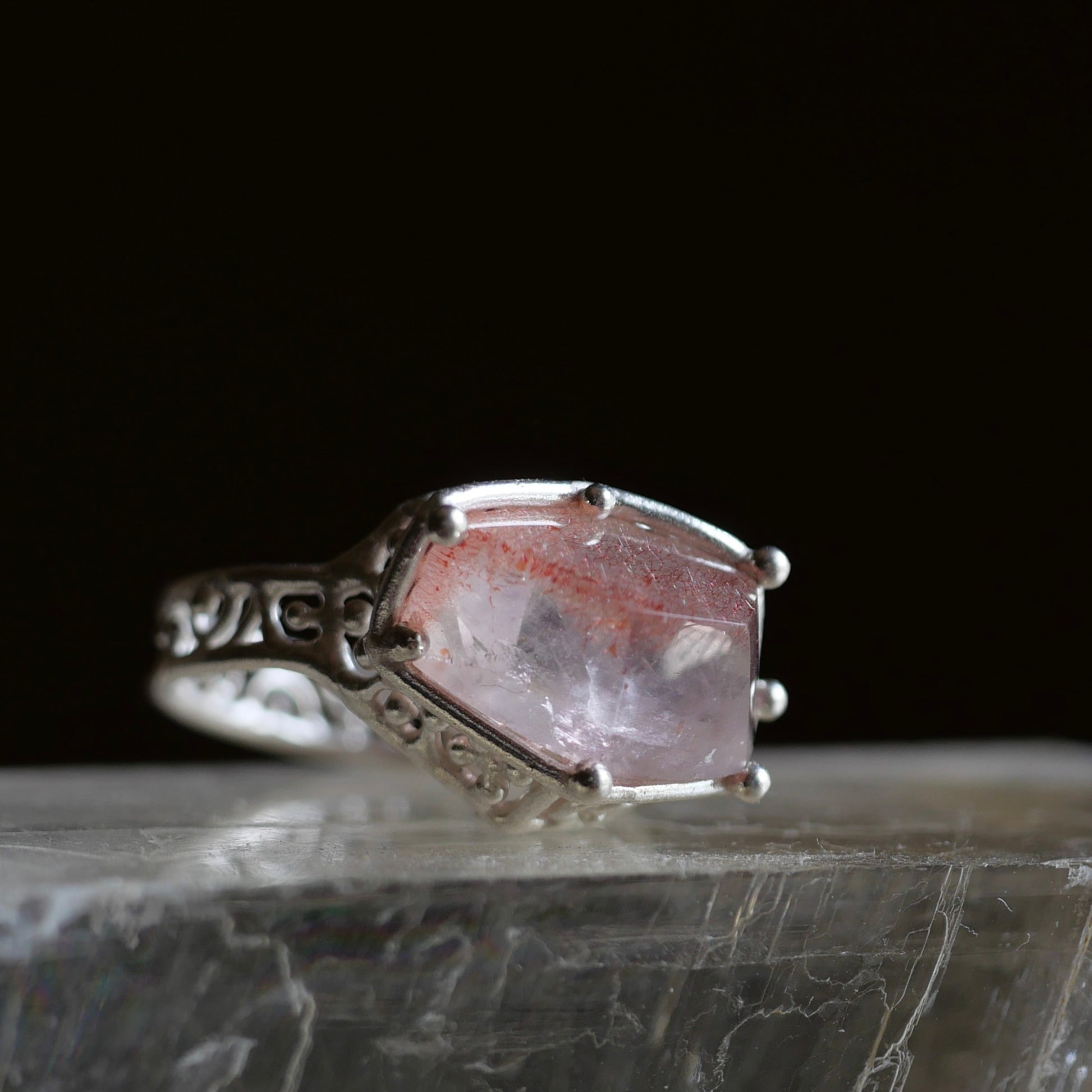 ユニークなカットのストロベリークォーツ。赤い針状のレピドクロサイトが水晶の中に結晶し、全体的にサーモンピンクに見える石。インクルージョンが虹色に光るのがレア。