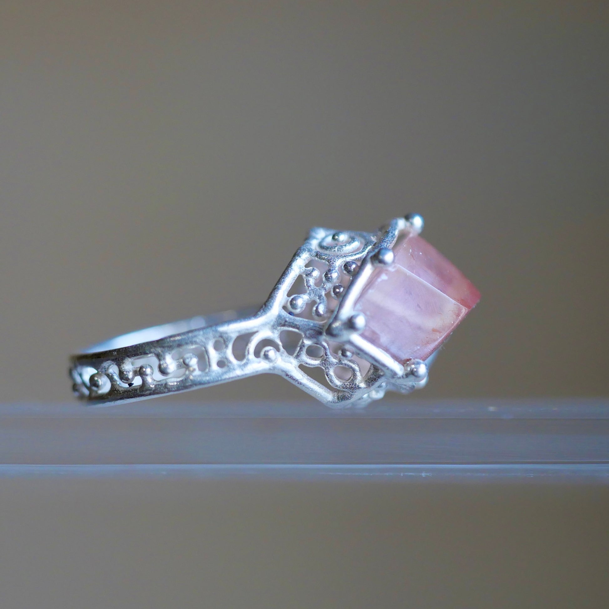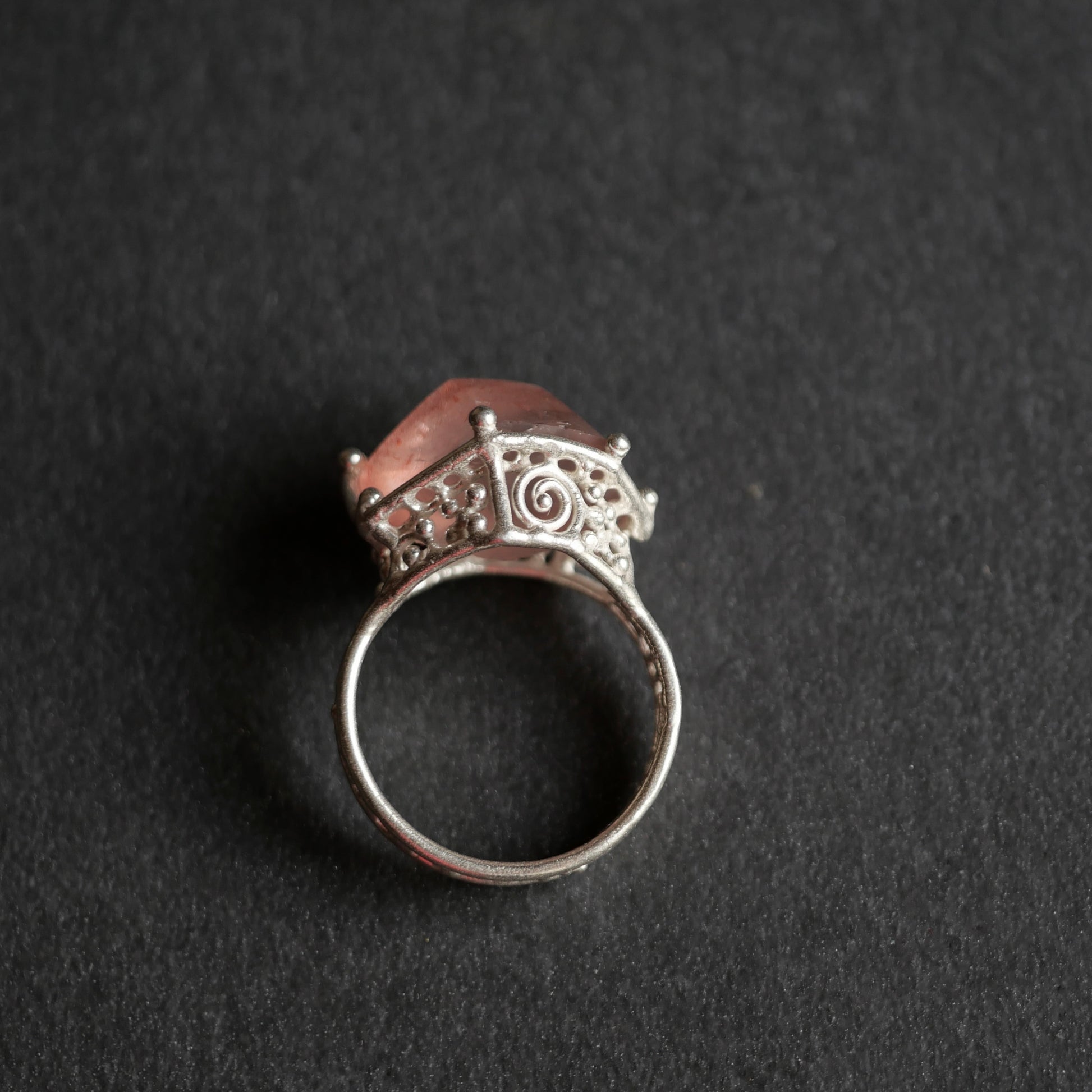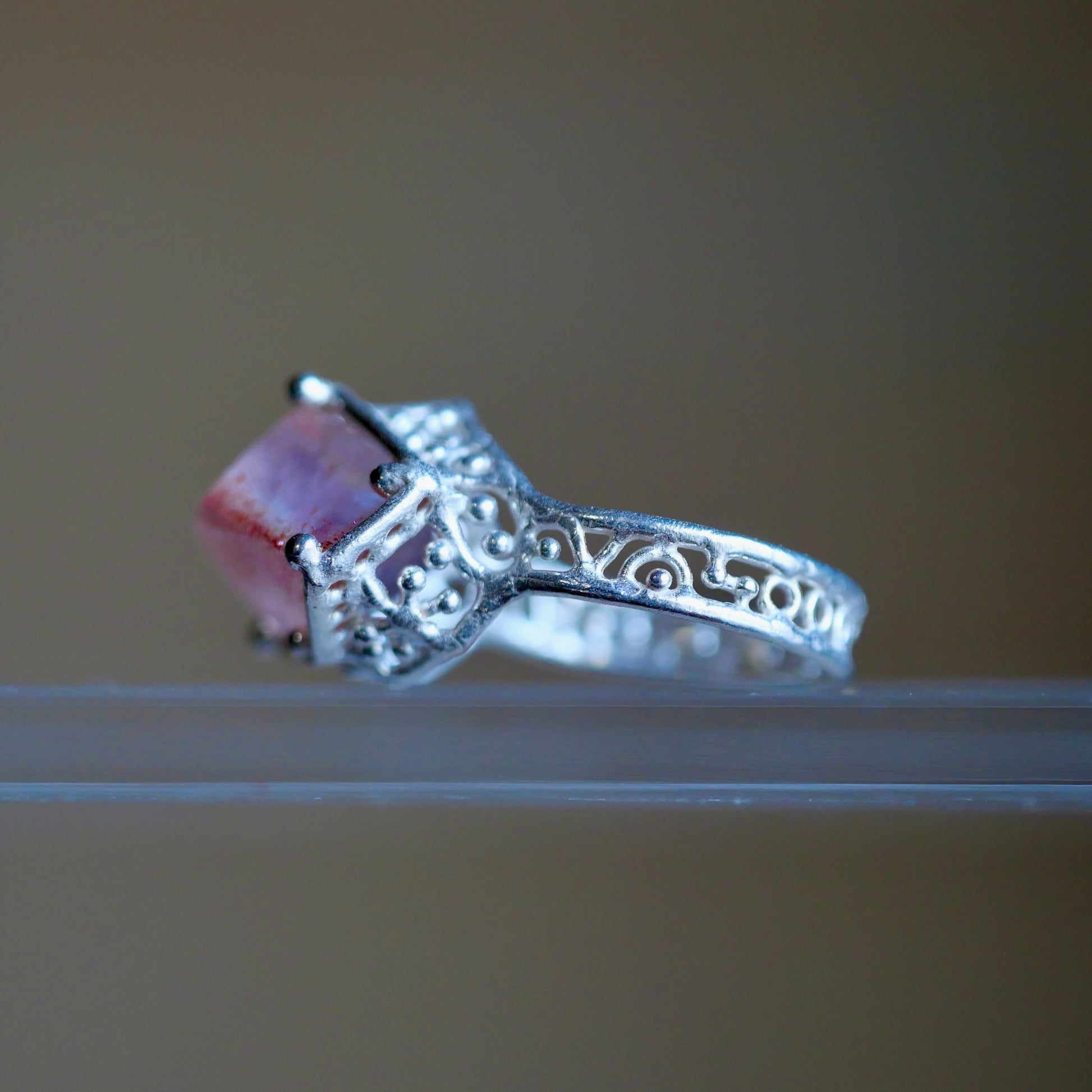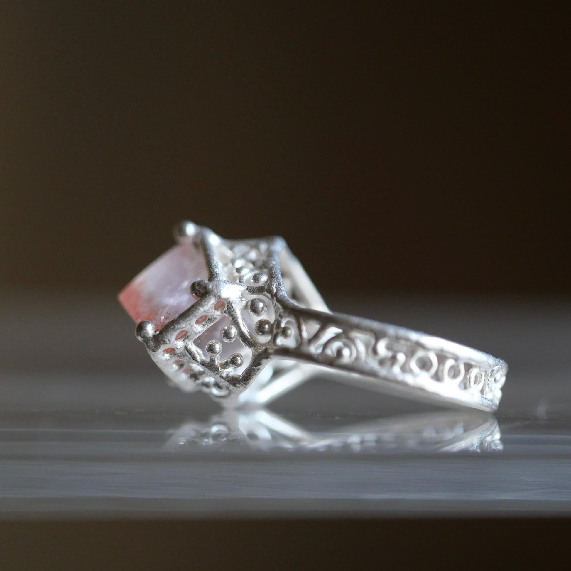 ユニークなカットのストロベリークォーツ。赤い針状のレピドクロサイトが水晶の中に結晶し、全体的にサーモンピンクに見える石。インクルージョンが虹色に光るのがレア。