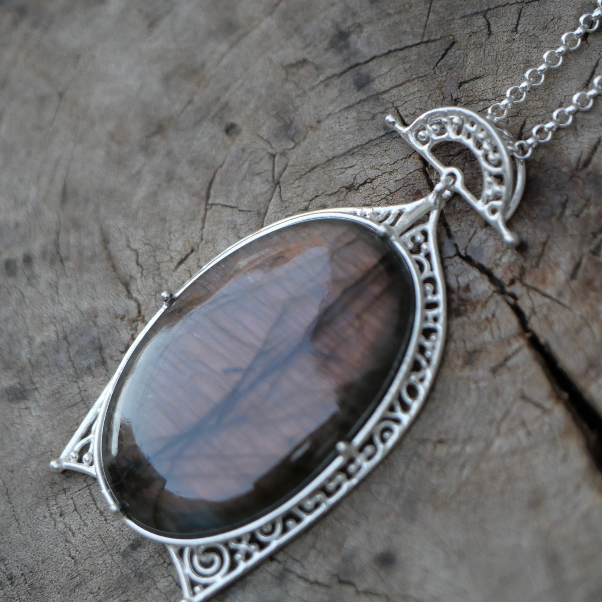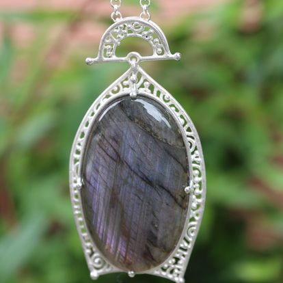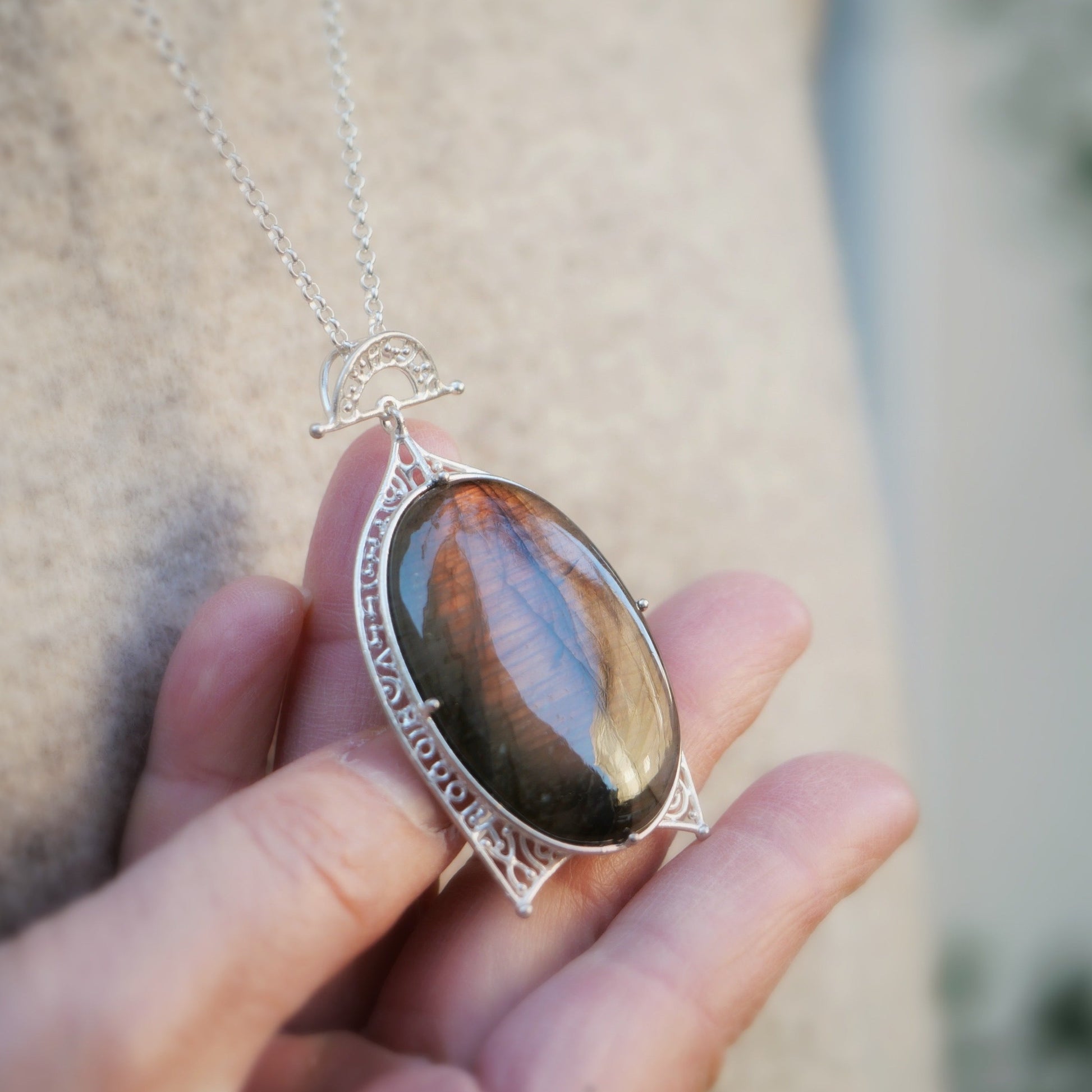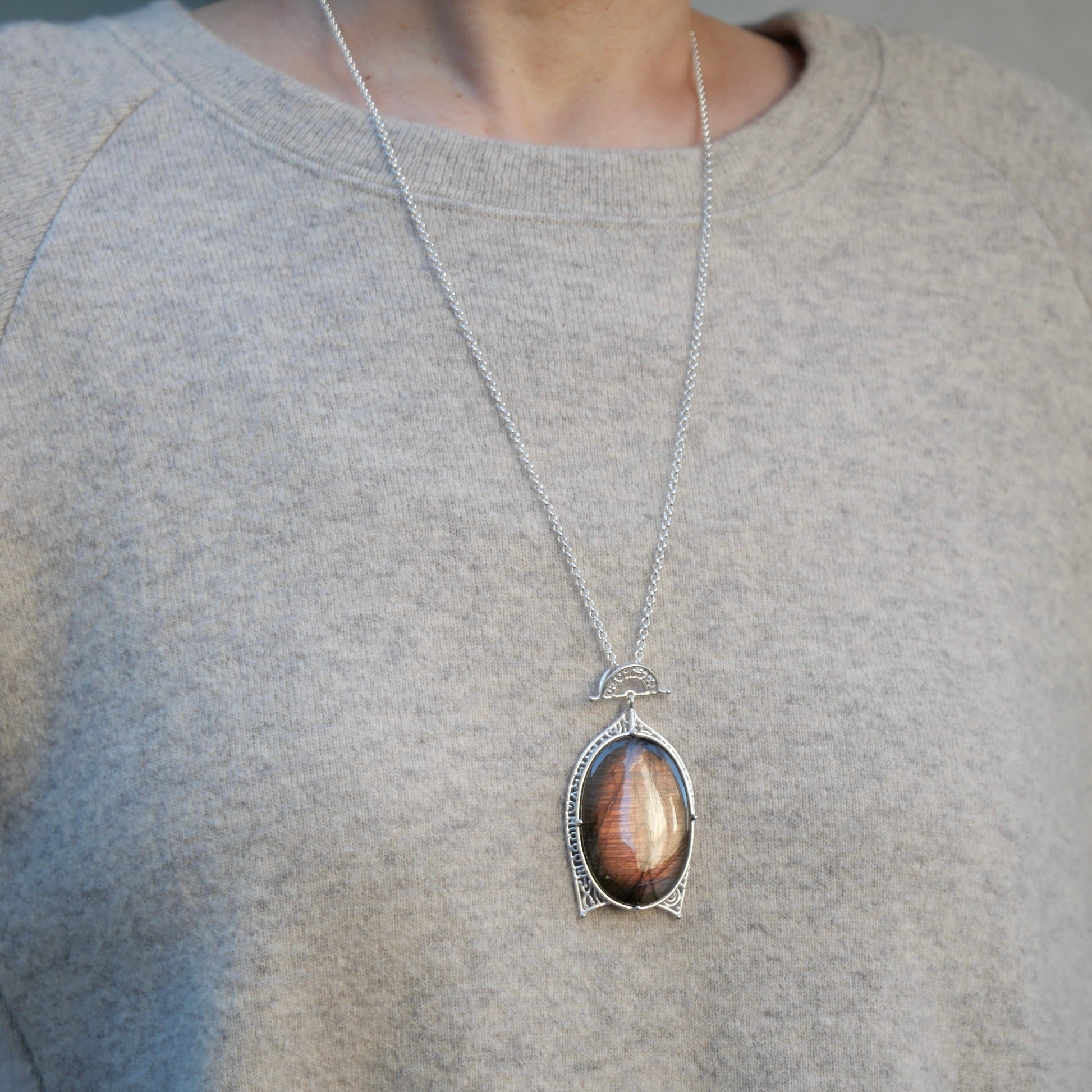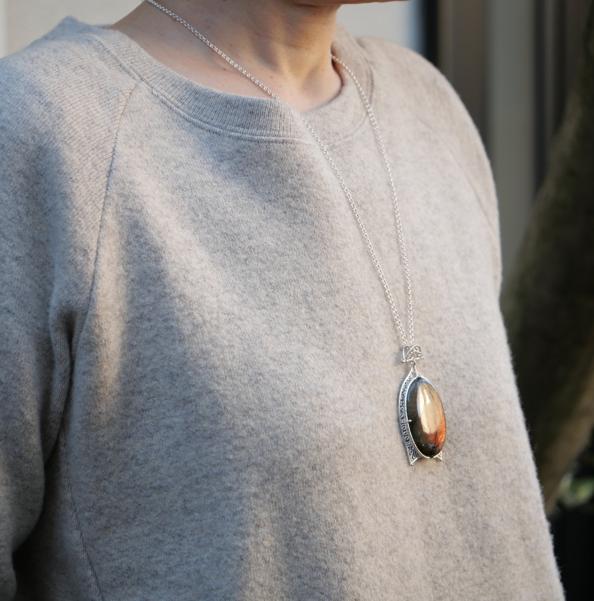 みる角度によっていろんな色が見えるラブラドライト。光が当たる部分がピンクパープルに胸元で光ります。
