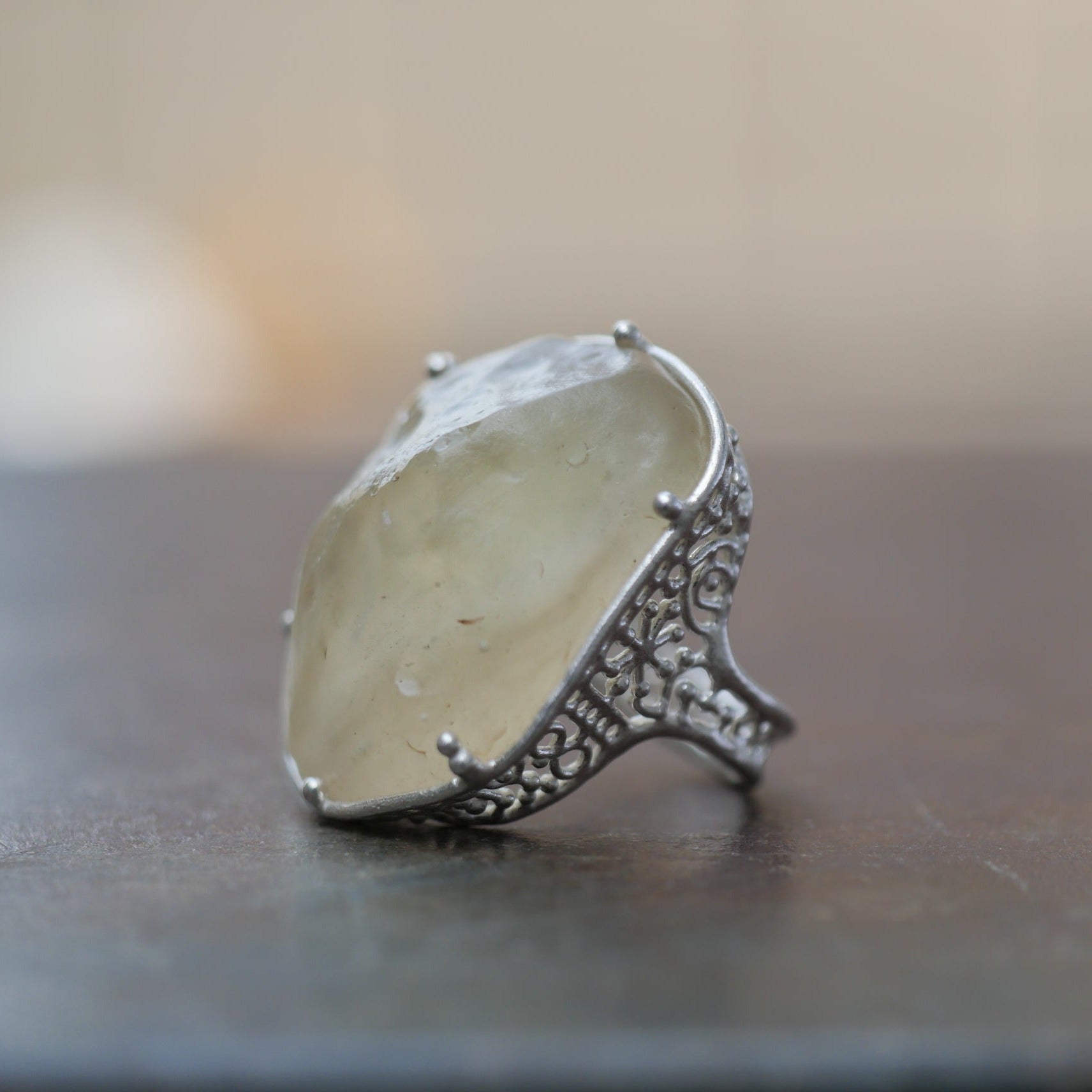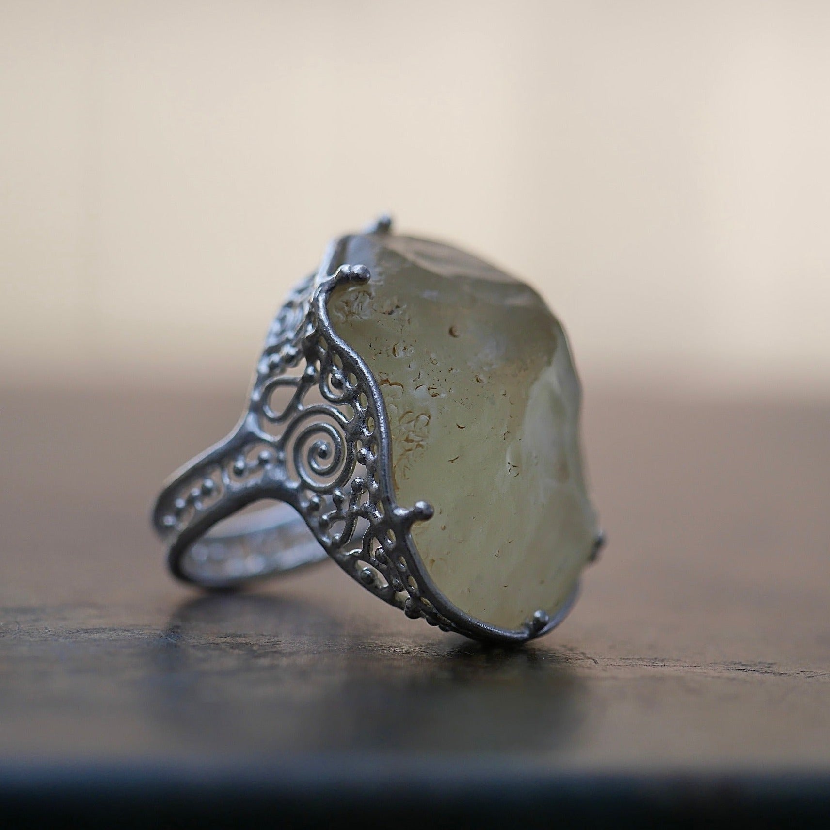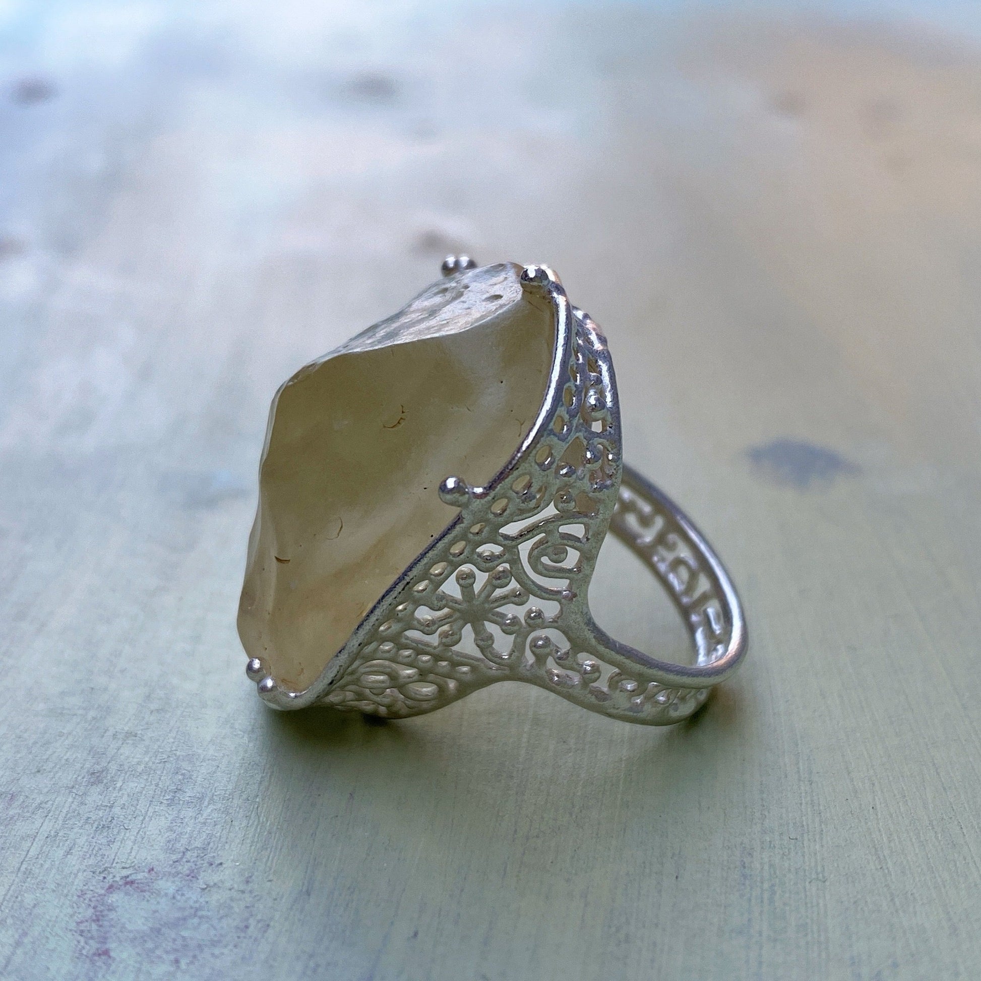 This ring is made of Rivian Desert Glass, known as a naturally occurring glass found in the Libyan desert. The design makes the most of the unique material by utilizing the shape of the rough stone. Very transparent yellow.
