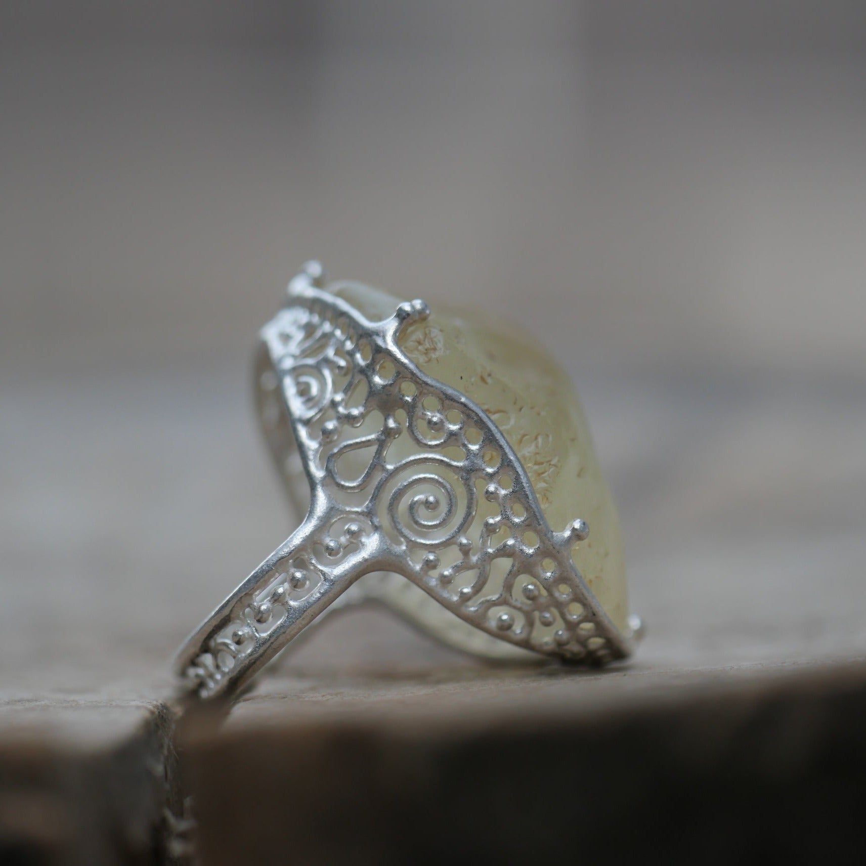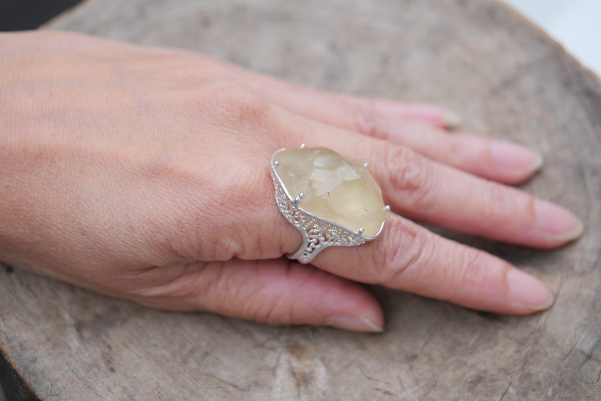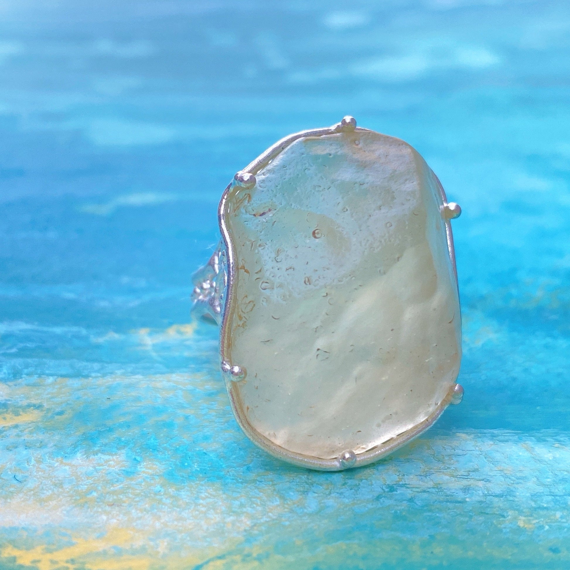 This ring is made of Rivian Desert Glass, known as a naturally occurring glass found in the Libyan desert. The design makes the most of the unique material by utilizing the shape of the rough stone. Very transparent yellow.