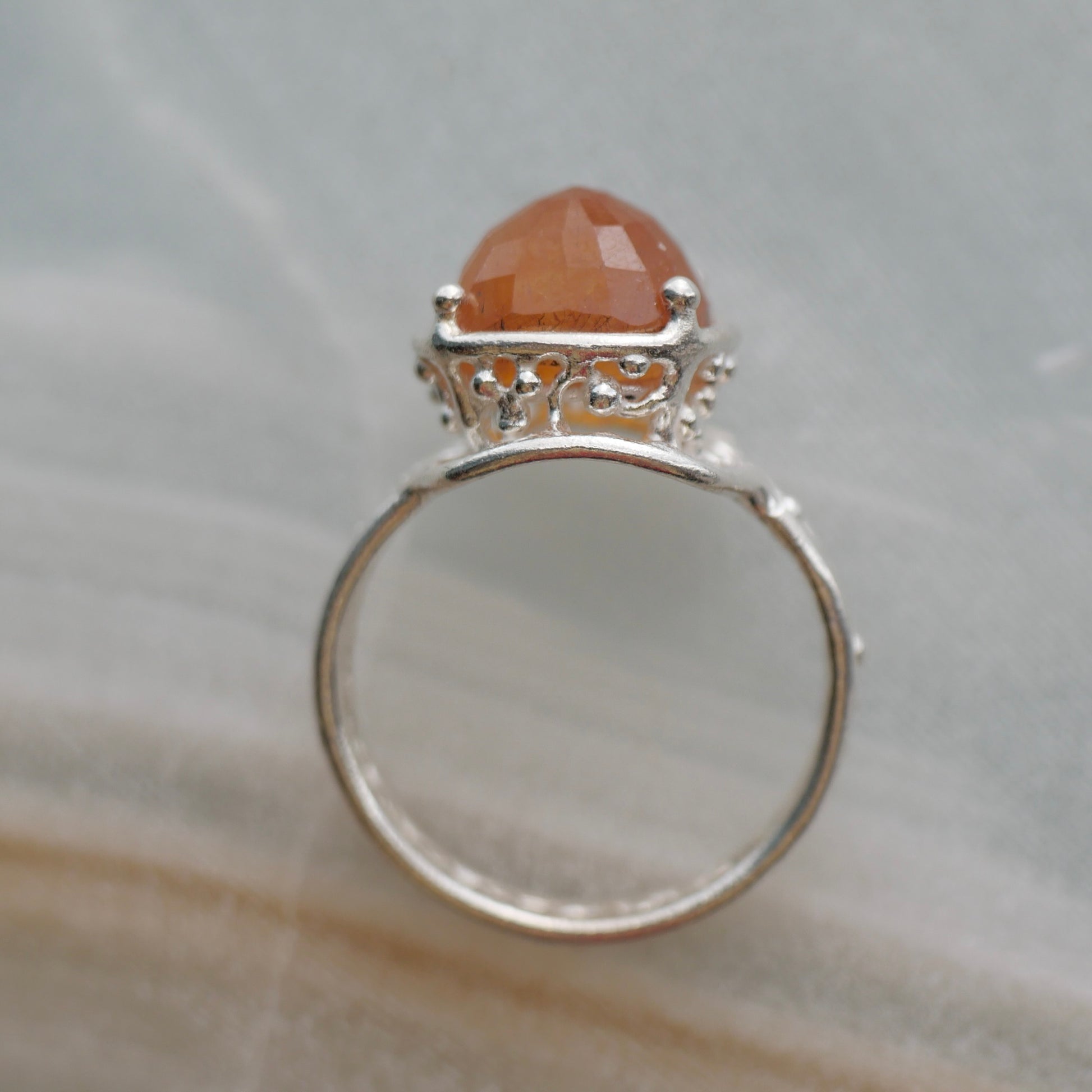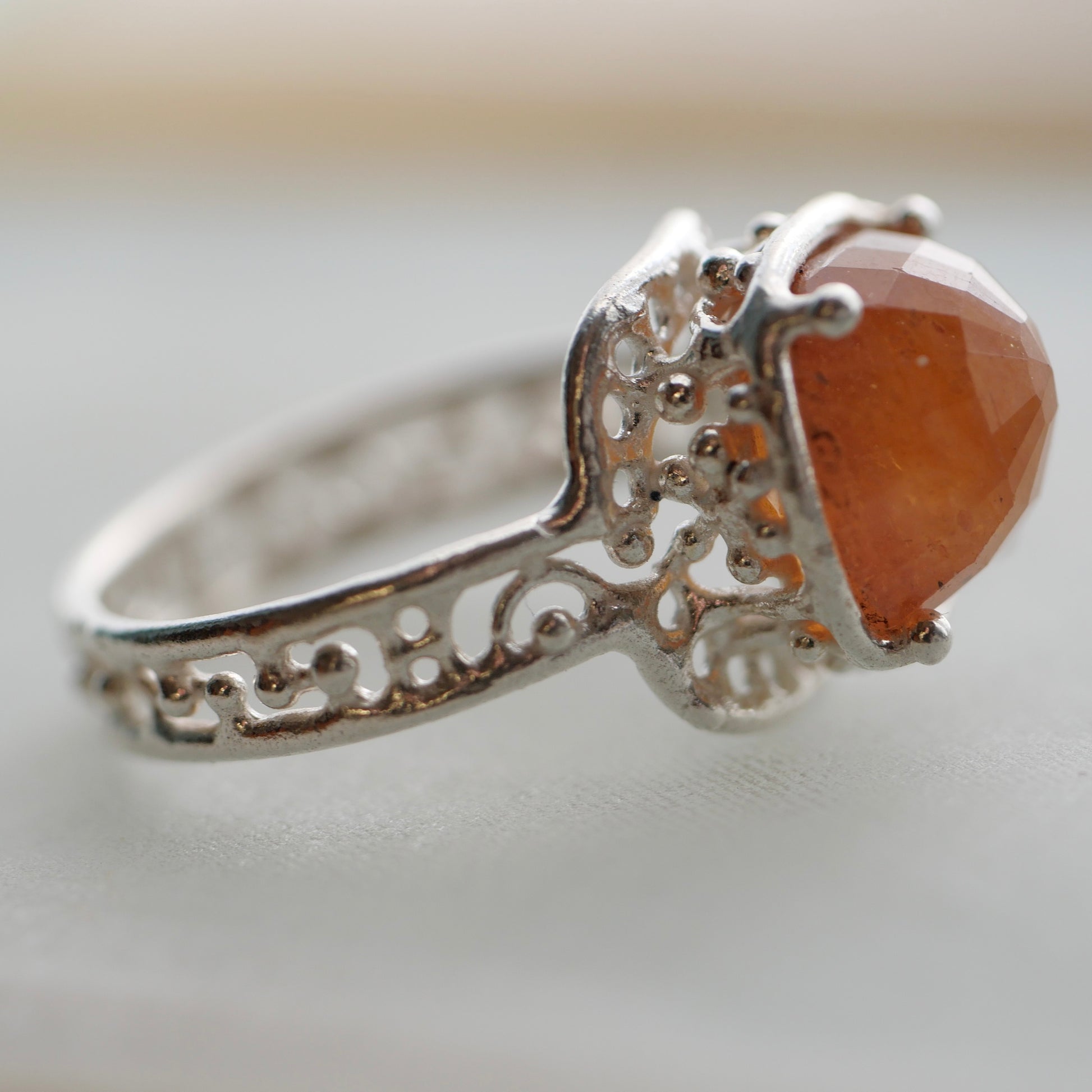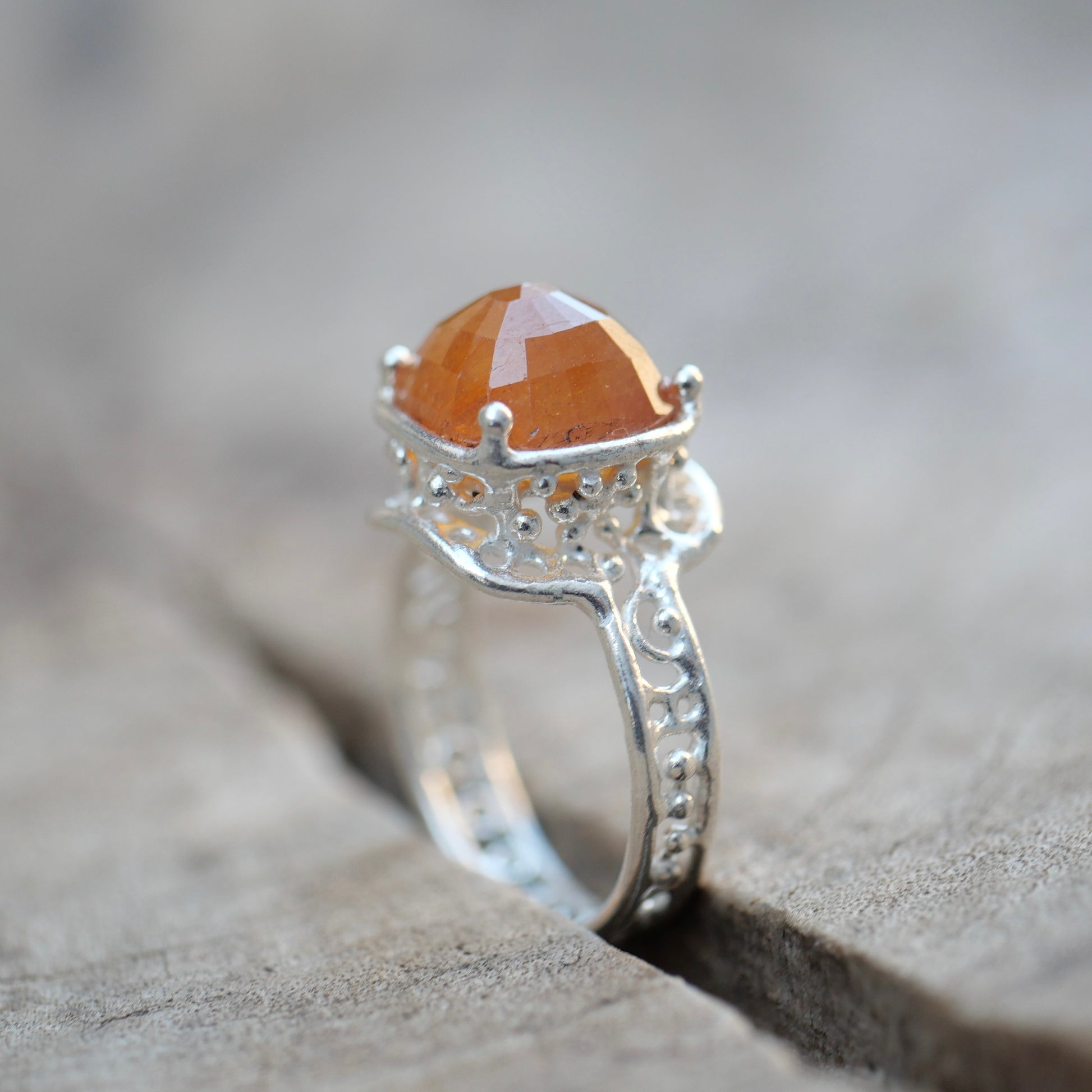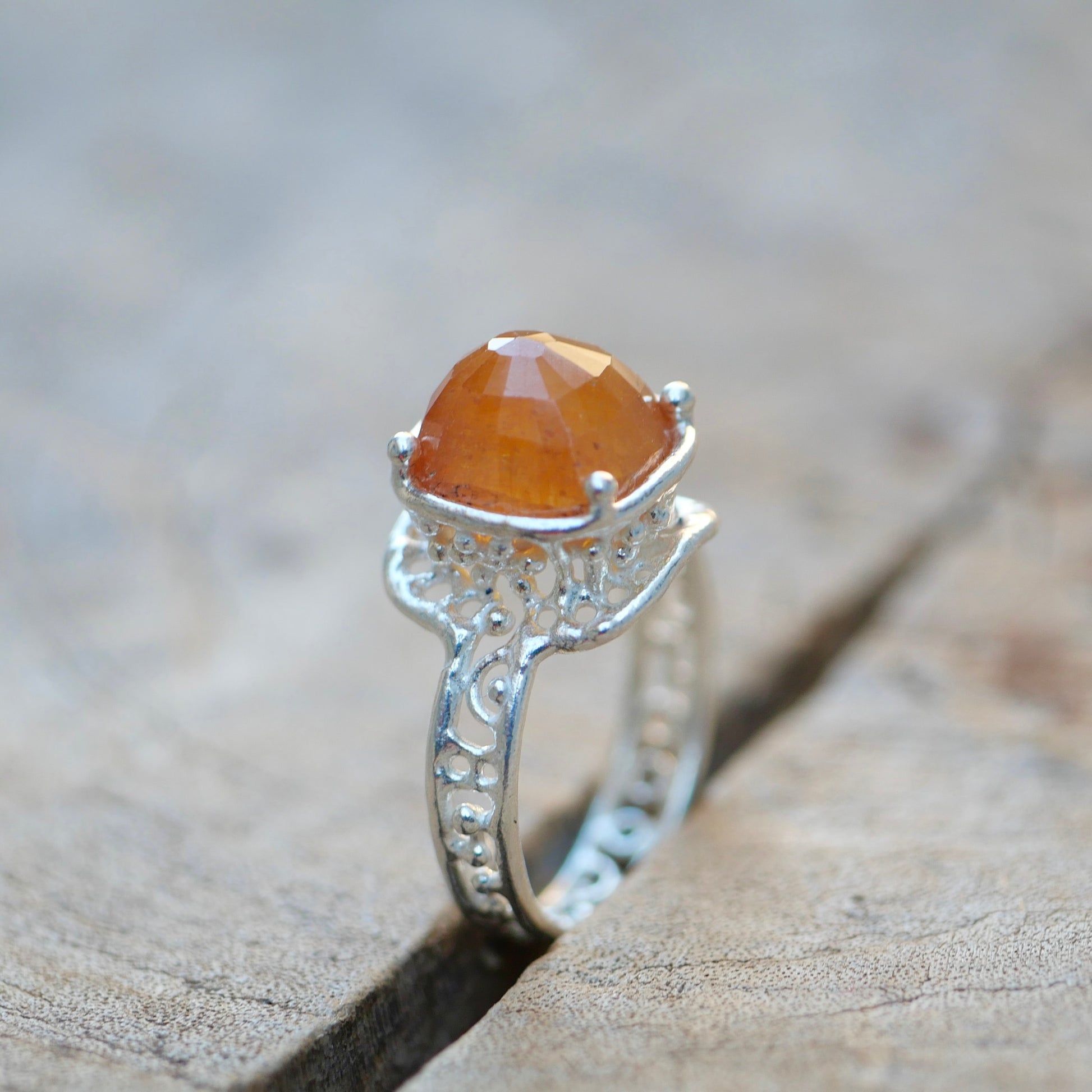Orange sapphire ring with a cut that reflects the light beautifully. The design allows light to enter and the gradation of tones is very attractive.
