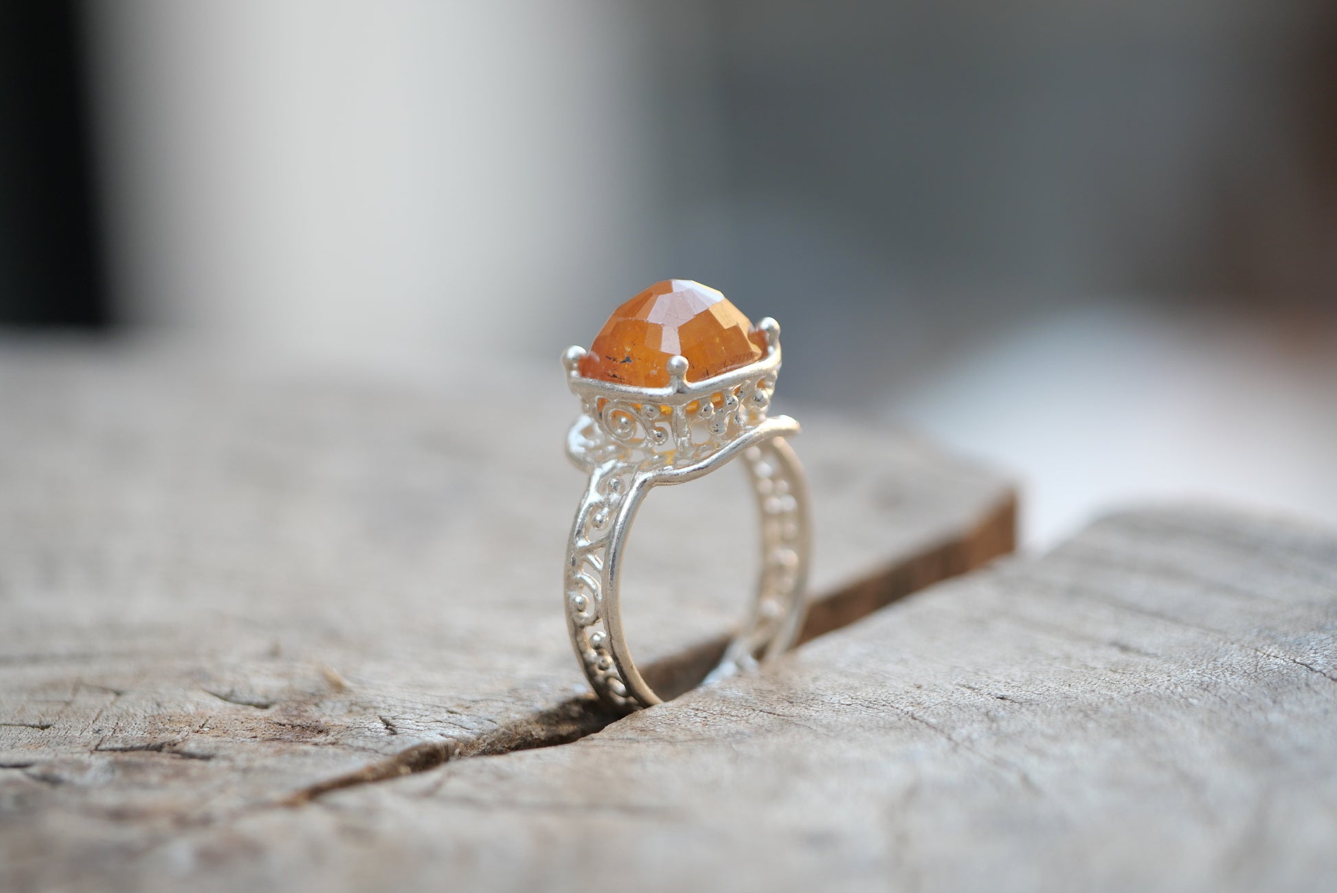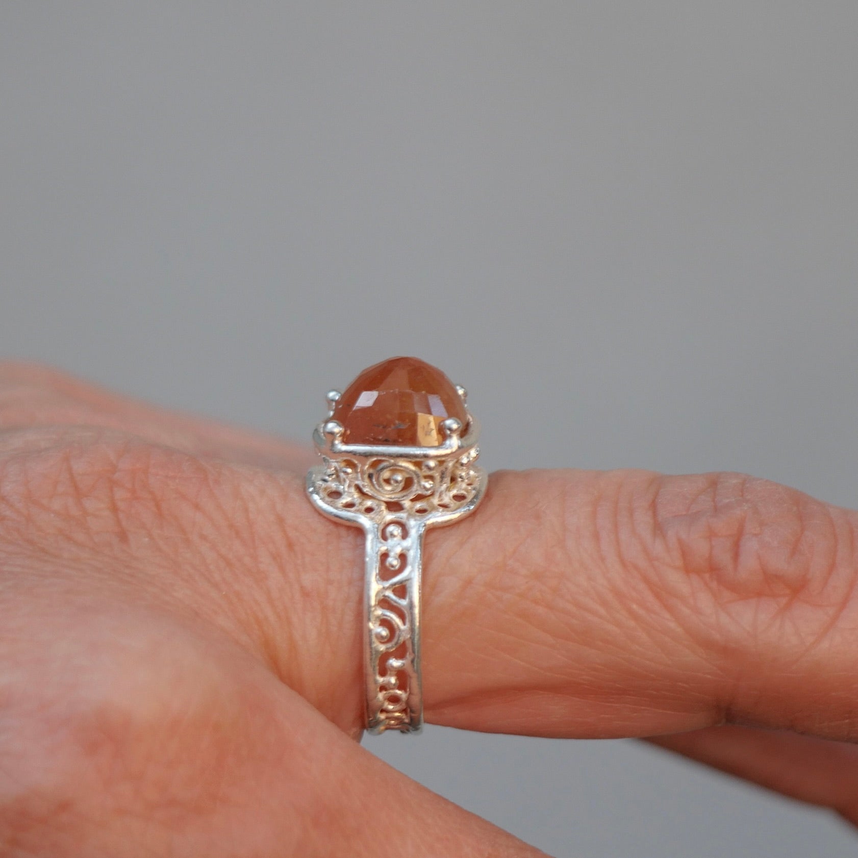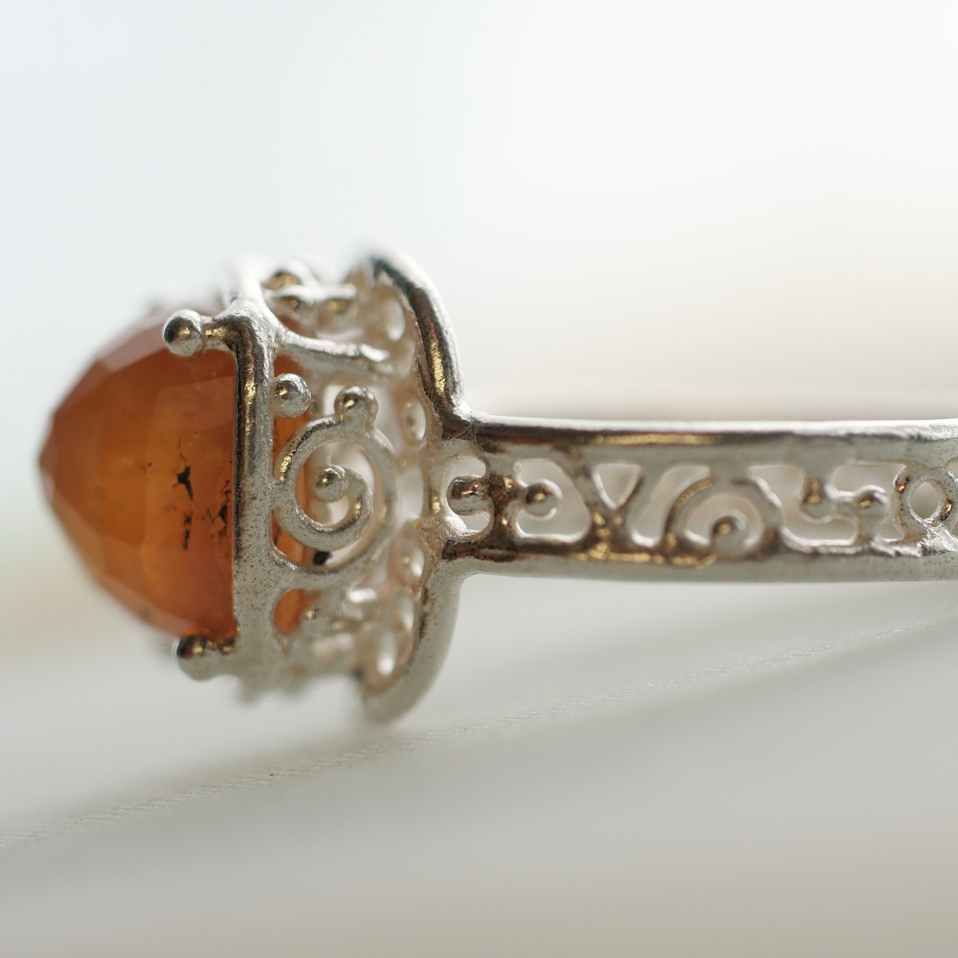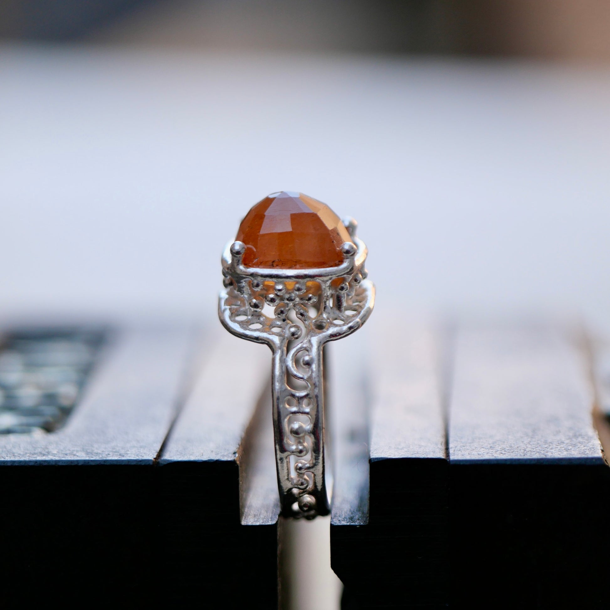 Orange sapphire ring with a cut that reflects the light beautifully. The design allows light to enter and the gradation of tones is very attractive.
