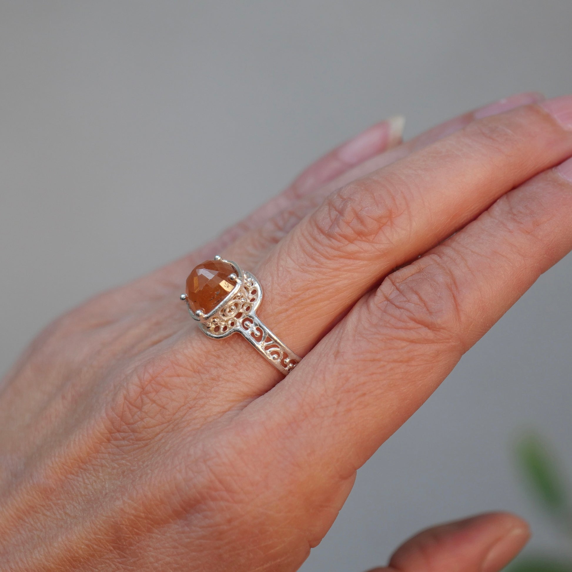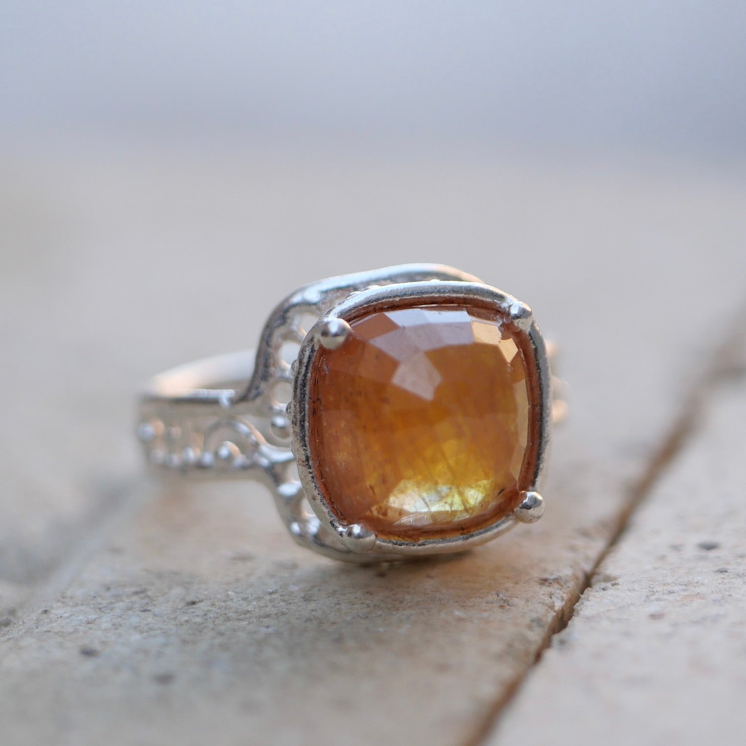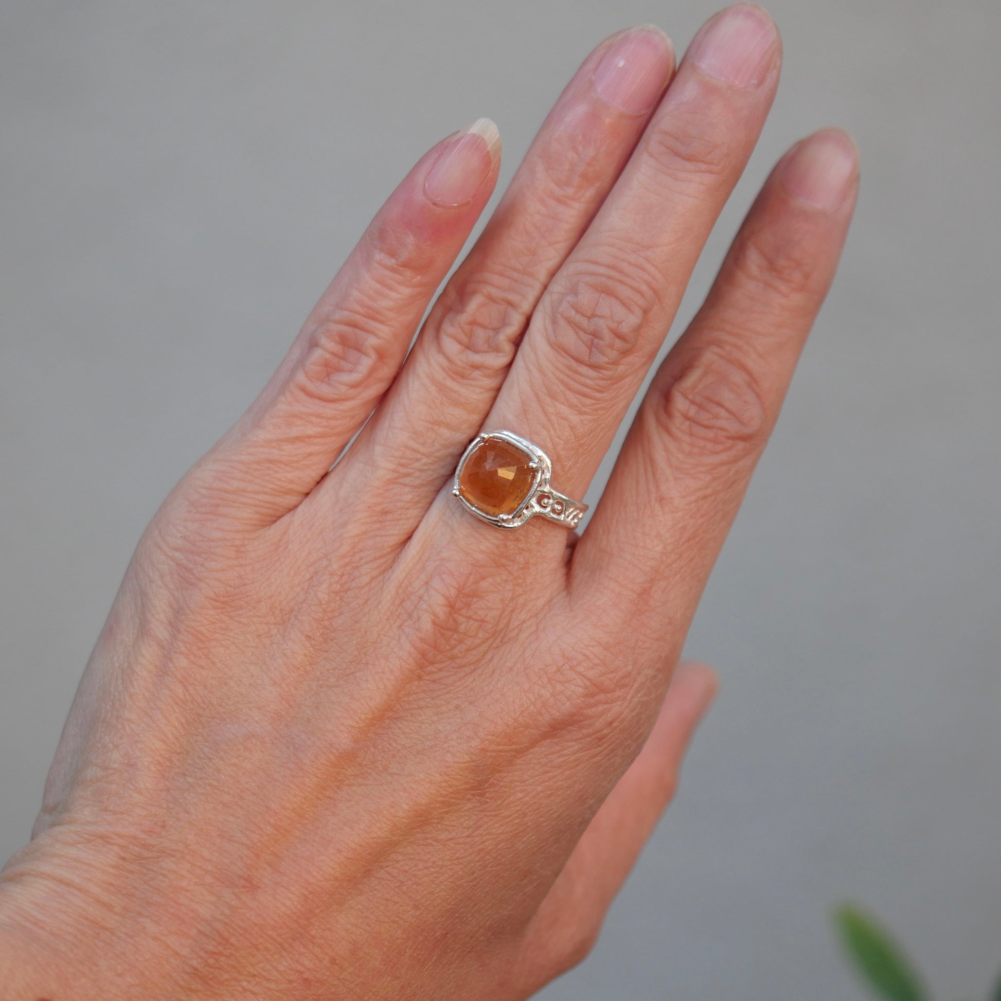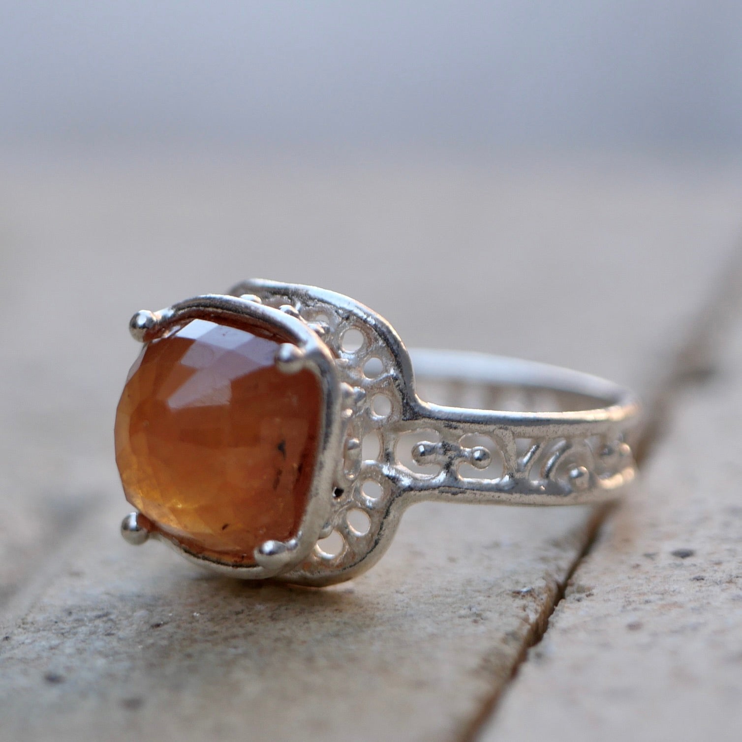 Orange sapphire ring with a cut that reflects the light beautifully. The design allows light to enter and the gradation of tones is very attractive.