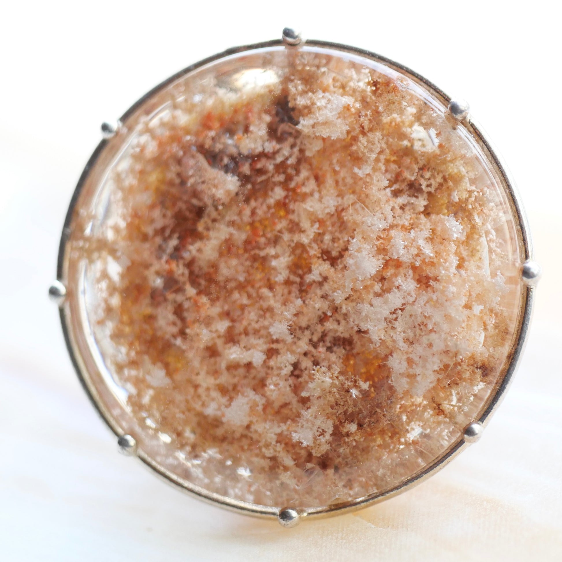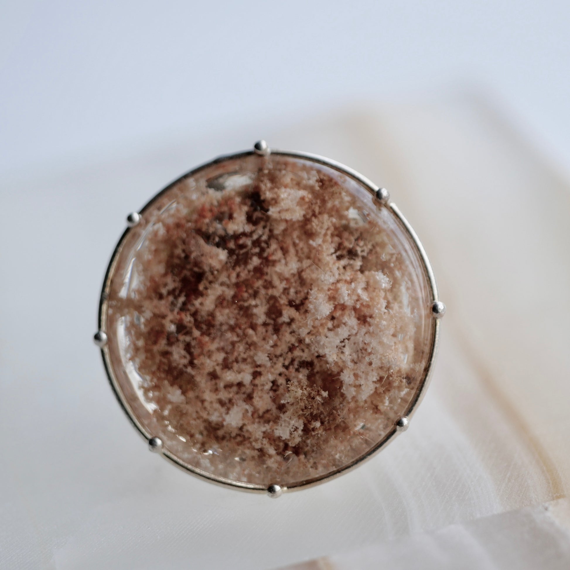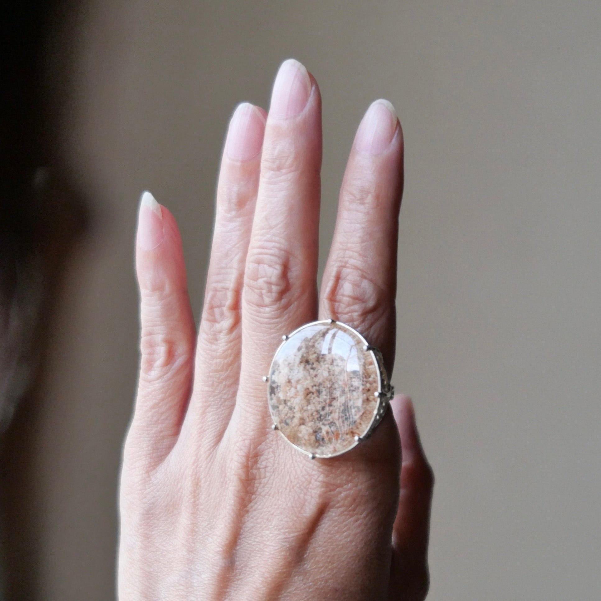 Garden quartz with plenty of transparency. The large round cabochon has a strong presence. IKOI's unique design makes this ring very comfortable to wear and lightweight, even for a ring with large stones.