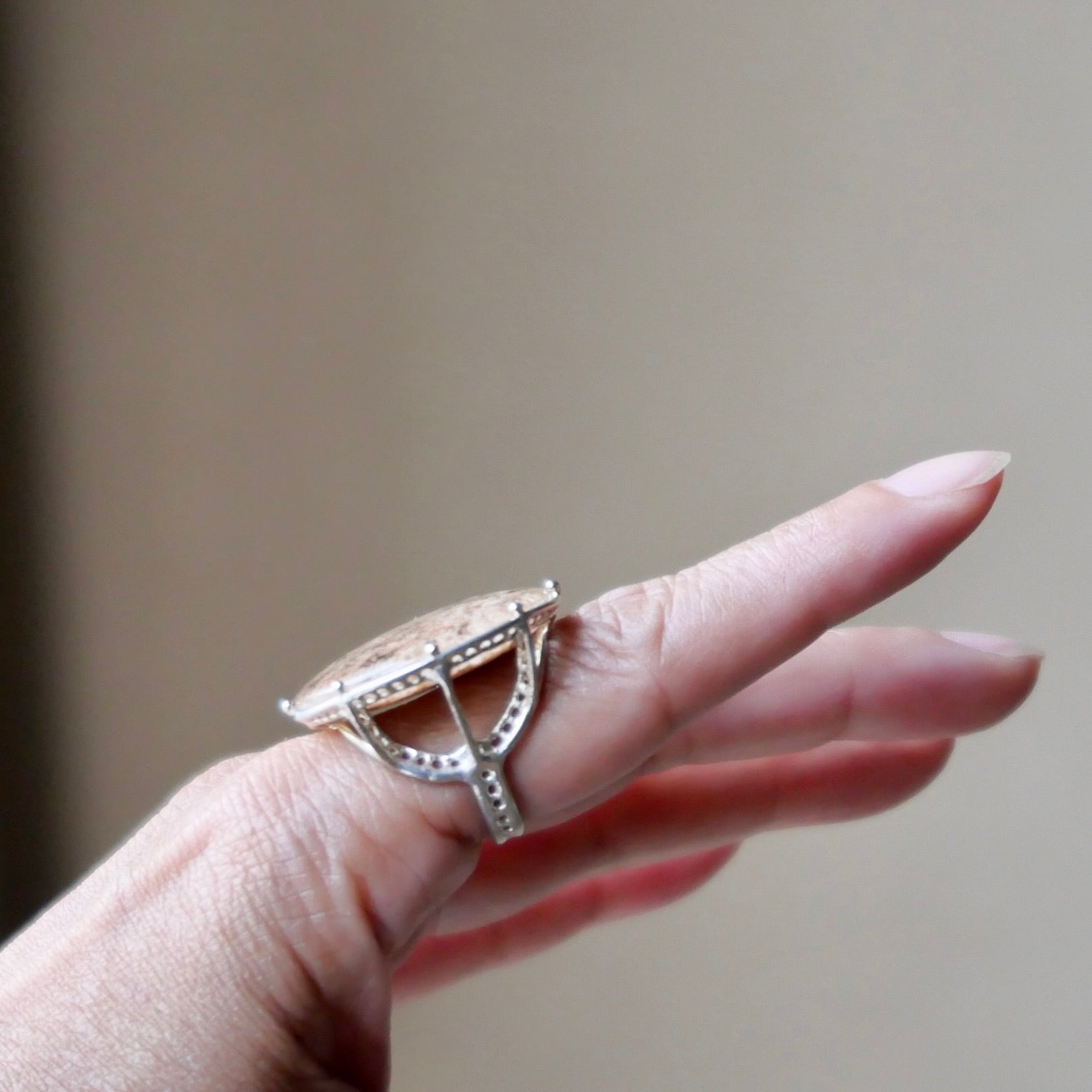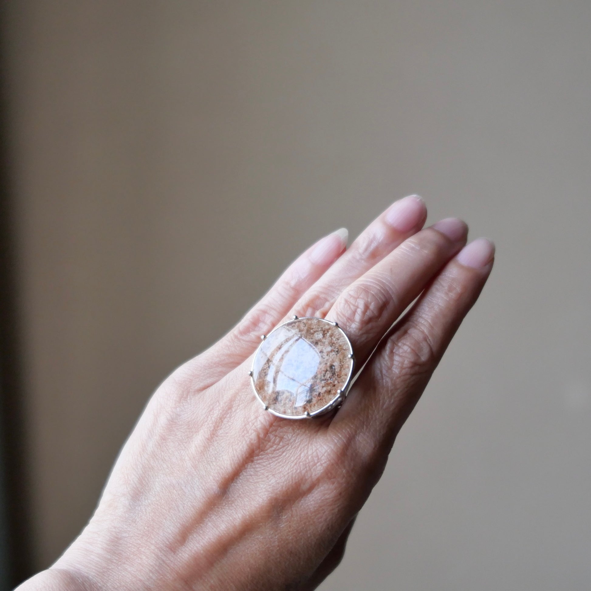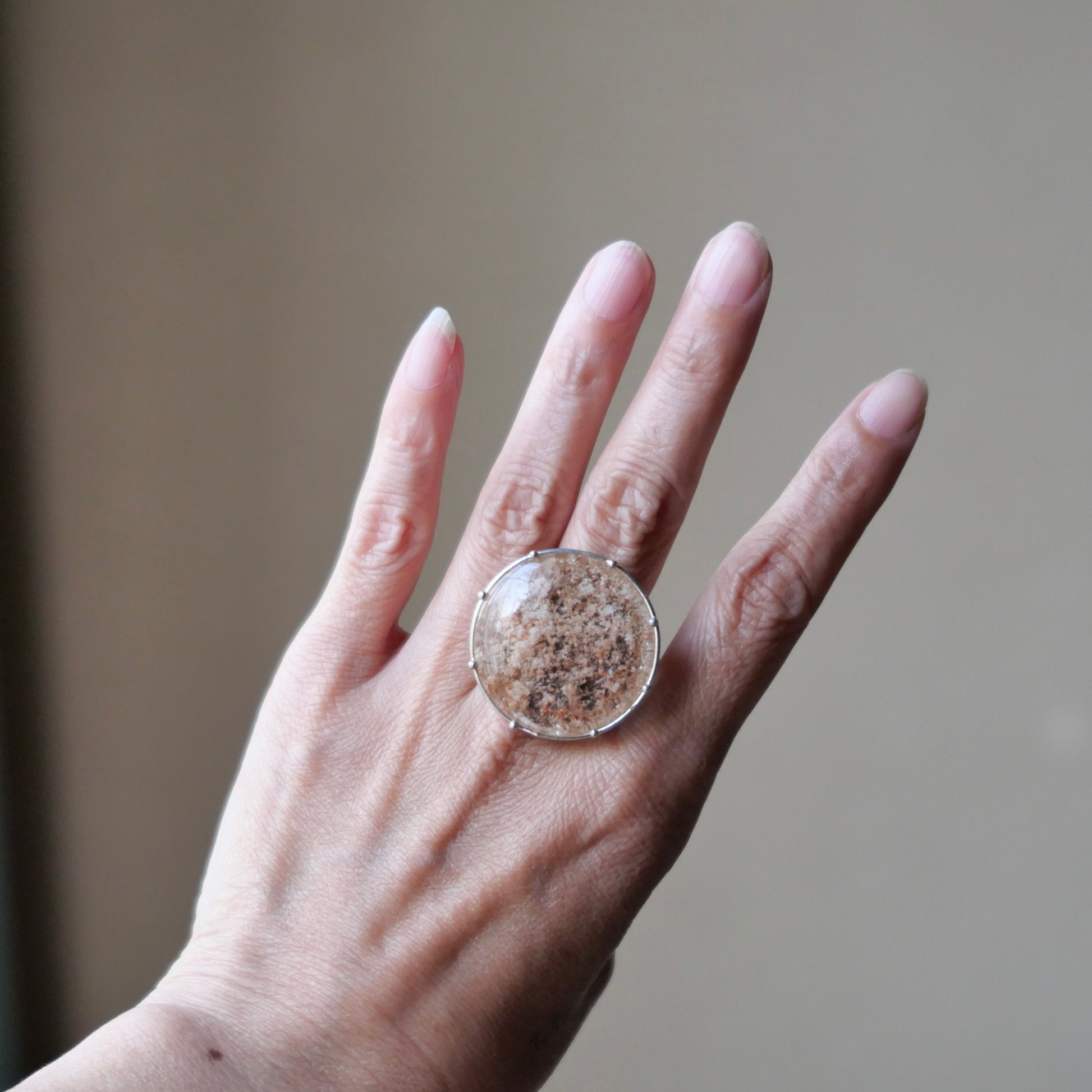 透明感たっぷりのガーデンクォーツ。大きな丸いカボションが存在感があります。大きな石を使ったリングでもとてもつけこごちがよく、軽いのがIKOI独自の設計です。このぐらい石の存在感があると見応えがあります!