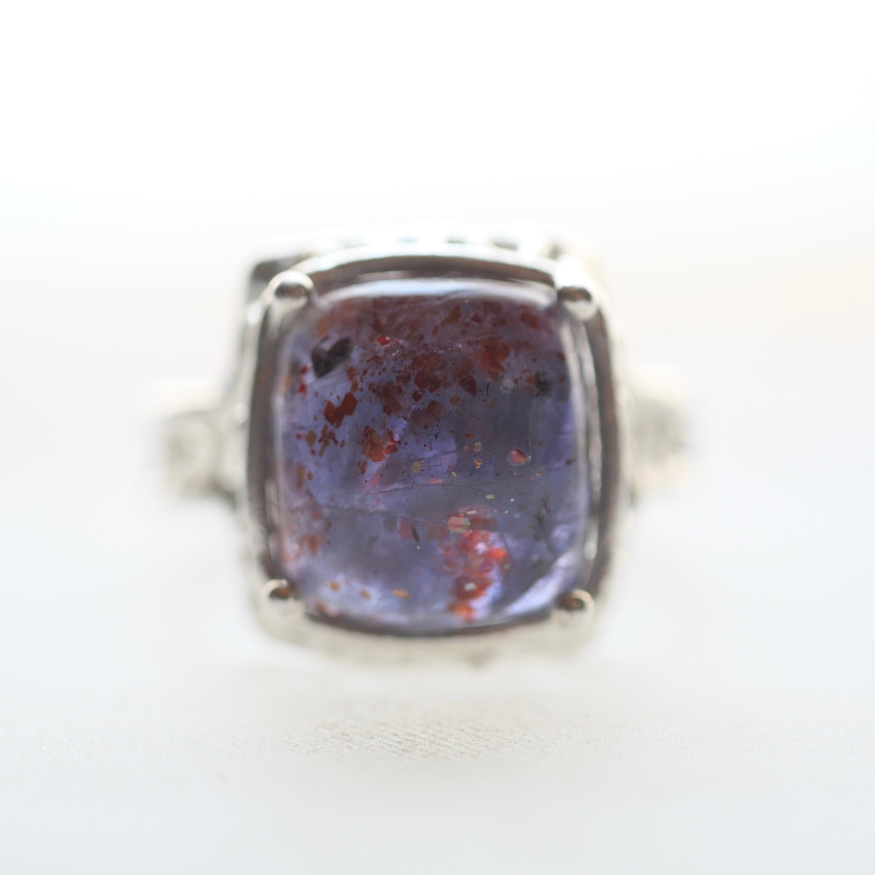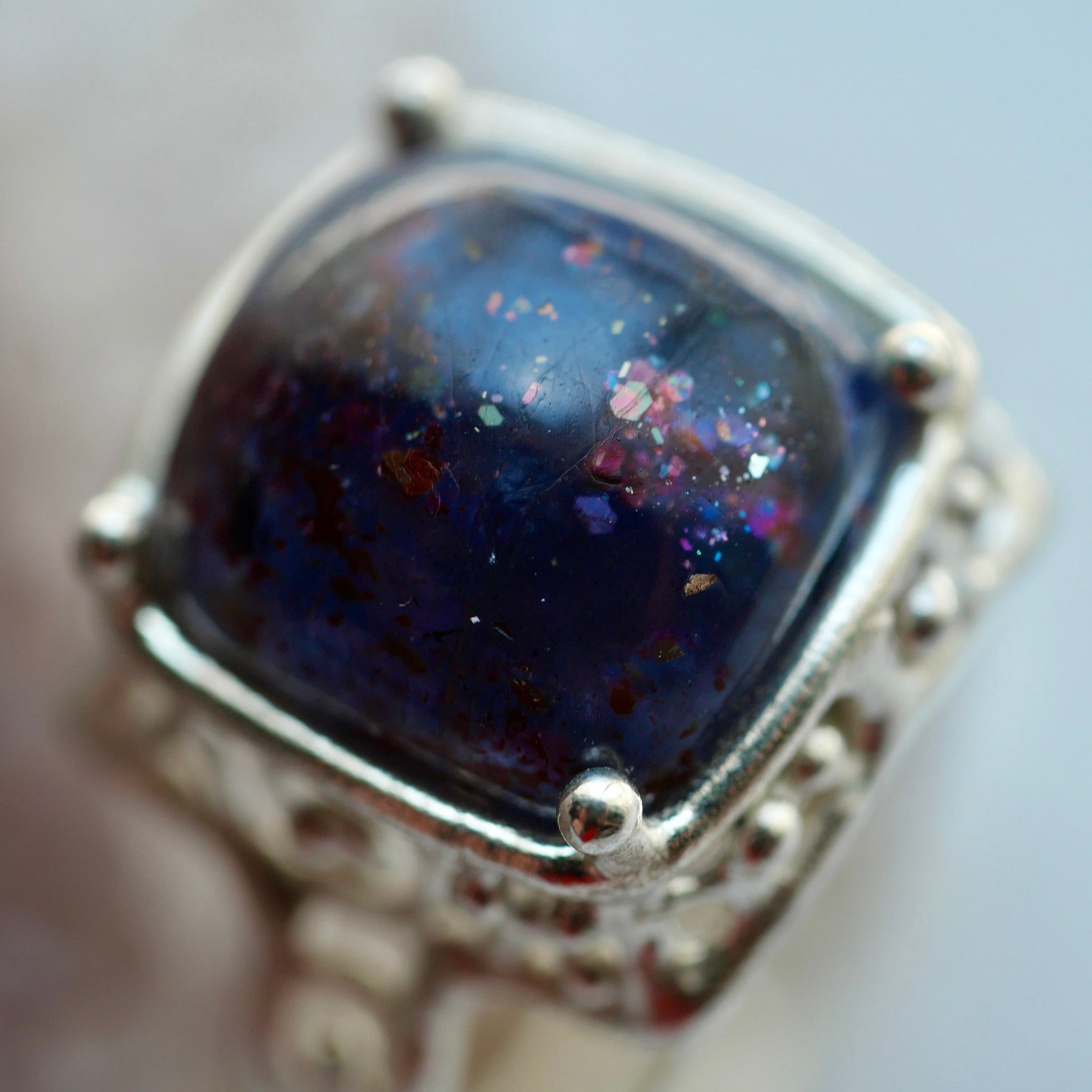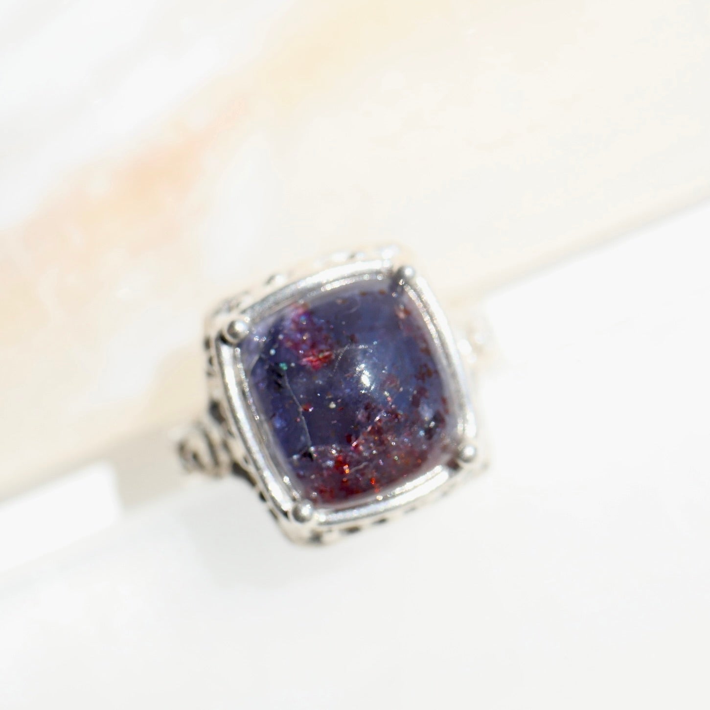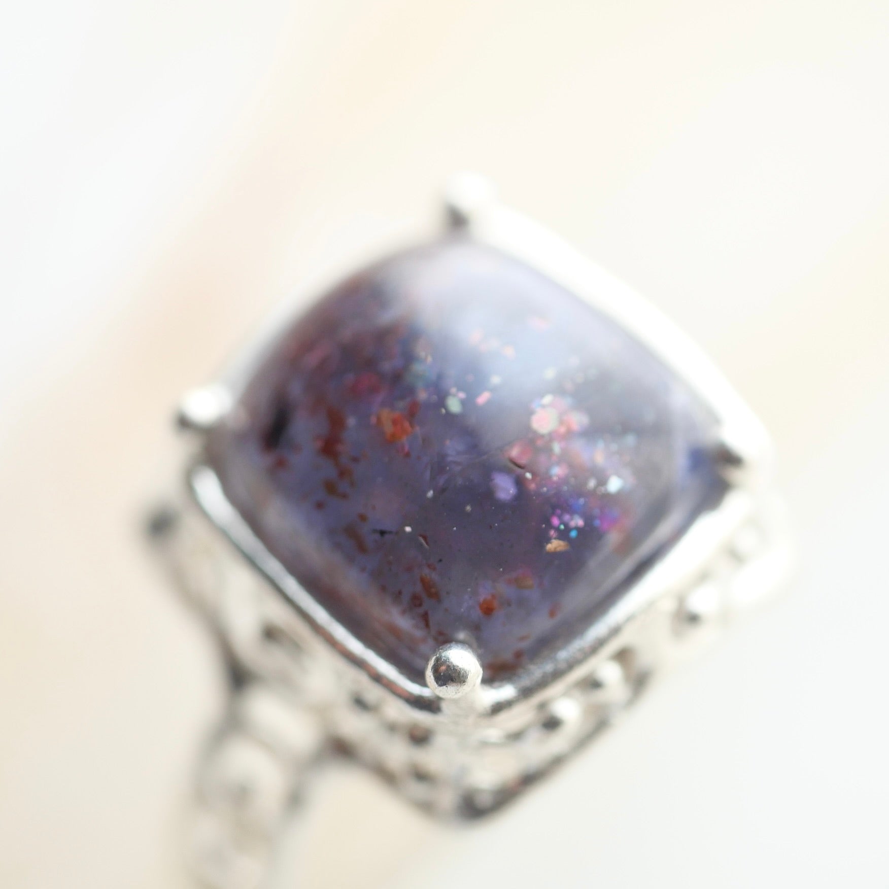 濃い紫の中に、虹色のラメが天然で入っている魅力的な石。光に当たるときらりとヒカリます。