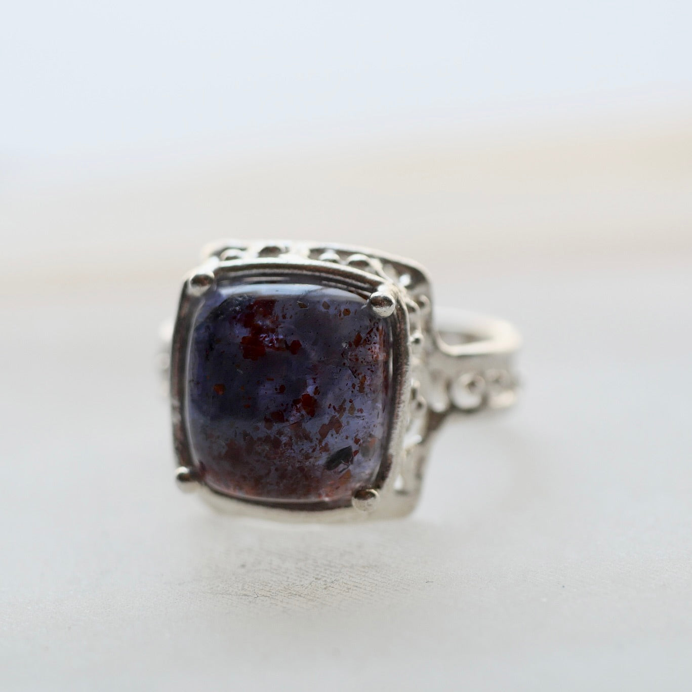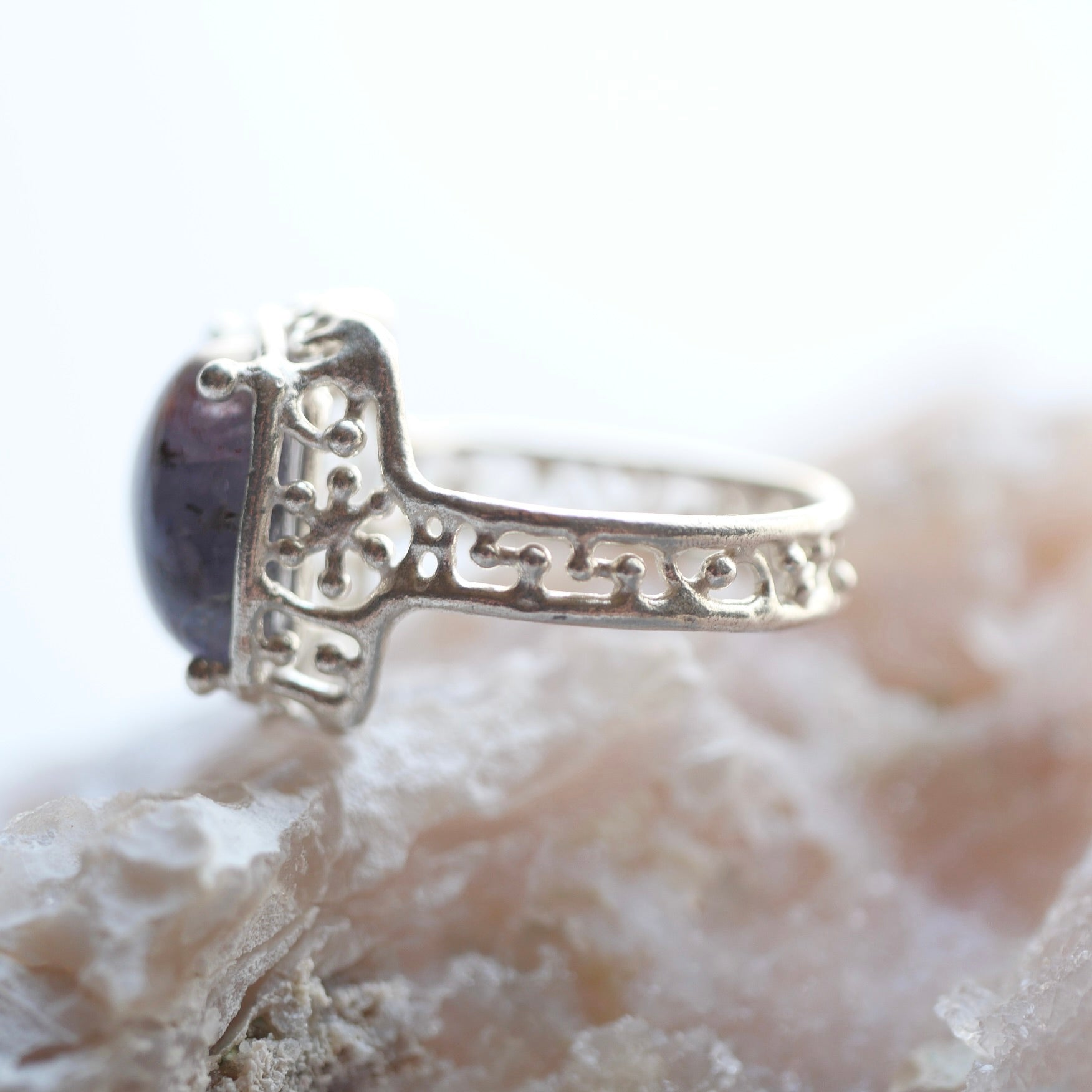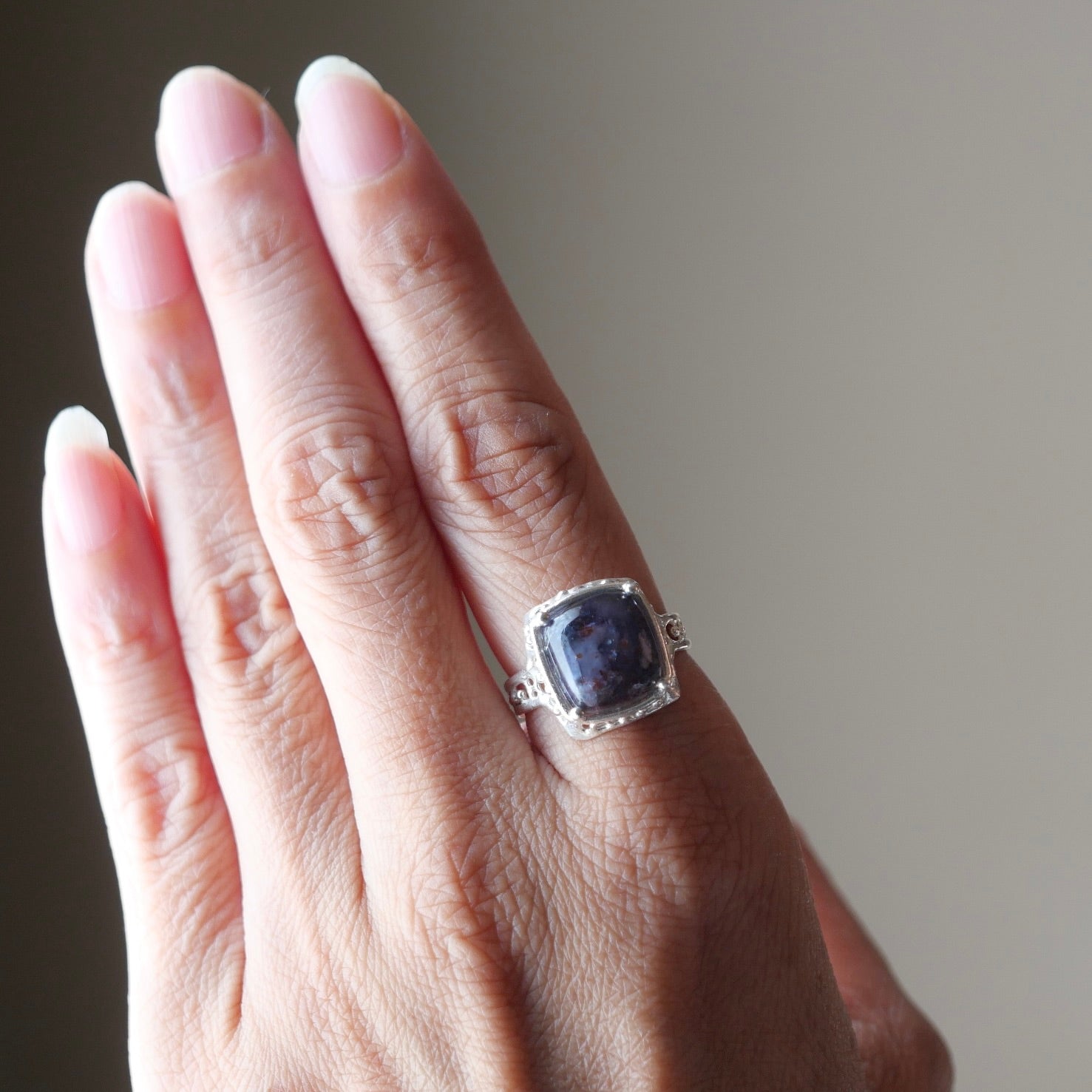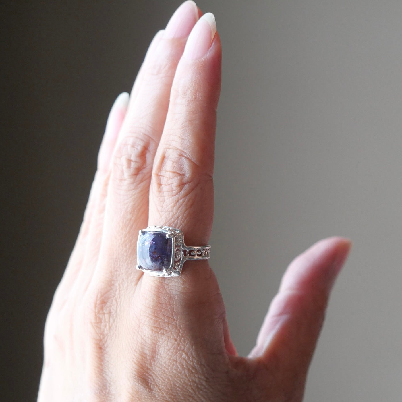 濃い紫の中に、虹色のラメが天然で入っている魅力的な石。光に当たるときらりとヒカリます。