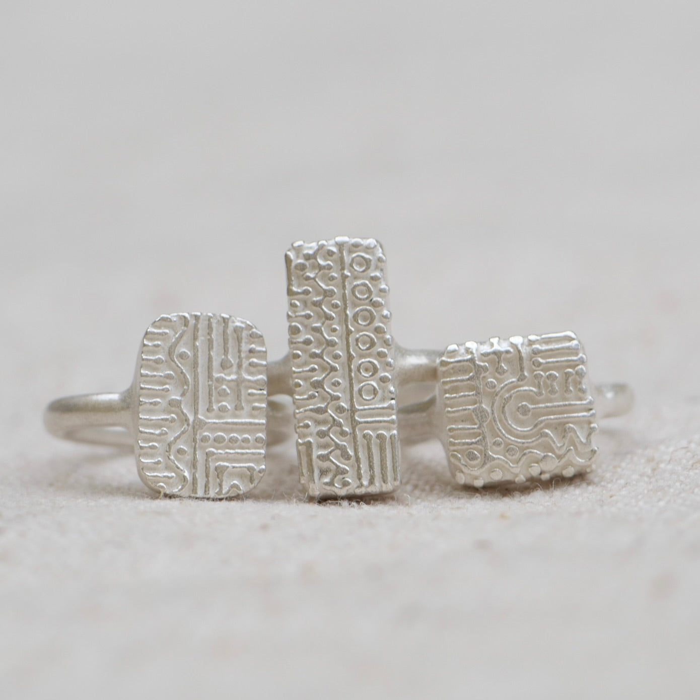 This is a series of silver rings with one of our favorite patterns from the IKOI workshop.
