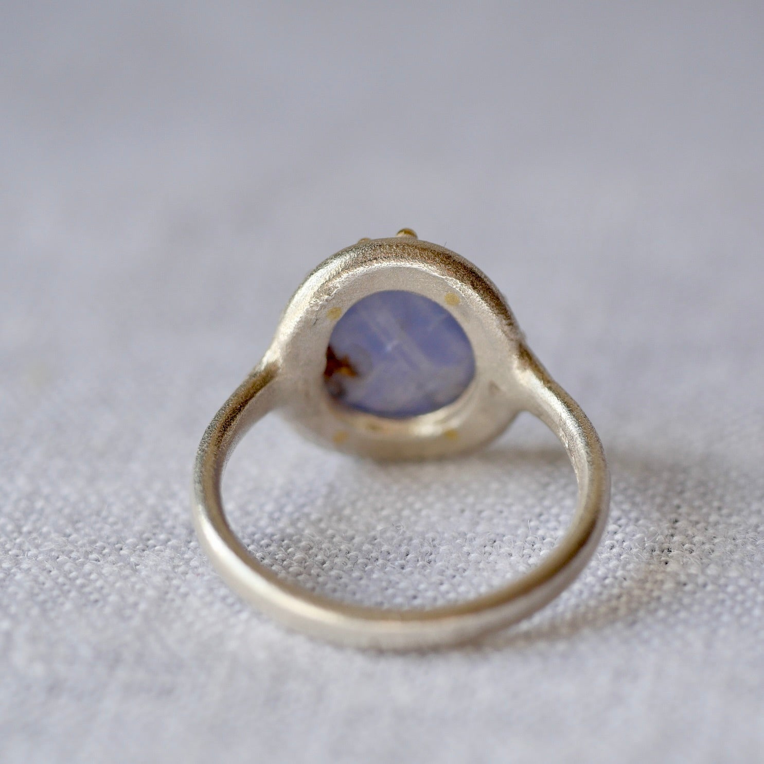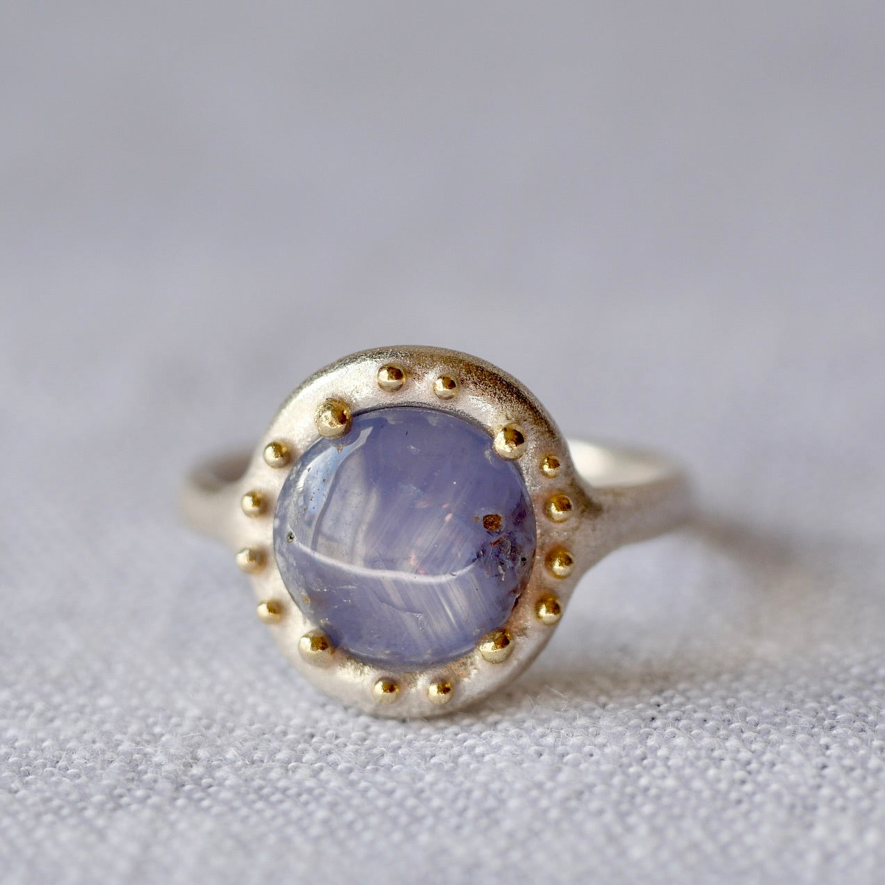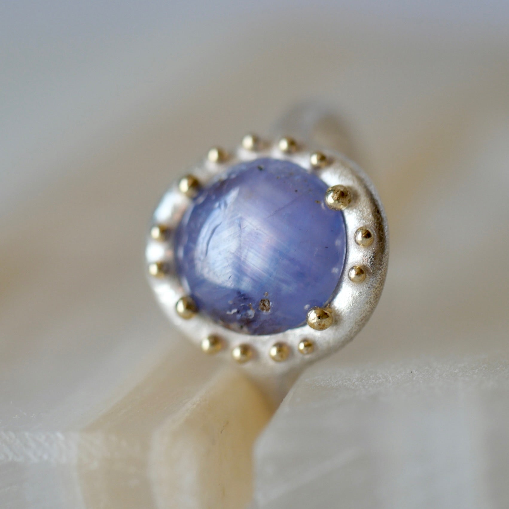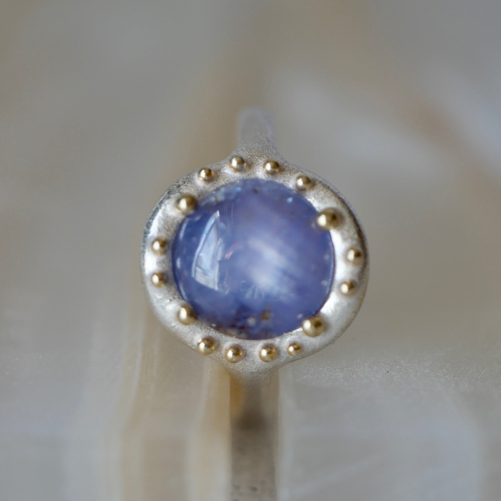 ゴールドの粒がアクセント。サファイヤのコランダムと薄いスターが入ったカボション。