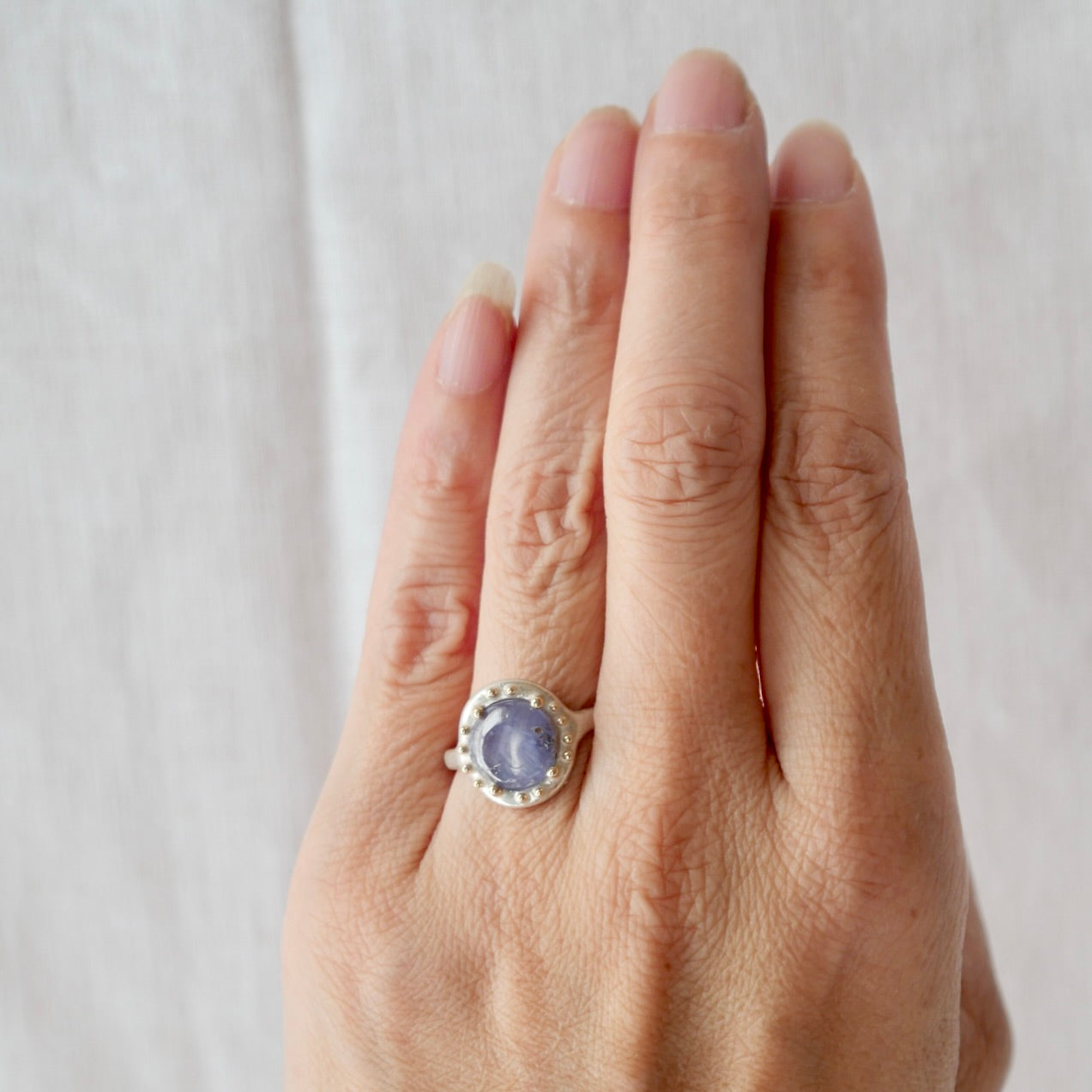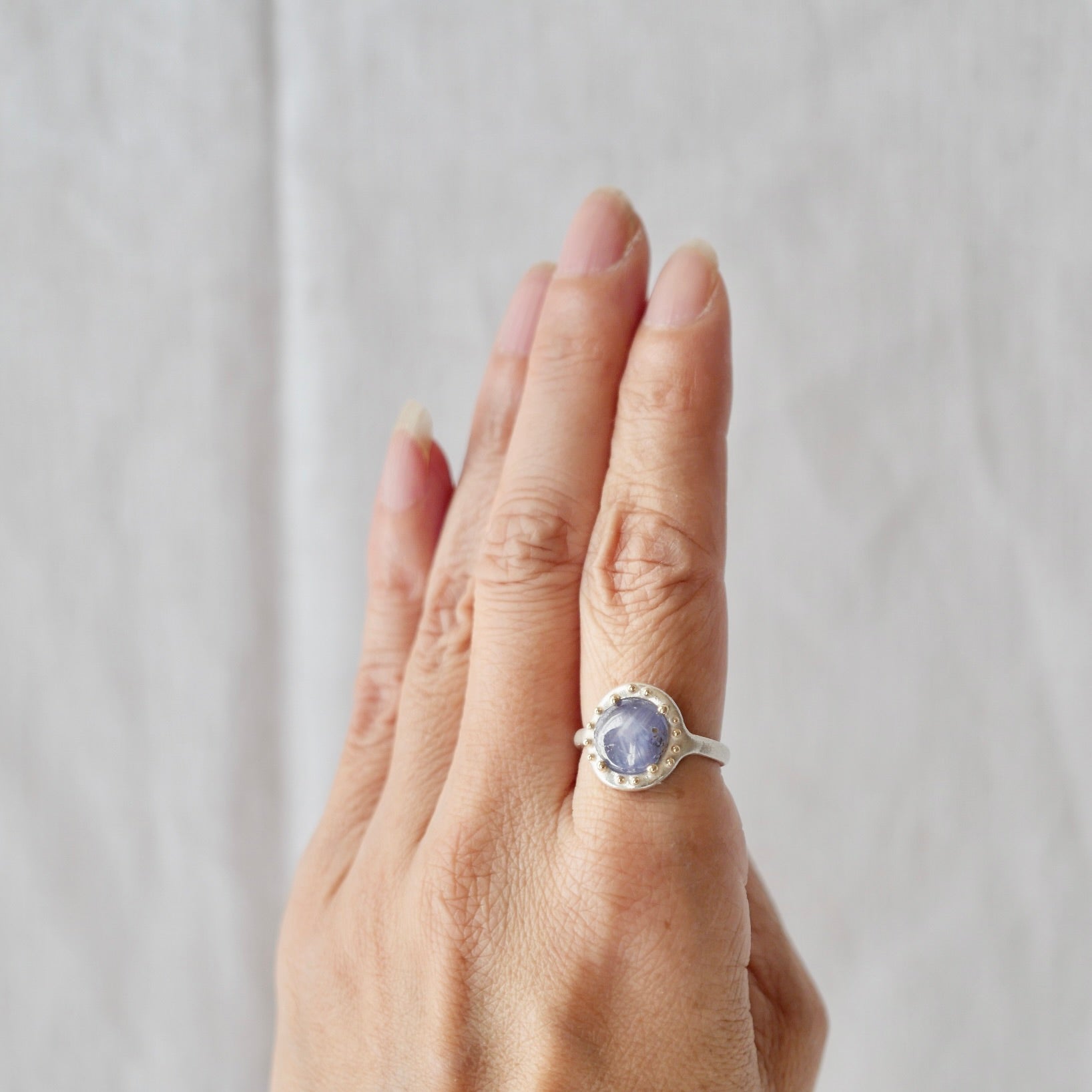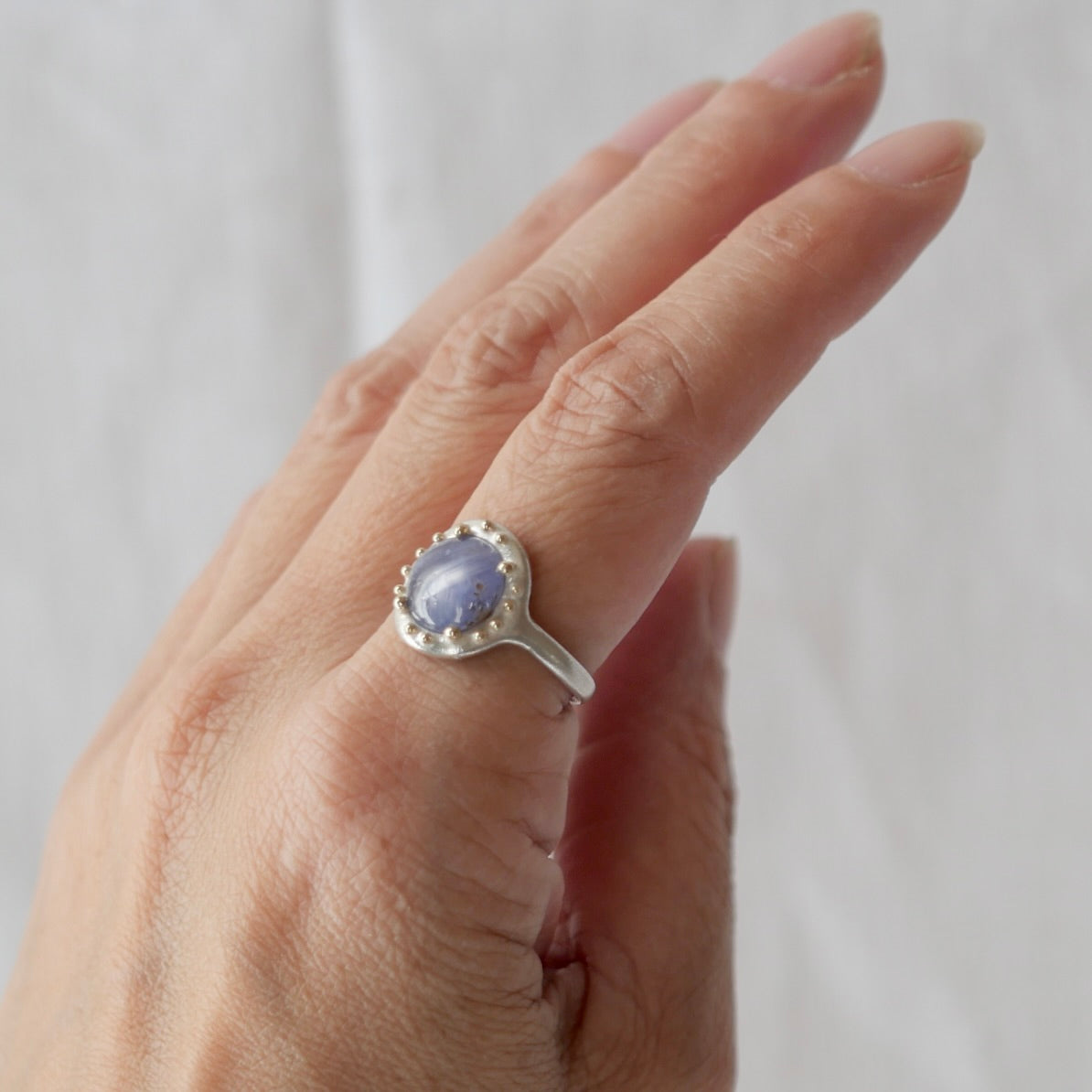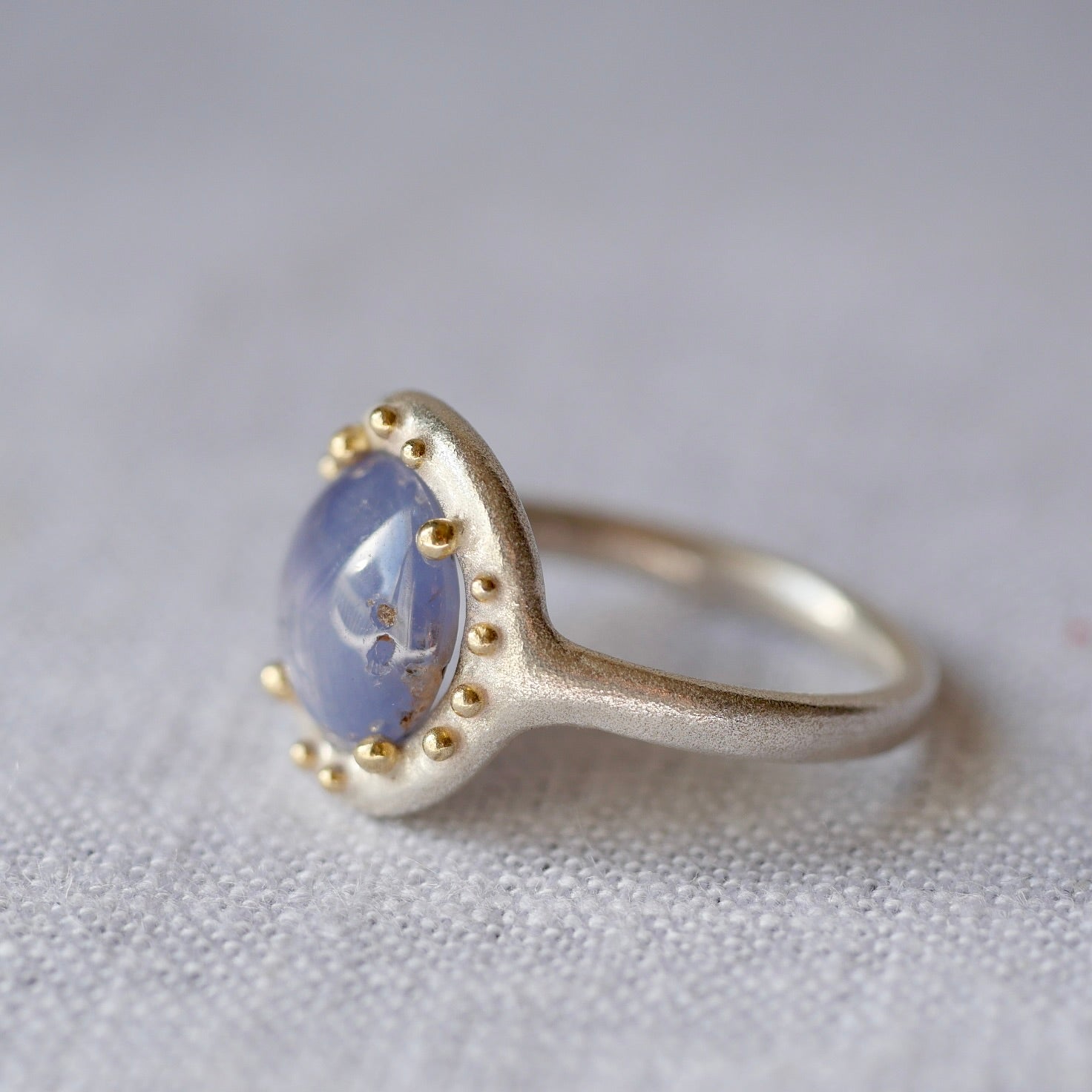 ゴールドの粒がアクセント。サファイヤのコランダムと薄いスターが入ったカボション。