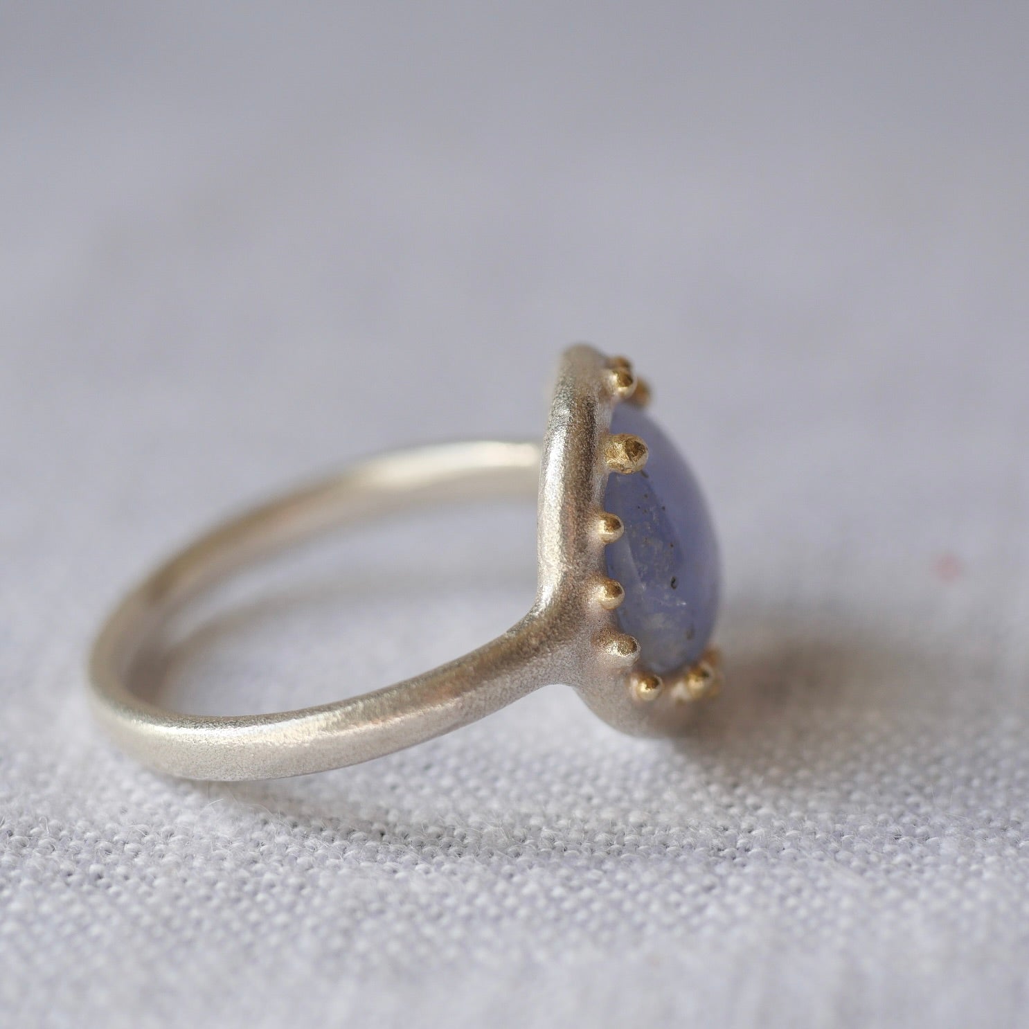 Accented with gold. Sapphire cabochon with corundum and pale stars.