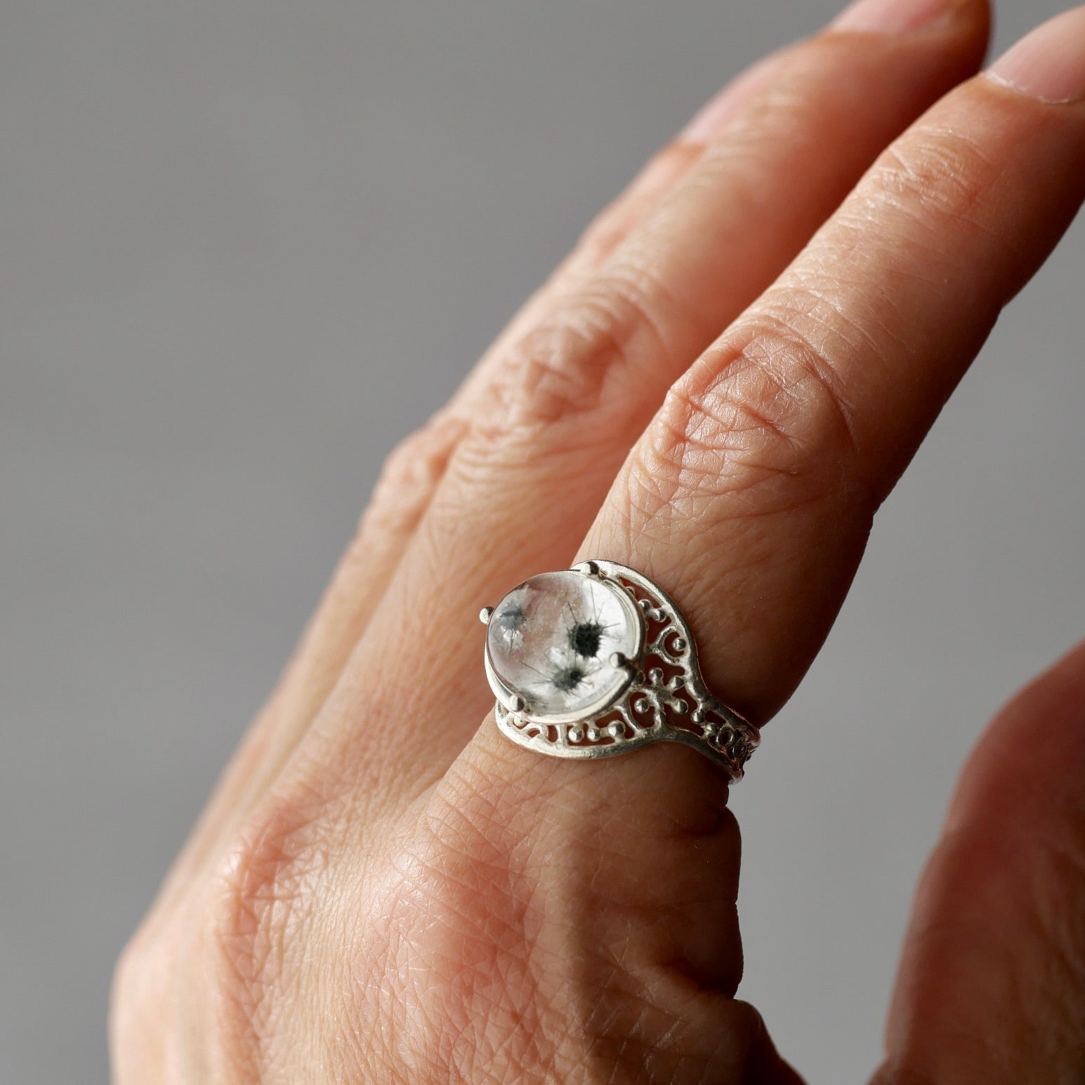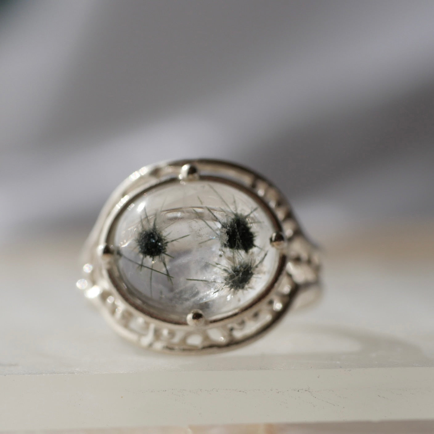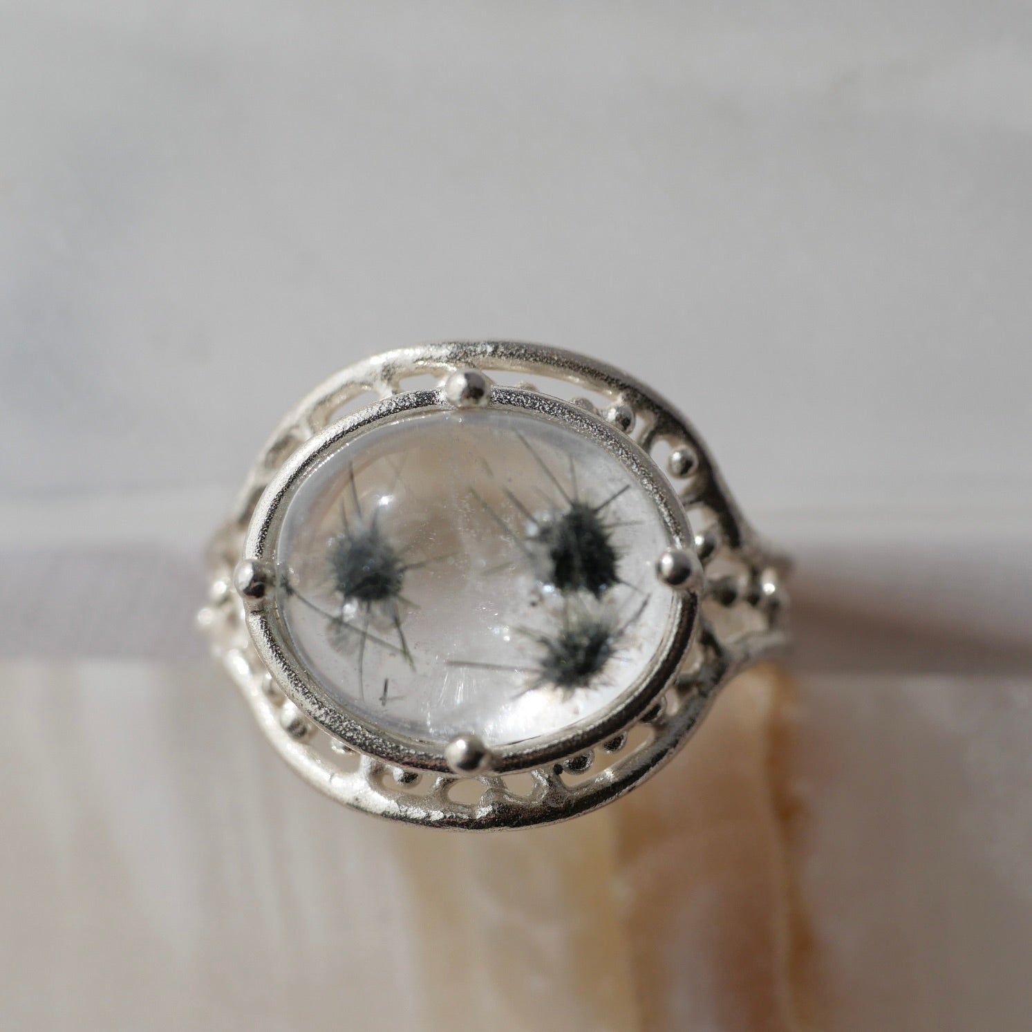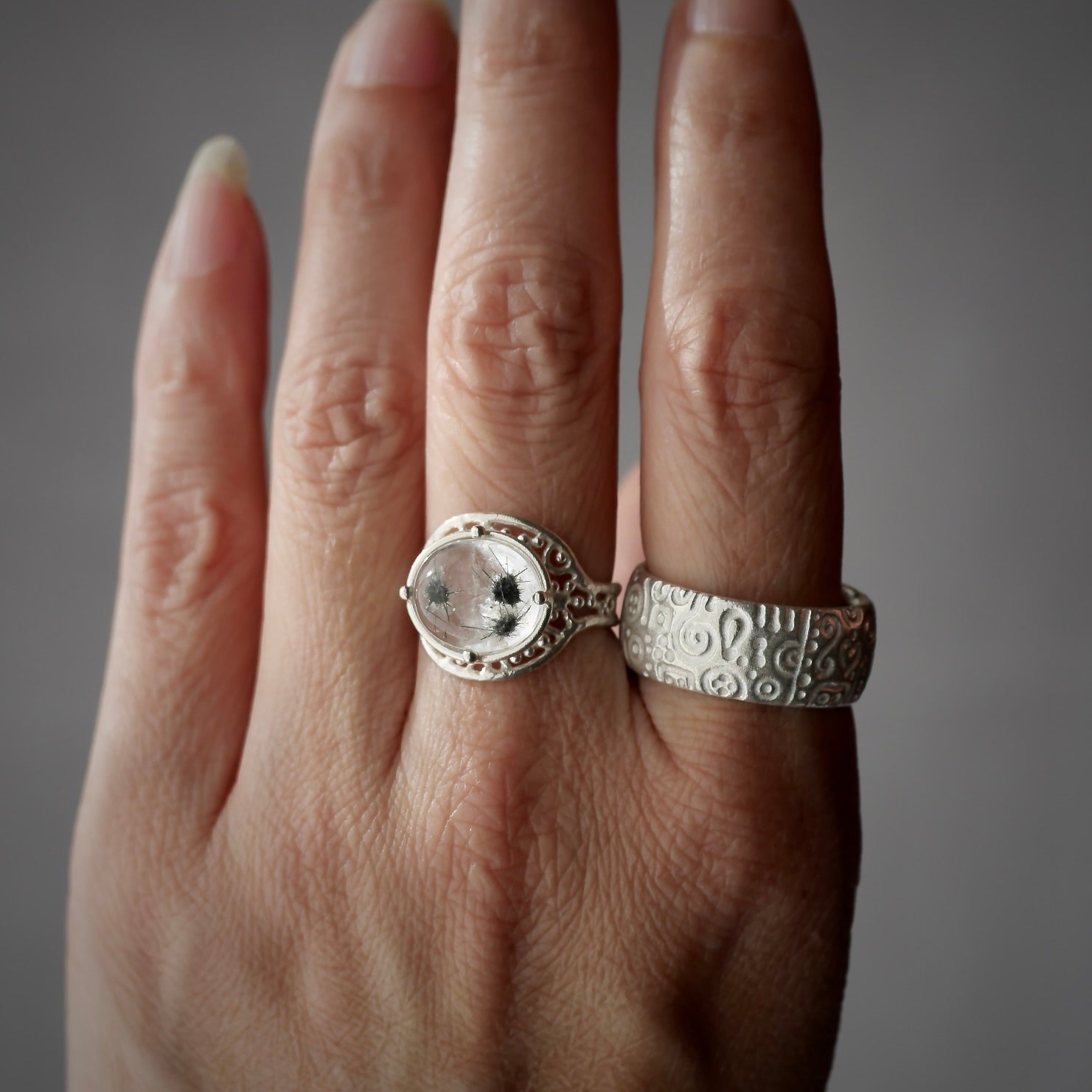 Silver ring of quartz crystal with hollandite, also known as star crystal.