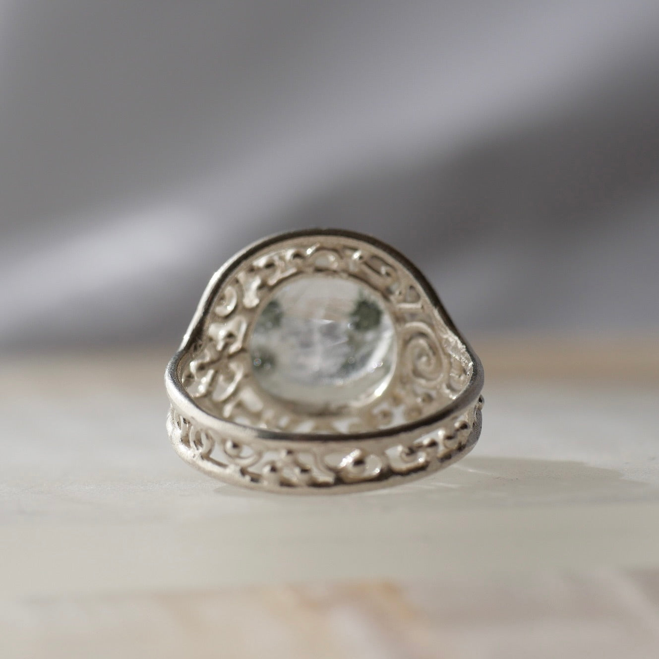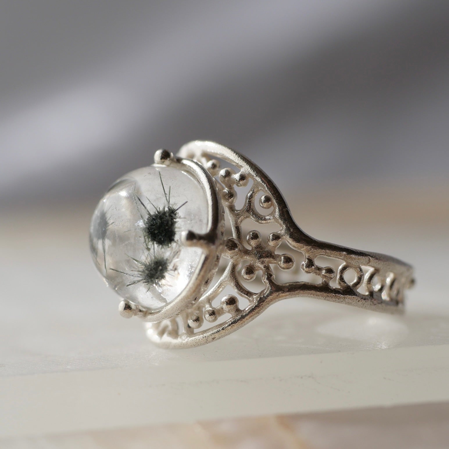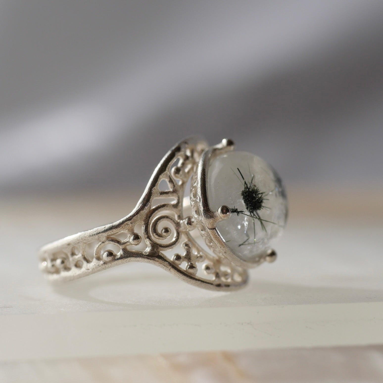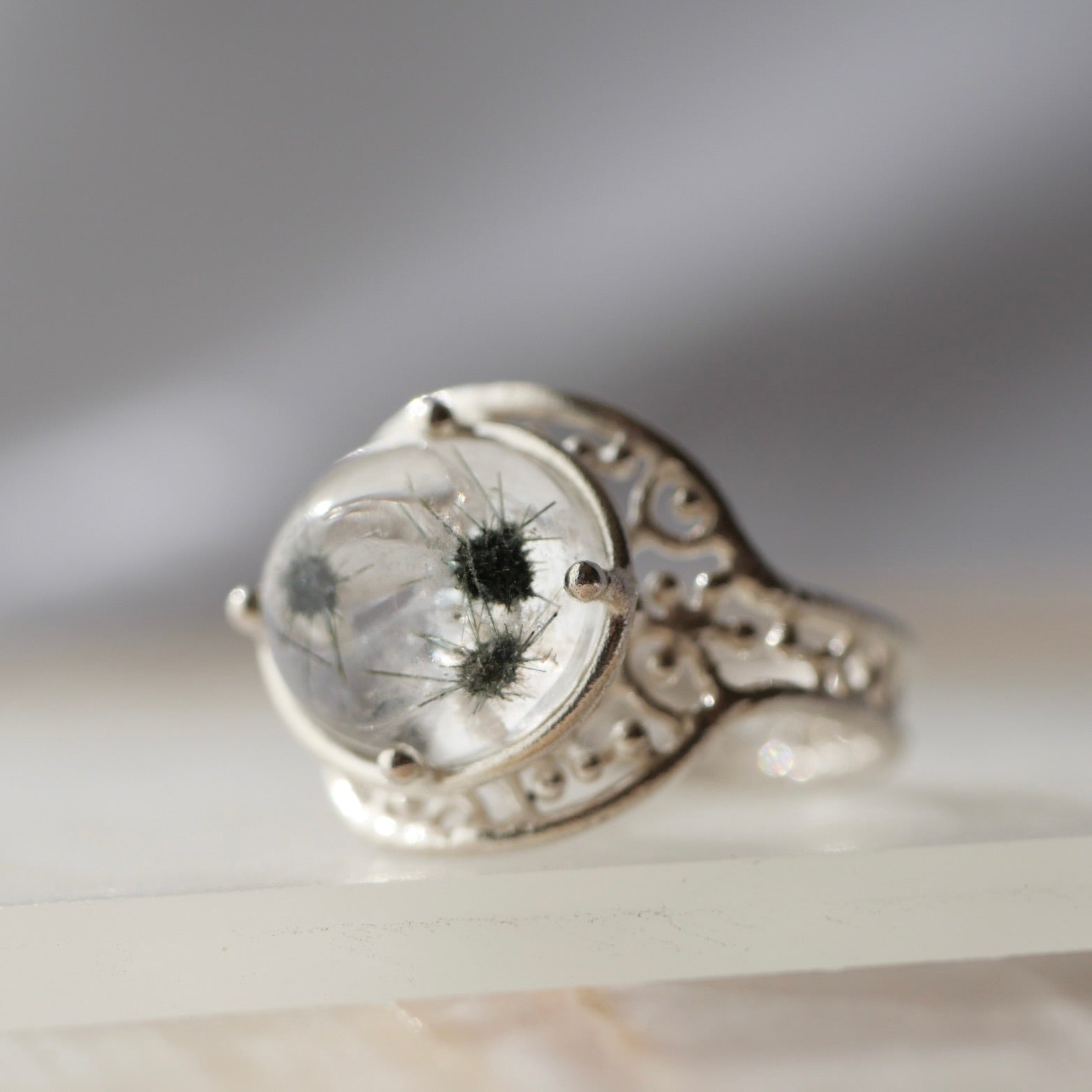 Silver ring of quartz crystal with hollandite, also known as star crystal.