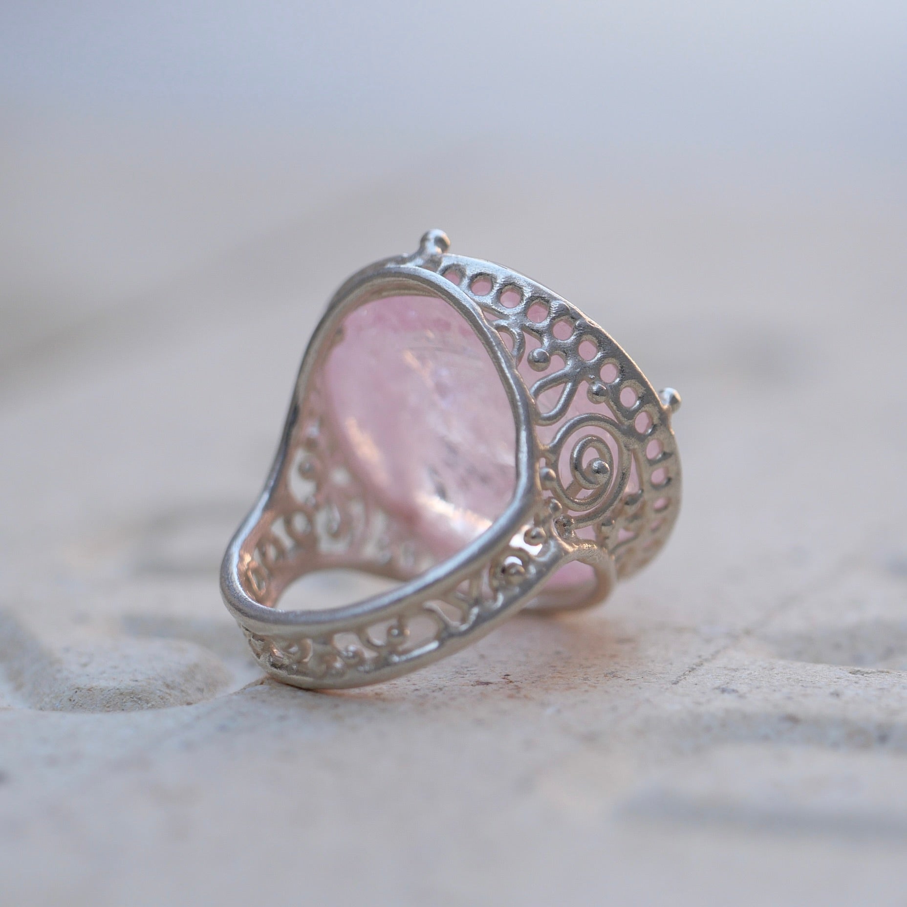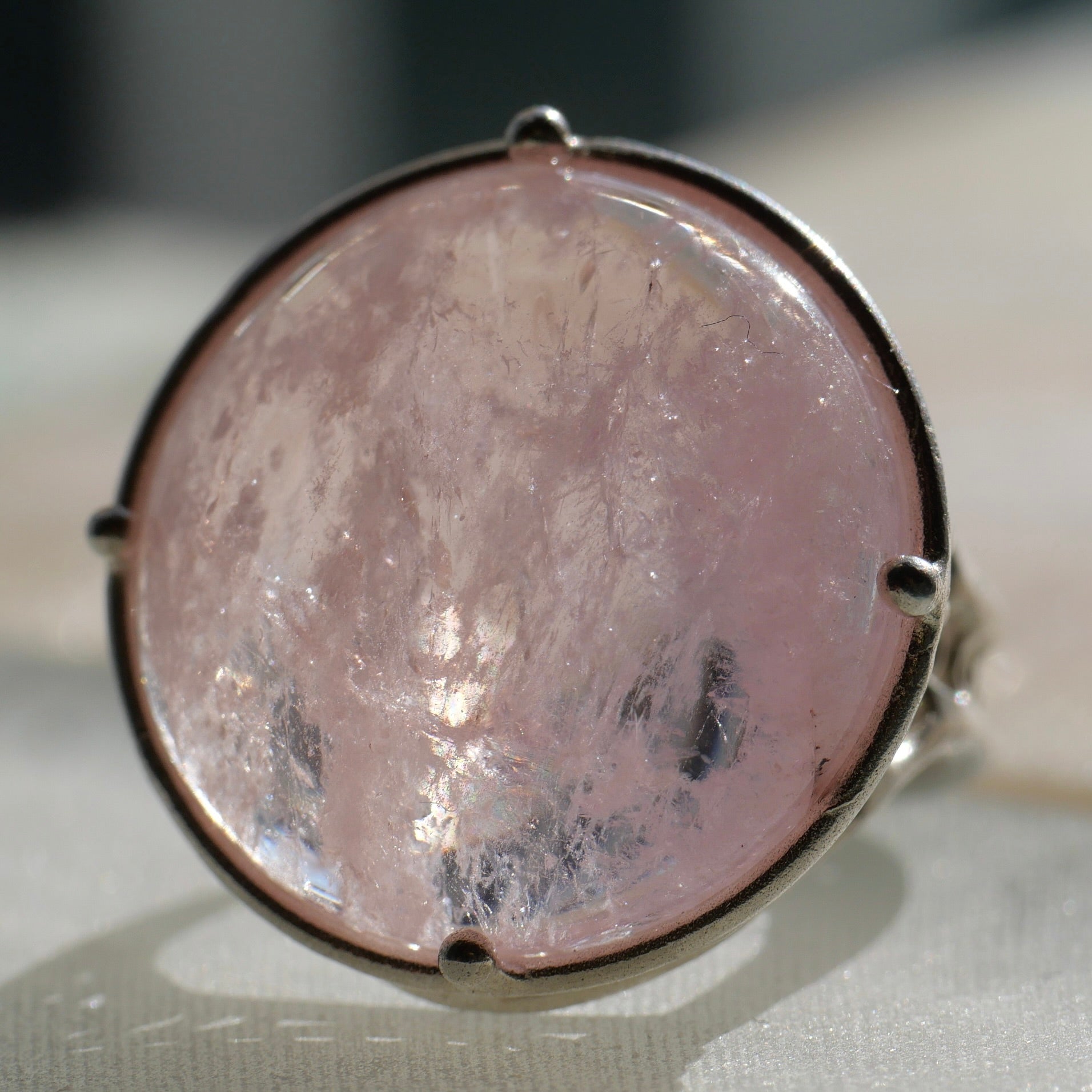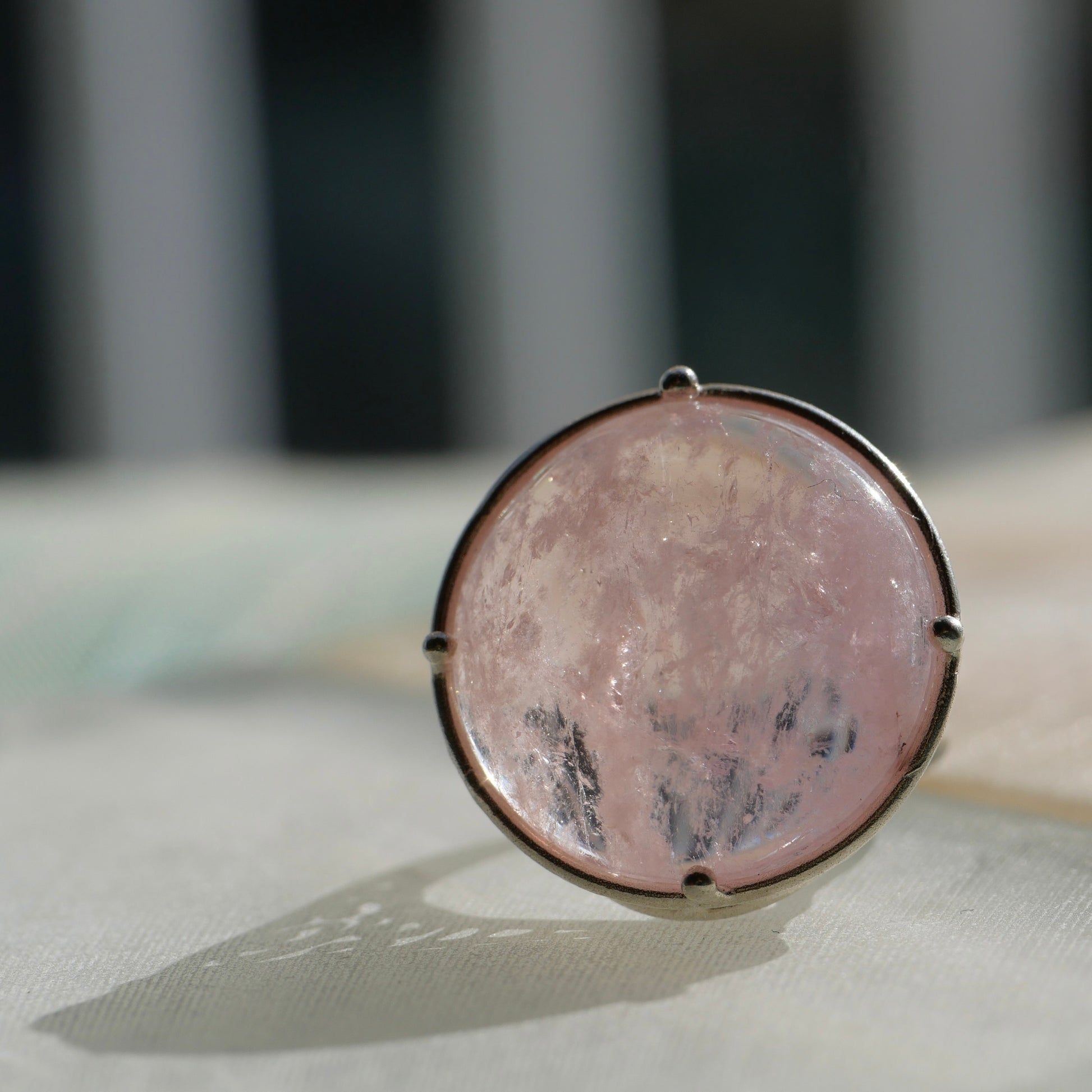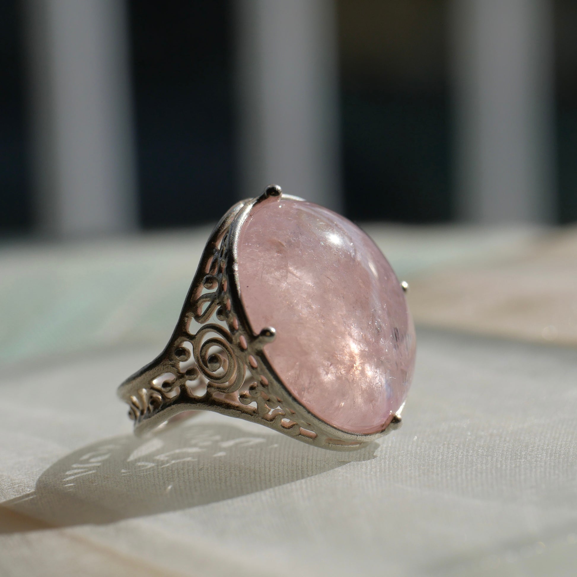 A beautiful and unique morganite with transparency. Designed to fit the finger perfectly, it feels comfortable to wear even with large stones.