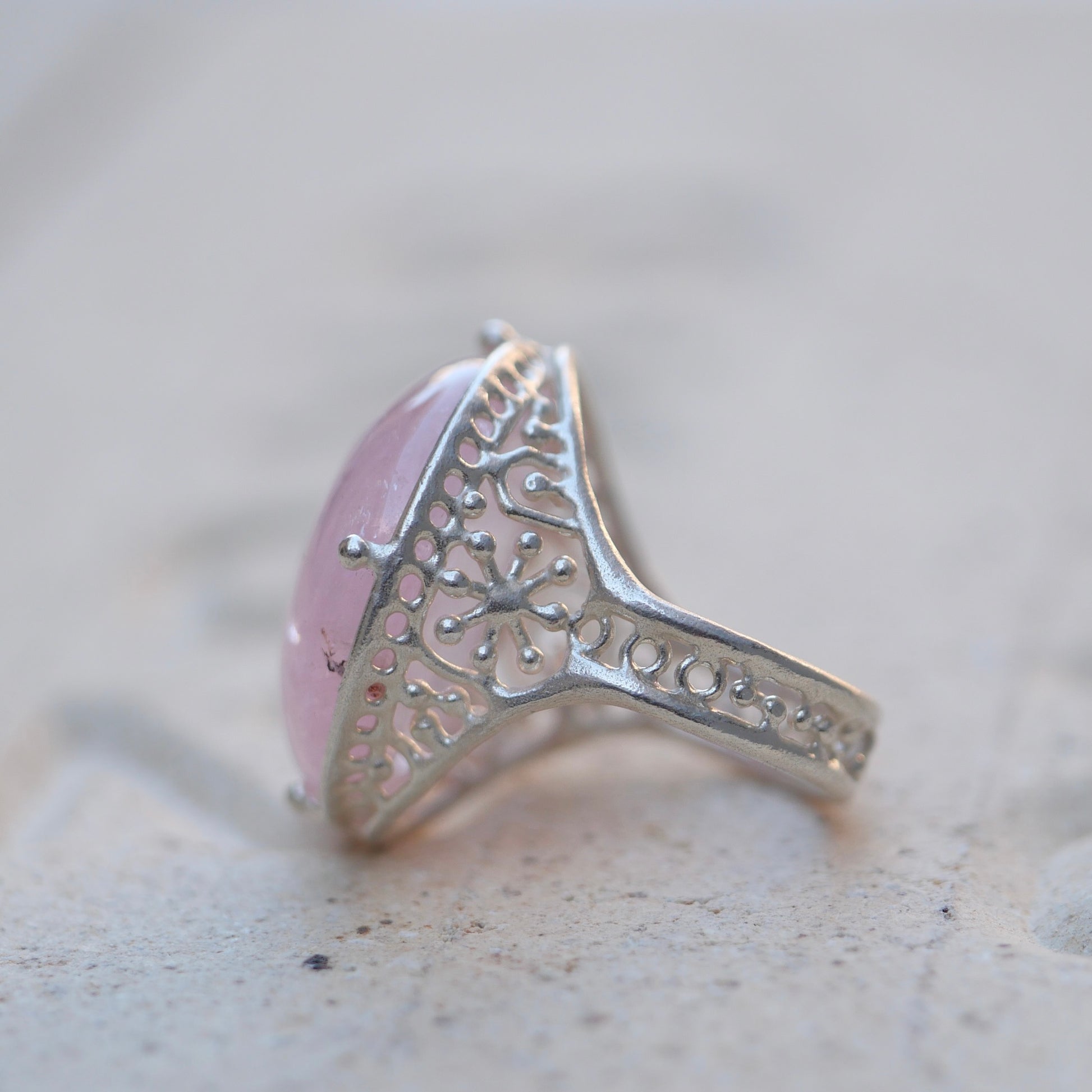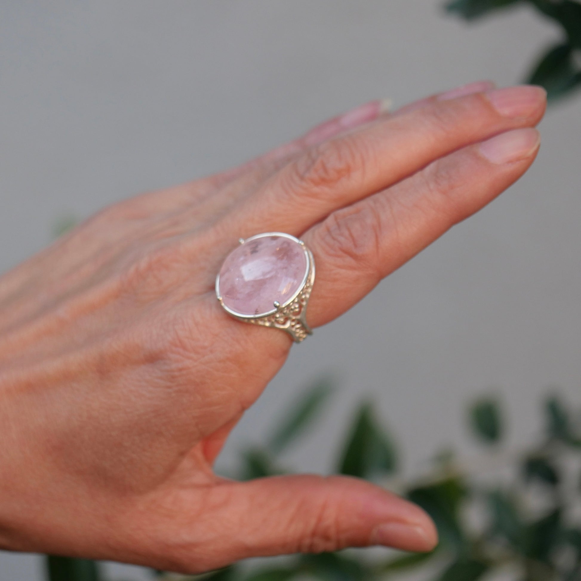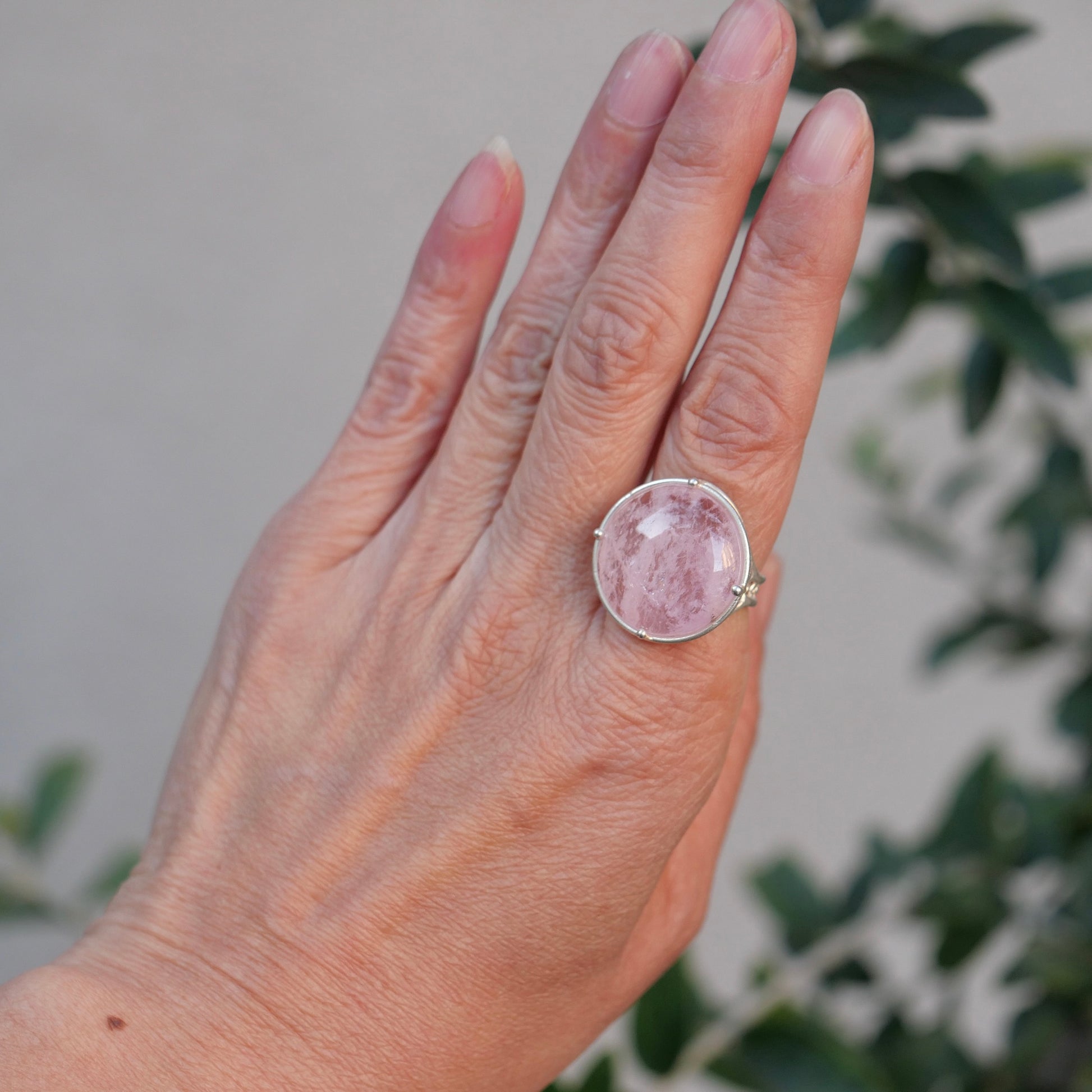 A beautiful and unique morganite with transparency. Designed to fit the finger perfectly, it feels comfortable to wear even with large stones.
