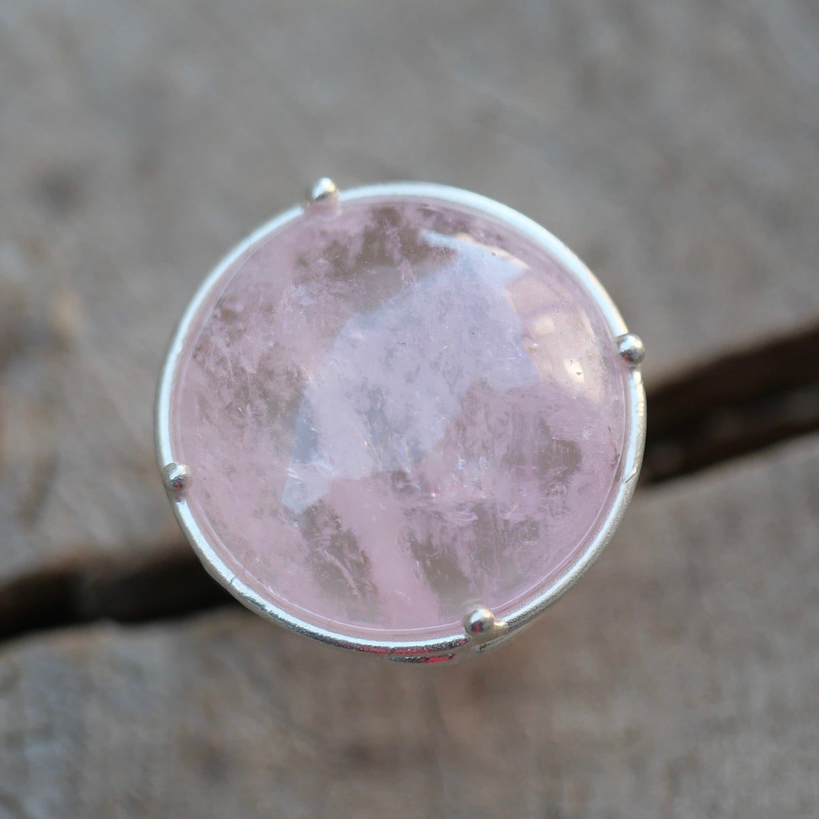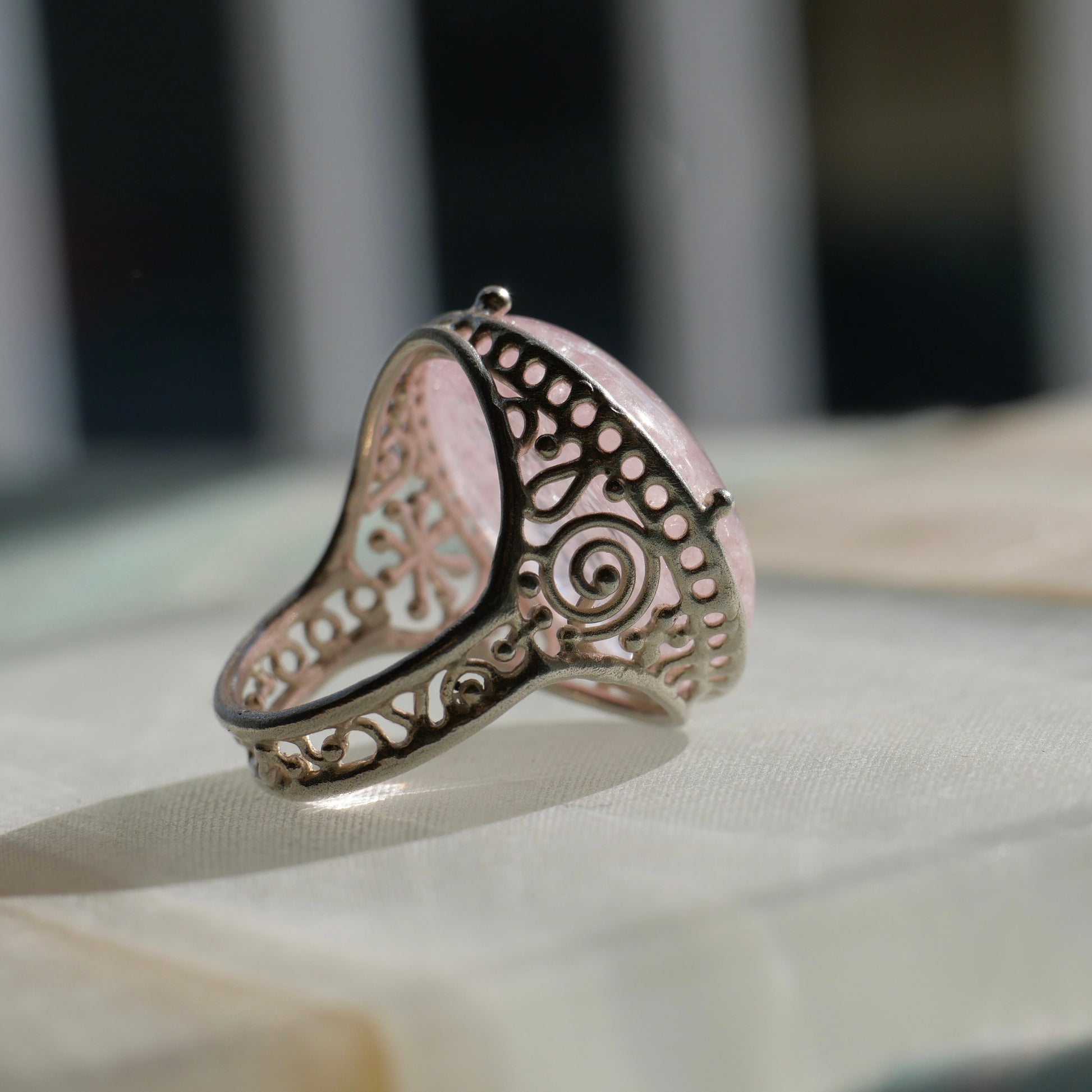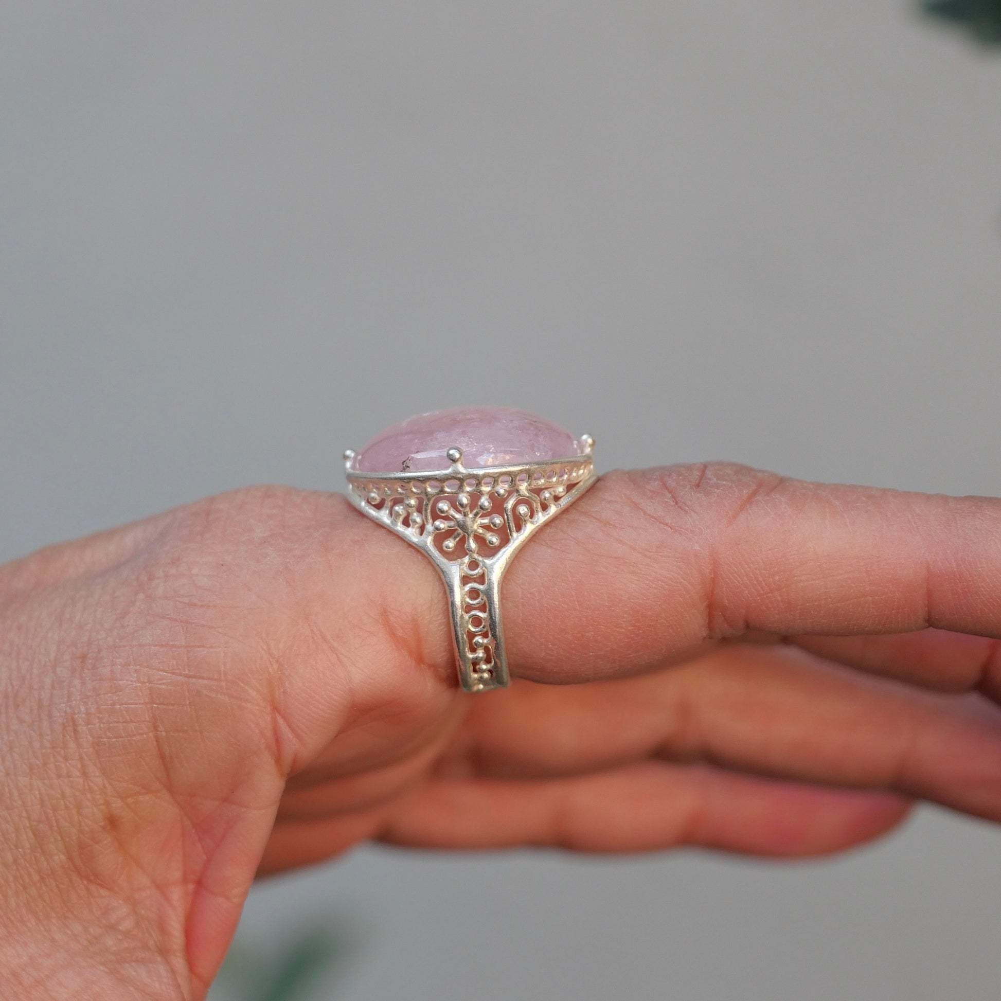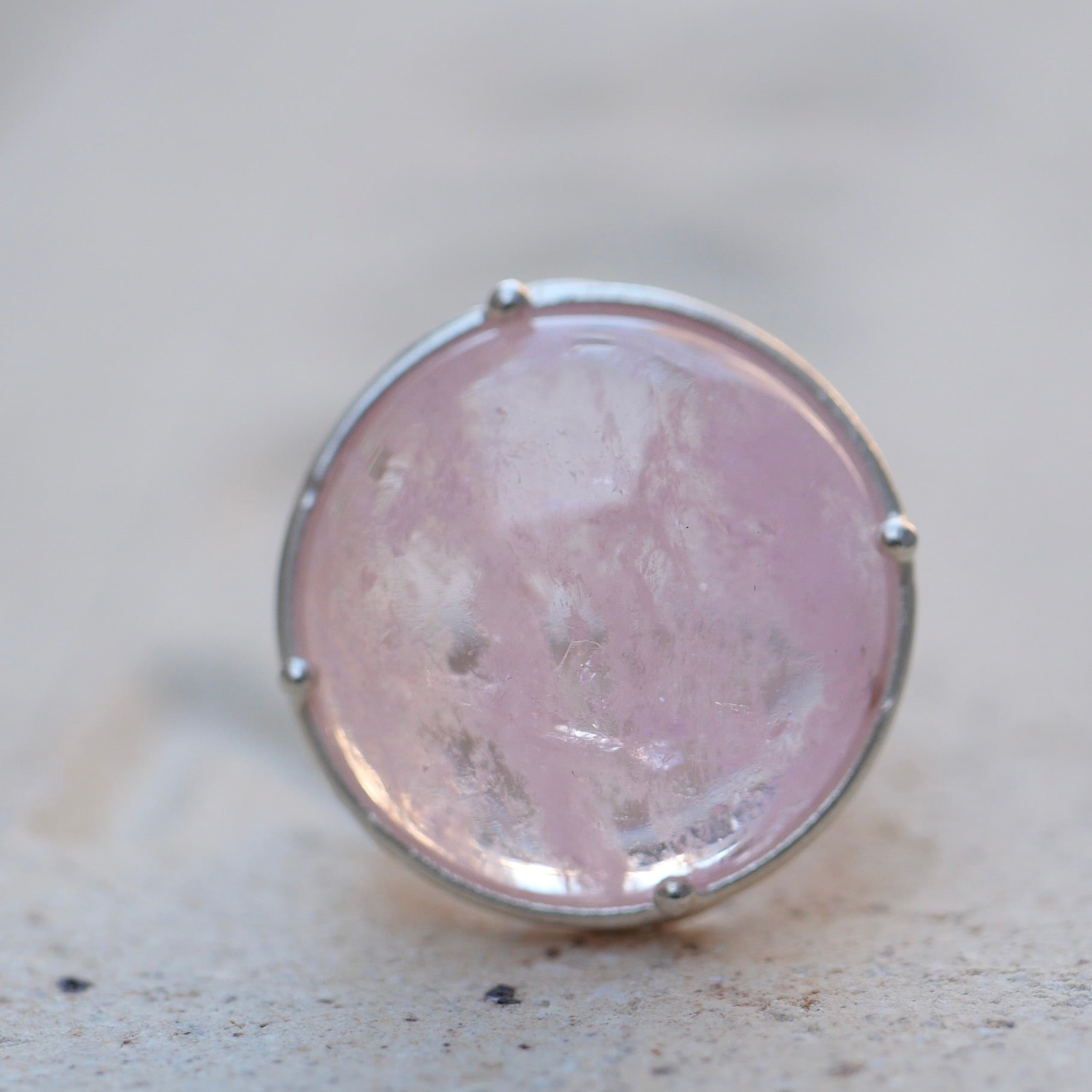 A beautiful and unique morganite with transparency. Designed to fit the finger perfectly, it feels comfortable to wear even with large stones.